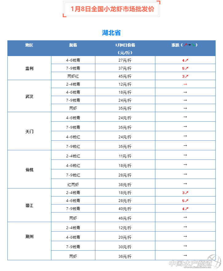 摘要: 中國水產(chǎn)頻道報道,1月8日全國小龍蝦市場批發(fā)價。