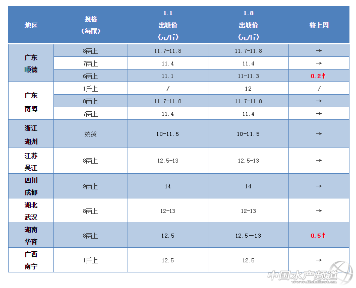 | 中國水產(chǎn)頻道原創(chuàng)報道, 各主產(chǎn)區(qū)加州鱸最新塘頭報價與行情一周簡析 文/圖 杰大飼料 水產(chǎn)前沿 賀志義 聯(lián)合發(fā)布 加州鱸行情走勢 一周行情綜述 加州鱸本周總體行情持續(xù)穩(wěn)定,以廣東佛山為代表的的七大主產(chǎn)區(qū)魚價基本與上周一致目前市場上加州鱸供需基本平衡,但是春節(jié)來臨,消費可能會有所增加,所以整體來說行情向好,持續(xù)看好后市魚價。 主產(chǎn)區(qū)行情簡析、報價 廣東順徳:今天報價6兩上11-11.3元/斤,7兩上11.4元/斤,8兩上11.7-11.8元/斤,6兩上基本是養(yǎng)殖戶清塘?xí)r才出售這個規(guī)格,價格根據(jù)實際規(guī)格定價,本周大規(guī)格魚市場需求量比上周略所增加,部分養(yǎng)殖戶持觀望心理看好春節(jié)前魚價,建議養(yǎng)殖戶根據(jù)自身實際情況合理安排出魚。 廣東南海:今天報價7兩上11.4元/斤左右,8兩上11.7-11.8,1斤上12元/斤,沙頭區(qū)域部分養(yǎng)殖戶選擇出大規(guī)格魚以提高賣價,大部分的人惜售心理明顯,外省魚車收魚有所增多,本周大規(guī)格魚更受流通商偏愛,價格比較理想。 浙江湖州:菱湖地區(qū)統(tǒng)貨和條子的價格維持不變,統(tǒng)貨10-11.5/斤,統(tǒng)貨8兩上的層次每加一價格增加0.1-0.3元/斤;8兩上價格為12元/斤,比廣東地區(qū)每斤高出0.2-0.3元,根據(jù)炮頭大小可能上下浮動0.2-0.3元/斤。 江蘇吳江:8兩上報價12.5-13元/斤,價格與上周保持一致。據(jù)某業(yè)內(nèi)人士反映,由于環(huán)保原因,吳江環(huán)太湖周邊的養(yǎng)殖區(qū)年底塘租到期,即將被征收,所以目前有部分小規(guī)格魚也在出售。 四川成都:9兩上加州鱸報價14元/斤,魚價本周無較大波動。目前當(dāng)?shù)仞B(yǎng)殖戶出魚積極性并不高,只有少量養(yǎng)殖戶賣魚,大部分養(yǎng)殖戶看好春節(jié)價格,惜售心理明顯。 湖北武漢:今天報價12-13元/斤,價格與上周保持一致。本地存魚量較少,加上魚價未達(dá)心理預(yù)期,養(yǎng)殖戶出魚積極性也不高。前些天武漢關(guān)閉華南海鮮批發(fā)市場,是否對加州鱸的消費產(chǎn)生影響,歡迎大家積極留言。 湖南華容:8兩上報價12.5—13元/斤左右,上漲0.5元/斤左右。目前大規(guī)格的魚比較缺乏,而且存量不多,大規(guī)格可以賣出好價錢,當(dāng)?shù)仞B(yǎng)殖戶出魚積極性一般,有較多人看好春節(jié)前魚價,目前有部分流通商前往廣東抓魚。 廣西南寧:1斤上報價12.5/斤左右,魚價繼續(xù)保持穩(wěn)定。當(dāng)?shù)剡_(dá)到上市標(biāo)準(zhǔn)的加州鱸量較少,一部分流通商已經(jīng)前往到廣東抓魚,為春節(jié)市場做準(zhǔn)備,魚價有望小幅上漲。 |