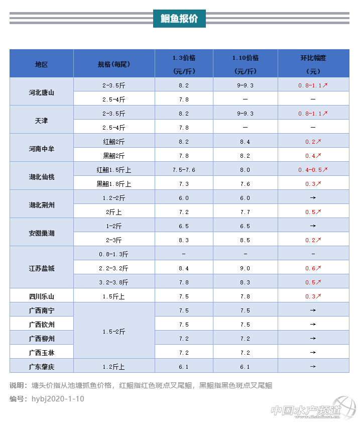 | 中國水產頻道原創(chuàng)報道, 本周多地區(qū)鮰魚漲價,中美協議或能增加未來出口量 文/ 水產前沿 葉豐齊 水產前沿專業(yè)為你推送鮰魚 最新價格行情及行業(yè)新聞、各類資訊。 同時歡迎行業(yè)人士踴躍爆料,請掃二維碼聯系。 各產區(qū)鮰魚行情走勢 鮰魚要聞 1.中美雙方擬于下周簽署第一階段協議,貿易戰(zhàn)以來增加的出口關稅或將得以調整,鮰魚出口量可能增加; 2、河北和天津地區(qū)鮰魚價格出現亂象,最高漲1.1元/斤; 3.河南如今氣溫較低,如果不能清塘,拉網易傷魚造成損失,整體出魚量不多; 4.江蘇走北京市場鮰魚因囤貨量少已經漲到9元/斤; 5.安徽加工廠偏好大規(guī)格鮰魚,2-3斤規(guī)格本周繼續(xù)上調0.2元/斤。 整體行情綜述 本周多地區(qū)鮰魚漲價:河北唐山和天津地區(qū)鮰魚價格目前較亂,2斤以上規(guī)格9-9.3元/斤;河南地區(qū)紅鮰魚價8.4元/斤,依然較8.2元/斤的黑鮰稍高;湖北仙桃1.5斤以上規(guī)格紅鮰較上周漲0.4-0.5元/斤,1.8斤以上規(guī)格黑鮰7.6元/斤;荊州地區(qū)2斤以上規(guī)格鮰魚出魚較多,較上周上漲0.5元/斤;安徽巢湖加工廠依然偏愛2-3斤大規(guī)格,本周魚價上調0.2元/斤;四川樂山地區(qū)本周少量出魚,環(huán)比上周上漲0.3元/斤;廣西地區(qū)大多數存塘魚未到出魚規(guī)格,行情暫時不變;廣東地區(qū)拉魚車不少,但存塘仍較多,價格穩(wěn)定。 各產地行情分析 河北唐山和天津地區(qū):主要出2-3.5斤的北京規(guī)格和走唐山本地以及秦皇島、沈陽的2.5-4斤規(guī)格黑鮰;不過目前存魚不多,天氣寒冷養(yǎng)戶出魚甚少,外塘基本沒有,僅溫棚零星出魚,市場主要靠外地貨源支撐;本周2-3.5斤規(guī)格黑鮰價格呈現亂象,約9-9.3元/斤,環(huán)比上周暴漲0.8-1.1元/斤。 河南地區(qū):中牟市出2斤左右規(guī)格鮰魚,水車走市場;當地鮰魚整體出魚量不多,陸陸續(xù)續(xù)出;因氣溫較低,如果不能清塘,拉網易傷魚造成損失;目前紅鮰價格依然稍高于黑鮰,因為其養(yǎng)殖成本相對較高,養(yǎng)殖量稀少;本周紅鮰8.4元/斤,環(huán)比上周上漲0.2元/斤,黑鮰8.2元/斤,環(huán)比上周上漲0.4元/斤。 湖北地區(qū):仙桃市養(yǎng)殖量比較稀少的1.5斤以上規(guī)格紅鮰塘頭價8元/斤,環(huán)比上周上漲0.4-0.5元/斤;1.8斤以上規(guī)格黑鮰7.6元/斤,環(huán)比上周上漲0.3元/斤,業(yè)者預計下周還會繼續(xù)漲價;荊州市黑鮰1.2-2斤規(guī)格塘頭價6元/斤,同上周價格,2斤以上規(guī)格本周出魚較多,約7.7元/斤,環(huán)比上周上漲0.5元/斤。 安徽地區(qū):當地存塘魚仍較多,巢湖加工廠收1-3斤規(guī)格的黑鮰,80%鮰魚加工品內銷,以北京、上海和廣州為主要終端市場;因目前市場偏愛大規(guī)格,小規(guī)格訂單量減少,1-2斤規(guī)格6.5元/斤,同上周價格,2-3斤規(guī)格8.5元/斤,環(huán)比上周上漲0.2元/斤。 江蘇地區(qū):根據消費市場,鹽城黑鮰有3種規(guī)格:走成都市場的0.8-1.3斤規(guī)格今年基本沒有出貨;走北京、山東市場的2.2-3.2斤(平均2.5-2.6斤)規(guī)格因囤貨量少,本周出魚量不大,約9元/斤,環(huán)比上周上漲0.6元/斤;走甘肅、新疆、西藏、廣西的3.2-3.8斤(平均3.5-3.6斤)規(guī)格,約8.3元/斤,環(huán)比上周上漲0.5元/斤;業(yè)內人士認為魚價還會繼續(xù)上漲,下周出魚量應會較多。 四川地區(qū):畝產3000斤左右的樂山出1.5斤以上規(guī)格黑鮰,因目前存魚量不多,為避免低溫抓捕傷魚,出魚量甚少;本周魚價約7.8元/斤,環(huán)比上周上漲0.3元/斤;業(yè)者認為春節(jié)前一周價格會再上漲一些,部分養(yǎng)戶或將清塘出魚。 廣西地區(qū):本地消費需求并非特別大,價格較為穩(wěn)定;南寧、柳州、欽州、玉林抓1.5-2斤規(guī)格紅鮰、黑鮰,以體色深者優(yōu)先;南寧和欽州塘頭價約7.5元/斤,同上周,柳州和玉林約7.2元/斤,同上周;目前存塘以2019年魚為主,0.5-0.8斤規(guī)格較多,預計今年4-5月才會大量出魚。 廣東地區(qū):以水車走市場為主,只有少量進加工廠,訂單較少;中山、珠海、廣州、順德、肇慶等地區(qū),1.2斤以上規(guī)格走市場黑鮰塘頭價約6.1元/斤,同上周;據了解,拉魚水車不少,但目前存魚量仍較大,價格暫時穩(wěn)定。 |