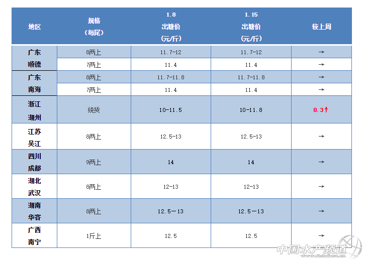 | 中國水產頻道原創報道, 各主產區加州鱸最新塘頭報價與行情一周簡析 文/圖 杰大飼料 水產前沿 賀志義 聯合發布 加州鱸行情走勢 一周行情綜述 加州鱸本周總體行穩中有漲,浙江湖州大規格魚價格率先上漲0.3元/斤,廣東佛山價格基本與上周持平,但是養殖戶出魚積極性有明顯提升,走貨量明顯增加。春節臨近,消費需求有所增加,多地流通商前來抓魚,大規格魚更受歡迎,繼續看好后市魚價。 主產區行情簡析、報價 廣東順徳:今天報價7兩上11.4元/斤,8兩上11.7-12元/斤,大規格魚按實際上車規格發價,與上周價格保持一致,實際價格根據上車規格有所浮動。臨近春節,市場需求量增加,近幾天收魚量開始增大,外省魚車明顯增多,養戶可根據自身實際情況安排出魚。 廣東南海:7兩上11.4元/斤,8兩上11.7-11.8元/斤,1斤上12元/斤,價格與上周持平,實際塘頭價根據魚的大小有所浮動。隨著春節假期到來帶動消費增加,本地出魚的養殖戶有所增多,出魚積極性高,市場行情比較好。 浙江湖州:統貨10-11.8元/斤,但主要收8兩上占比7成以上的,價格為11-11.8元/斤,大規格的魚略有上漲,統貨9成8兩上的最高可以達到11.8元/斤,市場上更加需求大規格的魚,小規格目前相對比較難銷售。 江蘇吳江:8兩上報價12.5-13元/斤,價格與上周保持一致。本地大規格魚并不多,再加上臨近春節,部分養殖戶保持觀望,看好年前價格或者等年后再賣。 四川成都:今天報價8兩上13元/斤,9兩上14元/斤,魚價與上周持平,本周出魚的養殖戶積極性有所提高,臨近春節收魚量明顯增加。 湖北武漢:今天報價12-13元/斤,價格與上周保持一致。本地存塘魚大規格的不多,市場主要依靠外省貨源。 湖南華容:今天報價12.5—13元/斤,當地大規格較少,且廣東魚價有優勢,部分流通商已經南下抓魚。此外,部分養殖戶已經清塘并完成溫棚搭建,等待合適時機放苗。 廣西南寧:1斤上報價12.5/斤左右,魚價繼續保持穩定。當地大規格不多,且養殖戶出魚積極性一般,為滿足市場需求,部分流通商已經前往廣東抓魚,當地后市魚價看漲。 |
