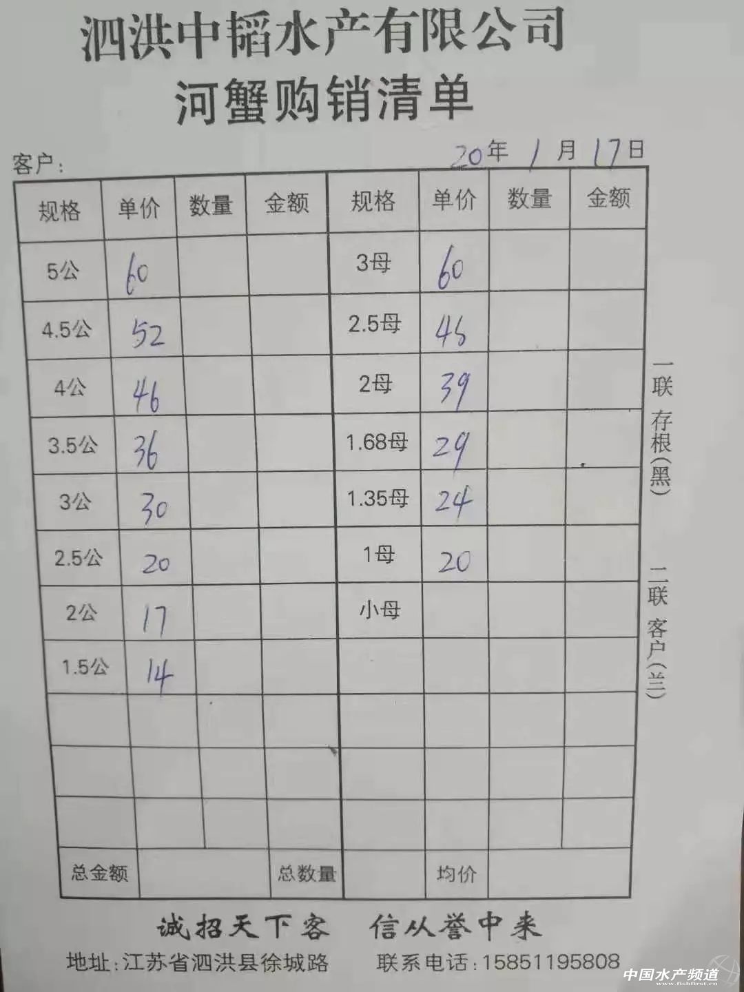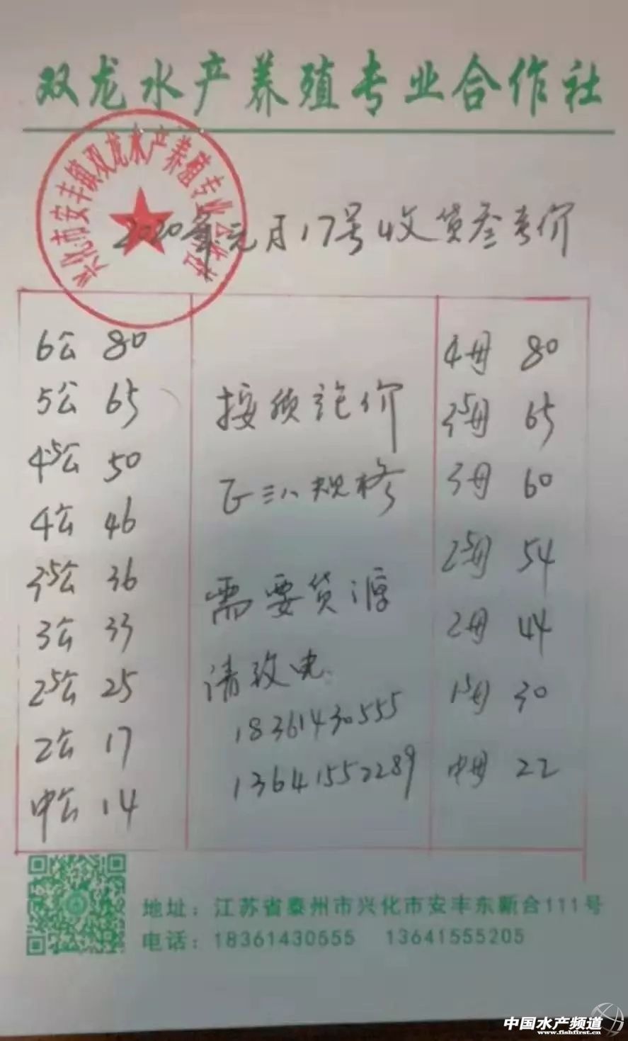 | 中國水產頻道原創(chuàng)報道, 扣蟹參考價 高淳 水陽 盤錦 成蟹行情解析 高淳 近期高淳精品蟹價持續(xù)上漲,今天蟹價整體大漲,平均蟹價漲5元/斤,各規(guī)格蟹價漲2-15元/斤不等。其中,4母漲15元/斤,漲幅最大;5公、3.5母均漲10元/斤,2母、3公均漲4元/斤。 興化 近期興化普蟹價格持續(xù)攀升,1月12日平均蟹價為26.6元/斤,今天平均蟹價45.1元/斤,上漲近70%。春節(jié)臨近,物流緊張,近期各地備貨增多,拉動蟹價持續(xù)上漲。 成蟹參考價 高淳 此報價由高淳倪老板提供 興化 此報價由興化丁老板提供 泗洪 此報價由泗洪孫老板提供 泗洪 此報價由無錫王老板提供 |