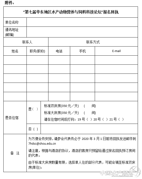 | 中國水產頻道報道, 第七屆華東地區水產動物營養與飼料科技論壇 第二輪通知 “第七屆華東地區水產動物營養與飼料科技論壇”將于2020年3月在上海舉辦。誠邀各界人士與會,共謀水產營養研究和水產飼料發展大計。 我國是世界第一水產養殖大國,養殖產量占全球總量的70%。中國水產養殖業的快速發展,很大程度上取決于水產飼料工業的發展。華東地區是我國重要的水產養殖區,也是我國重要的水產飼料生產區,在此區域內集中了眾多從事水產養殖、水產飼料研發和生產的大專院校、科研機構和生產企業。為推動水產飼料業的可持續發展,促進高校、院所與飼料企業間的交流與合作,2007年由上海海洋大學、蘇州大學、華東師范大學、湖州師范學院、浙江萬里學院聯合發起了“長三角地區水產動物營養與飼料科技論壇”,并從第二屆起更名為“華東地區水產動物營養與飼料科技論壇”。目前,該論壇已先后在上海、蘇州、杭州、無錫、寧波等地成功舉辦了六屆。 “華東地區水產動物營養與飼料科技論壇”是一個學術與技術相融合、以技術交流為主的科技論壇。論壇面向水產營養與飼料行業,特別是廣大水產飼料和水產養殖企業,以水產營養與飼料的應用基礎或應用型研究成果、水產飼料新技術為主要交流內容,以提升華東地區水產飼料配制及其應用水平、推動水產飼料企業技術創新、培養后備科技力量為基本目標,實現水產養殖業的綠色發展。 1 論壇主題:綠色、品質、科技、效益 2 會議時間:2020年3月19-21日 3 會議地點 上海智微世紀麗呈酒店(上海市浦東新區宣秋路699號) 4 論壇交流 論壇將邀請國內著名專家就水產動物營養與飼料行業的關鍵問題和熱點問題作專題報告。主要內容有:新形勢下我國水產飼料行業發展動態、水產飼料與健康養殖、飼料資源開發、水產飼料加工、熱點水產養殖品種的營養需求和飼料配制等。此外,論壇還將安排部分代表性企業作技術報告,并設立研究生分論壇。 大會接收研究生的論文摘要,并匯編成冊。摘要格式,請參照《水產學報》要求,中文即可。 目前,已邀請的大會特邀報告嘉賓有: 麥康森院士(中國海洋大學) 王衛國教授(河南工業大學) 蕭錫延教授(臺灣海洋大學) 解綬啟研究員(中國科學院水生生物研究所) 艾慶輝教授(中國海洋大學) 陳乃松教授(上海海洋大學) 葉元土教授(蘇州大學) 陳立僑教授(華東師范大學) 葉金云教授(湖州師范學院) 錢國英教授(浙江萬里學院) 戈賢平研究員(中國水產科學研究院淡水漁業研究中心) 周歧存教授(寧波大學) 王愛民教授(鹽城工學院) 米海峰博士(通威股份水產研究所) ……… 5 會議注冊 請將報名回執(見附件)發送到會議郵箱(7hdsc@shou.edu.cn)進行注冊。 戶名: 上海海洋大學 開戶銀行:農行上海市港城支行 賬號: 03867300040009466 納稅人識別號: 12310000425006272M 地址:上海市浦東新區滬城環路999號 特別提醒: 1、考慮到春節放假,建議參會代表在2月10日后將注冊費匯到會議帳戶。 2、在匯款或轉帳時請在備注欄注明:“華東論壇注冊費+參會人姓名”字樣。并請及時將匯款單通過電子郵件發送給會務組(7hdsc@shou.edu.cn)。 3、為減輕報到當天的工作壓力,提高注冊效率,建議大家提前交納注冊費,協助會務組及時核實信息。組委會不能保證每位現場注冊的參會人員都能得到會議資料。 6 會議組織 主辦單位: 上海海洋大學、中國糧油學會飼料分會 聯合主辦單位: 蘇州大學、華東師范大學、湖州師范學院、浙江萬里學院、中國水產科學研究院淡水漁業研究中心、寧波大學 承辦單位: 上海海洋大學水產與生命學院 農業部魚類營養與環境生態研究中心 聯合承辦單位: 廣東信豚生物科技有限公司…… 協辦單位: 大北農神爽水產科技集團、上海源耀農業股份有限公司………… 贊助單位: …… 媒體支持單位: 《水產前沿》雜志、中國水產頻道、《科學養魚》雜志、《飼料工業》雜志 7 會議地址與住宿 會議酒店:上海智微世紀麗呈酒店 地址:上海市浦東新區宣秋路699號 聯系電話:(021)20937777 住宿房間:標準雙床房、標準大床房,均為 350元/天。請各位與會代表在報名回執單中選擇是否需要住宿及預訂的房間類型與數量。請注意,根據與酒店的協議,酒店的客房只預留給通過報名回執預訂房間的代表。 上海智微世紀麗呈酒店地處上海浦東新區宣秋路,毗鄰迪士尼度假區和浦東機場,出游便利。酒店到迪士尼度假區的駕車距離為10.9公里,到浦東國際機場的駕車距離為19.8公里,到虹橋樞紐(機場、火車站)的駕車距離為53公里。 公共交通: 虹橋樞紐(機場、火車站):乘地鐵2號線至龍陽路站(17站),換乘地鐵16號線(7站),至野生動物園站(1出口),乘浦東59路至宣秋路宣蘭路站(13站),全程約2小時,64公里。 浦東機場:乘地鐵2號線至龍陽路站(11站),也可乘磁懸浮列車到龍陽路站(1站),換乘地鐵16號線(7站),至野生動物園站(1出口),乘浦東59路至宣秋路宣蘭路站(13站),全程約2小時,66公里(乘磁懸浮列車,全程約1小時20分鐘)。 上海火車站:乘地鐵4號線至世紀大道站(7站),換乘2號線至龍陽路站(3站),換乘地鐵16號線,至野生動物園站(1出口) (7站),乘浦東59路至宣秋路宣蘭路站(13站),全程約1小時40分鐘,50公里。 上海南站:乘地鐵1號線至徐家匯站(3站),換乘11號線至羅山路站(10站),換乘地鐵16號線(5站),至野生動物園站(1出口),乘浦東59路至