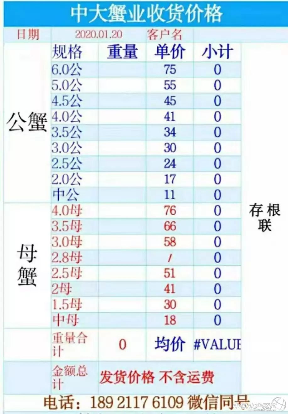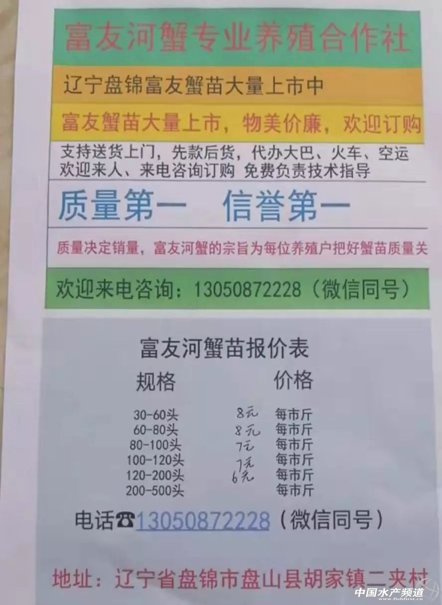 | 中國水產頻道原創報道, 扣蟹參考價 高淳 水陽 盤錦 成蟹行情解析 興化 近期興化普蟹價格整體呈上漲趨勢,與昨天相比,今天蟹價略有下跌,其中4公、3.5公、3公、2.5母、2母均跌1元/斤,其他各規格蟹價基本未變。 成蟹參考價 興化 此報價由興化丁老板提供 泗洪 此報價由泗洪孫老板提供 無錫 此報價由無錫王老板提供 |