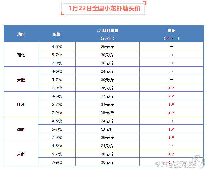 摘要: 中國水產頻道報道,1月22日全國小龍蝦塘頭價。