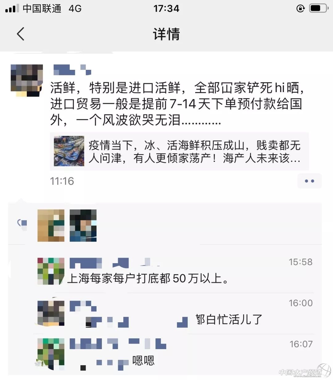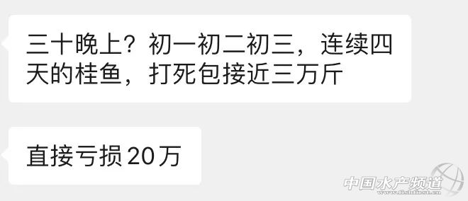 | 中國水產頻道綜合報道, 剛剛,WHO將新冠肺炎疫情構成國際關注的突發公共衛生事件,會不會對我國水產業造成雪上加霜影響?因為今年春年的水產市場,名副其實的水“慘”市場,很多抓魚商、養殖戶,以及90%的經營活鮮商家面臨巨額虧損甚至破產...... 受疫情影響,全國幾乎停止各種餐飲、聚會,還有不少地方仍在封城、封村、封路,魚蝦海鮮水產品的出塘、運輸、交易、流通、消費受到了沉重的打擊...... 海上魚排斷料一周,魚中幾十萬斤石斑壓貨賣不掉 水產前沿報道,福建、海南、廣東石斑魚收購商手中幾十萬斤的石斑魚積壓嚴重,有商家虧本賤賣,有商家稱自春節以來一條魚也賣不掉,面臨巨大虧損...... 海上魚排養殖戶留言訴苦稱,到目前為止已經一個星期沒有飼料喂食了!我們的魚大部份都是要喂魚料的,不知道要到什么時候才能有魚料可以喂...... 打擊巨大,黃顙魚銷量暴降70%, 黃骨魚報道,目前疫情對黃骨魚的銷量影響還是打擊非常大,雖然沒有海鮮和蝦類等水產品影響那么大,但需求下降,黃骨魚的銷量十分慘淡,存塘多造成的隱患也比較大。大部分的外省水產市場全面封閉休市,很少人抓魚和賣魚;廣東地區的水產批發,雖有營業,但營業的魚販不到一半,同時黃骨魚的銷量比去年同期少出貨三分之二。 暴跌12元/斤!對蝦爛市8元一斤,養戶虧大本,草魚3元拋售 水產前沿報道,最低賣到8元/斤,珠三角養戶虧大本,蝦中一輛車虧8萬!受疫情影響,福建、惠州、江蘇等地收蝦量也大幅下降,全國各地蝦價全線暴跌。 水產前沿報道,目前很多流通商都還沒有開工,也不敢開工,最近幾天很多地區幾乎沒有魚車開塘抓魚,養殖戶也基本是足不出戶。目前全國大部分地區都進入封城、封村、封市、封路、封店的全面封閉狀態,一些地區機動車都不讓走了。各地水產市場紛紛關閉,水產品流通幾乎全面停滯,草魚最低3元/斤拋售! 成堆活鱖魚、鮰魚、加州鱸被迫打死包,商家損失慘重 鱖鱸前沿報道,活鱖魚、鮰魚、加州鱸被迫打死包,多個商家手上死魚幾萬斤,虧損20-30萬元不等。 活魚打死包 安徽蚌埠一商戶兩萬斤加州鱸打死包 停業、退單、休市、賤賣…90%活鮮水產檔口現虧損嚴重 今年春節,全國水產活鮮“損失慘重”。有一位業者甚至用了“全軍覆沒、橫尸遍野”來形容,另一業者提到:“因疫情生意受到很大影響,年前生意一般,年后沒生意。臘月二十幾倉庫都開始備貨,等到二十八貨備滿,疫情開始擴大,消費者不知病毒來源,就因華南海鮮市場的海鮮二字,很多顧客認為海鮮出問題了,年三十飯店出現退訂潮,原本給酒店備的貨也退了回來。凍貨無所謂,可活鮮怎搞?年后消費者不出門,酒店不營業,目前海鮮人有幾個不虧錢?” 關于鮮活海產品供應受疫情影響具體情況,日前,海鮮指南采訪了解如下: 來自北京京深市場的商戶: 北京地區受影響非常大,整個市場一個人都沒有,一條魚都賣不了,估計全國都差不多,現在都是低價處理,現在超市還能走一部分貨,我們就拿到超市特價處理。 來自廣州黃沙水產市場的商戶: 就我的檔口直接損失了60萬貨物,一萬3千多斤石斑魚,還有鮑魚800斤。 來自深圳羅湖水產批發市場的商戶: 市場都停止運行了,活的海鮮慢慢等死,凍品放在凍庫。 來自廣東深圳的業者: 酒店很多宴席都退單了,酒店基本上沒有下單,只有新零售渠道還在拿貨。目前只剩10%生意,檔口只開了40%左右,昨天英國蟶子王特價78元,今天特價58元;象拔蚌今天特價100元,跌了50%。 來自廣東深圳的業者: 三文魚準備凍起來,這波虧大了;年前囤的象拔蚌、波蝦、帝王蟹都很難賣得出去,所有酒店不營業,象拔蚌1000多斤,保守虧70元/斤,賣出去不值20%價錢;珍寶蟹和帝王蟹用海水暫養的話,損耗在10%-20%,如果用海水晶兌海水暫養,損耗(死亡)肯定過半。 來自云南昆明的業者: 說多了都是淚,三文魚是慘不忍睹,活鮮也差不多。有客戶回家過年,年前把貨出的差不多。部分有貨的客戶打折清倉,但是無人問津。三文魚只有凍,同樣,活鮮死了凍起來。 以上圖片為受訪者提供 來自海南三亞的商戶: 怎么樣都會受到影響,特別是活鮮,酒店不能開店,影響特別大。以前是客戶來店選,現在不敢岀門,我們提供配送。同行活鮮的影響很大,積貨的批發商量更多、虧本更多。 來自浙江紹興的商戶: 淡水產還好點,每天損失5000-6000元手續費。做海產的都是幾十、上百萬虧,因為海鮮進口的多,都是年前備貨。以珍寶蟹為例,初一批發價138元、初二103元、初三50元、初四40-45元。 來自廣西貴港的商戶: 慘不忍睹,拿了4件三文魚(12-16條)回來,到現在才賣了4條魚。本來以為豬瘟過后,豬肉上漲,很多普通老百姓都沒有多余的錢來消費海鮮了,現在更是雪上加霜。 來自西安方欣國際食品城的商戶: 海鮮市場暫停營業的,所有的業務都是停滯狀態。 來自廣州黃埔的商戶: 市場不景氣,庫存壓力大。 海鮮指南微信公眾號近幾天也陸續收到讀者留言,以下是部分摘錄: @蔣元剛: 今年過年賠大了。 @林蓮核《鵬盛海產》: 最慘就是我們做進口高檔品種、只能眼睜睜看著慢慢由活鮮變成冰鮮、幾百塊的成本、幾十塊在賤賣。 @光輝歲月: 我有一萬多箱10斤裝速凍梭子蟹(吳淞)放冷庫里-啥生意哦 @此男值得擁有18254530622: 我們這里暫養的爬蝦 也是銷售不出去,基本上每戶也有萬斤左右。 @YoYo圓圓: 上海江楊(陽)水產市場龍蝦300多元進價打對折都