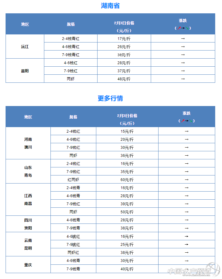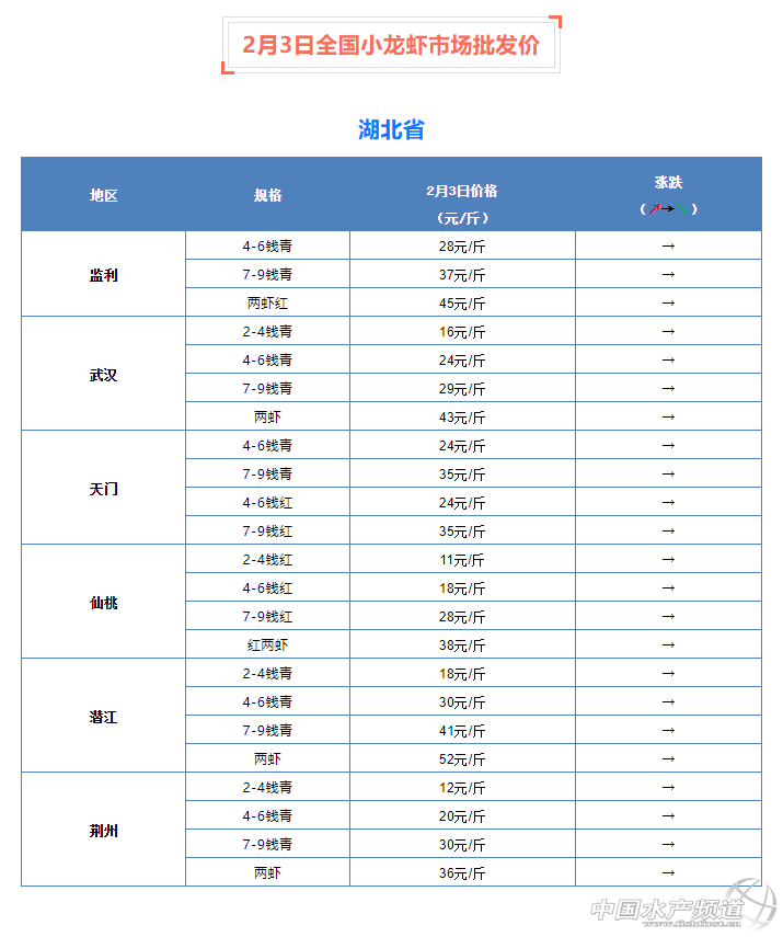 摘要: 中國水產頻道報道,2月3日全國小龍蝦市場批發價。