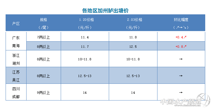 | 中國水產頻道原創報道, 加州鱸 1、廣東鱸魚8兩上開塘價在年前有一波的上漲,從11.7元/斤上升到12.5元/斤,上升了0.8元/斤,年初一開塘價最高有13元/斤,后面很快回落到12.5元/斤。7兩以上價格在11.8元/斤;6兩以上11.2元/斤,由于北線市場都沒有開業,暫時沒有什么人捉1斤以上的魚,實際塘頭價格根據魚頭大小和規格不同略有浮動。加州鱸魚也是從1月23日開始受到新型冠狀病毒肺炎疫情的影響,銷量大幅下降,基本沒有多少人開工捉魚,只是電商和商超還有一些生意,批發市場基本上都已經停了,現在也是只有部分短途城市有發貨,長途線路全部還是處于停止發貨的狀態。每天銷量不多,導致鱸魚存塘量大幅增加,現在很多養戶都想出魚,但由于市場行情暫時還不正常,全部魚還是出不去,預估最快都要過了正月十五才開始有好轉。按照這種態勢發展下去,開塘價格會有小幅的下滑。 2、浙江湖州同樣受到疫情的影響出魚量很少,基本沒有多少人開工,只是捉一部分貨量在當地賣,價格與之前報的差不多,統貨報價10-11.8元/斤,具體價格要看魚頭大小和規格成數而定。 3、江蘇吳江情況與浙江湖州情況差不多,出塘量也不多,價格沒什么變化,8兩上報價12.5-13元/斤,價格會根據魚頭大小及規格比例多少略有調整。這種情況還會持續一斷時間,主要也是看疫情的發展來決定后面的行情。 4、四川成都9兩上報價還是14元/斤,魚價基本保持穩定,出魚量也很少,也是在當地賣給商超與電商為主,市場基本都沒有營業的。 |