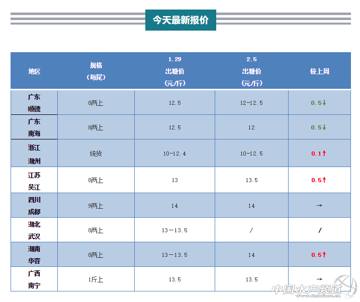 | 中國水產頻道原創報道, 多地出臺政策保障“菜籃子”,加州鱸行情后市或有轉機?! 文/圖 杰大飼料 水產前沿 賀志義 聯合發布 加州鱸行情走勢 一周行情綜述 受疫情持續影響,一方面是全國大部分水產市場或是菜市場出現關停,另一方面是不少地方出現了封城、封村、封路,加上部分餐飲業、酒店等停業,導致加州鱸出塘、運輸、銷售等環節都受到較大影響。市場消費需求降低,各地養殖戶的出魚出現了不同程度的困難,基本上處于有價無市的狀態。廣東佛山加州鱸價格稍有回落,浙江、江蘇、湖南三地魚價略有上漲。由于疫情的影響,現在各地加州鱸的市場狀態或將持續,疫情結束后可能出現集中出魚,建議各位養戶朋友做好規劃。 主產區行情簡析、報價 廣東順徳:今天報價8兩上12-12.5元/斤左右,前兩天個別塘可以賣到12.5元/斤,實際價錢會有所浮動,因為疫情原因,春節假期延長,人員流動少,消費低迷,需求量減少明顯。春節之前已經出魚和清塘的養殖戶比較多,所以他們目前并不著急出魚。真正受影響的個別魚塘原本就安排在春節期間出魚,出魚受阻導致計劃就需要往后推遲。 廣東南海:今天報價8兩上12元/斤左右,實際價錢根據上車規格而定。本地依然受疫情影響比較大,以珠三角市場魚車為主,但收魚量很少,個別村已經連續幾天沒有養殖戶出魚,出魚積極性也比較低,因為收魚量太少,出魚成本會增大。現在出魚的魚塘,一天大多只收1-2萬斤魚不等,以本地市場車為主,外省魚車少。 浙江湖州:湖州今天統貨(7成8兩上)12.5元/斤,8兩上的14元/斤,上漲0.5元/斤,但是走貨量下降較多。受疫情影響,湖州市南潯區已經只出不 |