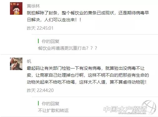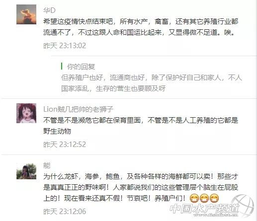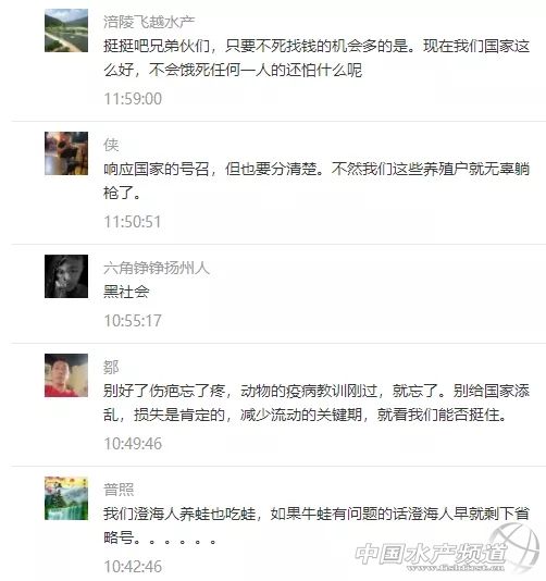 | 中國水產(chǎn)頻道報道, 急急急!鱷魚、龜、水魚、牛蛙、泥鰍、蟮、鴨嘴魚、鱘龍魚、娃娃魚等成了野生動物被禁止銷售食用?這對水產(chǎn)人來說,將是極其嚴厲的沉重打擊! 國家10部委聯(lián)合打擊野生動物違規(guī)交易 2月3日,10部委(局)聯(lián)合部署打擊野生動物違規(guī)交易專項執(zhí)法行動。各地積極行動起來,嚴查違法出售、購買、利用、運輸、攜帶、寄遞野生動物及其制品的行為以及相關(guān)的廣告。 面對疫情,專家提醒,公眾要堅決拒吃野味,注意個人衛(wèi)生。 嚴禁任何形式的野生動物交易 記者2月3日從國家市場監(jiān)管總局獲悉:市場監(jiān)管總局日前聯(lián)合中央網(wǎng)信辦、生態(tài)環(huán)境部、農(nóng)業(yè)農(nóng)村部、公安部、商務(wù)部、衛(wèi)生健康委、海關(guān)總署、林草局、藥監(jiān)局等部委(局)召開打擊野生動物違規(guī)交易專項執(zhí)法行動和打擊非法制售口罩等防護產(chǎn)品專項執(zhí)法行動(以下簡稱“聯(lián)合雙打行動”)部署會議。 會議強調(diào),疫情期間嚴禁任何形式的野生動物交易活動。嚴查違法出售、購買、利用、運輸、攜帶、寄遞野生動物及其制品的行為;不得為出售、購買野生動物及其制品發(fā)布廣告及提供交易服務(wù)等。 “病毒在變化、適應(yīng)人類,科學(xué)認識病毒會有一個過程。”國家衛(wèi)健委高級別專家組成員、中科院院士、中國疾控中心主任高福介紹,這次發(fā)現(xiàn)的新型冠狀病毒是第七個感染人類的冠狀病毒,“我們通過一些非常手段,已經(jīng)找到證據(jù)。我們在懷疑有野生動物銷售的環(huán)境中,檢測到有這種病毒,傳染源還不明確,找不到具體是哪個動物,還在不斷認識過程中。” 廣東省12部門聯(lián)合打擊野生動物違規(guī)交易 廣東省市場監(jiān)管局4日通報,該部門正聯(lián)合省委網(wǎng)信辦、生態(tài)環(huán)境廳、農(nóng)業(yè)農(nóng)村廳、工業(yè)和信息化廳、公安廳、住房城鄉(xiāng)建設(shè)廳、商務(wù)廳、衛(wèi)生健康委、林業(yè)局、藥監(jiān)局以及海關(guān)總署廣東分署等共12個部門,開展“廣東省聯(lián)合打擊野生動物違規(guī)交易專項執(zhí)法行動”。 廣東要求,各地各有關(guān)部門要迅速行動,組織動員最強力量,嚴查野生動物違規(guī)交易行為,全面禁絕違規(guī)交易。 廣東要求,對違規(guī)交易野生動物的經(jīng)營者一律停業(yè)整頓,經(jīng)營場所一律查封,涉嫌犯罪的一律移送公安機關(guān)。 無論是野生的還是人工馴養(yǎng)繁殖的 一律禁絕交易! 會議指出,各地各部門要堅決貫徹落實國家領(lǐng)導(dǎo)人的重要指示批示精神,落實黨中央、國務(wù)院關(guān)于應(yīng)對新型冠狀病毒感染的肺炎疫情的一系列決策部署,進一步提高政治站位,切實增強開展聯(lián)合雙打行動的政治自覺、思想自覺和行動自覺,以最嚴措施開展聯(lián)合雙打行動,從嚴從重從快查處違法違規(guī)行為。 嚴查野生動物違規(guī)交易行為 全面禁絕違規(guī)交易 各地各有關(guān)部門要迅速行動起來,按照最嚴格要求、組織動員最強力量、部署實施最有力措施。 根據(jù)《市場監(jiān)管總局農(nóng)業(yè)農(nóng)村部國家林草局關(guān)于禁止野生動物交易的公告》(2020年第4號)精神,在疫情防控的“戰(zhàn)時狀態(tài)”下,禁絕任何形式的野生動物交易活動,突出強調(diào)“七個一律禁絕交易”,即: ✍無論是野生的還是人工馴養(yǎng)繁殖的一律禁絕交易; ✍無論是陸生的還是水生的一律禁絕交易; ✍無論是農(nóng)貿(mào)市場還是農(nóng)村集(墟)市、餐飲單位一律禁絕交易; ✍無論是活體還是死體一律禁絕交易; ✍無論是市場內(nèi)還是市場外一律禁絕交易; ✍無論是野生動物制品還是其制作食品一律禁絕交易; ✍無論是否已取得野生動物經(jīng)營資質(zhì)一律禁絕交易。 同時提出“三個一律”明確要求,即對違規(guī)交易野生動物的經(jīng)營者一律停業(yè)整頓,經(jīng)營場所一律查封,涉嫌犯罪的一律移送公安機關(guān)。 除了廣東12部門聯(lián)合打擊交易水魚、龜、牛蛙外,在黃沙水產(chǎn)交易市場有限公司經(jīng)營部通告,還有蛇類、鱷魚、娃娃魚同樣不能擴散、轉(zhuǎn)運和銷售,廣東部分地區(qū)還把泥鰍、鱔等品種也列入禁售交易的范疇。 牛蛙賤賣到1元/斤、市場2000萬元龜鱉面臨死亡 據(jù)悉,自從牛蛙、甲魚、烏龜被一紙文件列入野生動物或飼養(yǎng)繁育的野生動物的范疇,20萬斤青蛙封存,單單澄海就有十幾萬噸牛蛙走投無路,牛蛙價格一泄千里,賤賣到1元/斤的絕境!昨天,水產(chǎn)前沿公眾號報道了以下兩篇文章,引發(fā)了行業(yè)引起了高度的關(guān)注和反響,眾多讀者爭相留言表達了對事件看法! 《人工養(yǎng)殖30年龜鱉一夜間變成野味?禁售、落封條,黃沙市場2千萬元龜鱉正在等死》 《20萬只青蛙被封!禁運禁售,十幾萬噸牛蛙無路可走!業(yè)界呼吁:分類管理不可一刀切》 部分網(wǎng)友留言 還有很多很多...... 震驚!泥鰍、蟮、鴨嘴魚、鱘龍魚都成了野生動物? 據(jù)悉,目前廣州黃沙水產(chǎn)市場發(fā)文嚴禁交易野生動物及其制品,包括人工飼養(yǎng)的野生動物,主要包括人工養(yǎng)殖的蛇類、鱷魚、娃娃魚、水魚、龜?shù)取5趶V東很多地區(qū),日前也紛紛發(fā)文一律停止