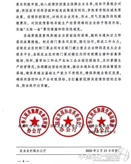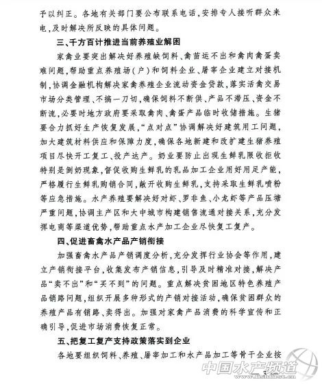 | 中國水產頻道綜合報道, 農業農村部辦公廳、國家發展改革委辦公廳、交通運輸部辦公廳關于解決當前實際困難加快養殖業復工復產的緊急通知 農業農村部辦公廳 國家發展改革委辦公廳 交通運輸部辦公廳 關于解決當前實際困難加快養殖業復工復產的緊急通知 各省、自治區、直轄市農業農村(農牧)、畜牧獸醫、海洋與漁業廳(局、委),發展改革委,交通運輸廳(局、委),新疆生產建設兵團農業農村局、發展改革委、交通運輸局: 肉蛋奶和水產品是居民生活必需品。新冠肺炎疫情發生以來,養殖業發展遇到新的困難,飼料供不上、物資運不進、產品銷不出、用工回不來等問題普遍存在,如不迅速妥善解決,不僅會影響產業穩定發展,而且很快會影響城鄉居民基本生活和新冠肺炎疫情防控大局。各地各部門要堅決貫徹習近平總書記重要指示批示精神和黨中央、國務院決策部署,針對養殖業面臨的特殊困難,采取特別的支持幫扶措施解決問題堵點,推動養殖業立即復工復產。現將有關事項通知如下。 一、加快飼料企業和畜禽屠宰加工企業復工復產 除武漢等疫情嚴重的城市外,各地都要允許飼料和畜禽屠宰加工企業復工,不得設置審查核準等限制條件。優先保障相關企業的人員防護物資需求和水、電、氣等供應。優先安排相關企業用工返程返崗,地方政府統一組織的返崗包車納入疫情防控應急運輸綠色通道政策范圍,免收高速公路通行費。建立飼料原料供需調度機制,推動當地糧庫與飼料企業緊密對接,增加政策性玉米投放供應,適時調配投放庫存稻谷、小麥等替代原料。加快豆粕等上游原料生產企業開工,充分調動相關行業協會力量,促進豆粕等飼料原料產銷對接。各地對湖北等疫情嚴重地區提出的飼料原料采購需求,要采取特別保障措施實施“點對點”支持。 二、確保物資和產品運輸暢通 將飼料產品及玉米、豆粕等飼料原料、種畜禽、仔豬禽苗、水產苗種、出欄畜禽、生鮮乳、乳制品、鮮活水產品、冷鮮豬肉、轉場蜜蜂等納入生活必需品應急運輸保障范圍,切實落實綠色通道政策,除必要的對司機快速體溫檢測外,確保“三不一優先”,便捷快速通行。盡快打通養殖業所需物資下鄉和產品進城進廠的運輸通道,不得攔截仔畜、雛禽及種畜禽、飼料原料及產品、畜禽水產品運輸車輛。對一些縣、鄉、村封村封路、一概勸返等不恰當做法,要堅決予以糾正。各地有關部門要公布聯系電話,安排專人接聽群眾來電【文章留言處已公布各地24小時值班電話】,及時解決所反映的具體問題。 三、千方百計推進當前養殖業解困 家禽業要突出解決好養殖缺飼料、禽苗運不出和禽肉禽蛋賣難問題,幫助重點養殖場(戶)和飼料企業、屠宰企業建立對接機制,協調金融機構解決家禽養殖企業流動資金貸款,落實活禽交易市場分類管理、不搞一刀切,確保飼料不斷供、產品不滯壓、資金不斷流,必要時地方政府要采取禽肉、禽蛋產品臨時收儲措施。生豬要合力抓好生產恢復發展,“點對點”協調解決好建筑用工問題,加大建筑材料供應和保障力度,確保各地新建和改擴建生豬養殖項目盡快開工復工、投產達產。奶業要防止出現生鮮乳限收拒收特別是倒奶現象,督促收購生鮮乳的乳品加工企業用好用足產能,嚴格履行生鮮乳購銷合同,敞開收購生鮮乳,支持采取生鮮乳噴粉等應急措施。水產養殖要解決好對蝦、羅非魚、小龍蝦等產品壓塘嚴重問題,協調主產區和大中城市構建銷售流通對接關系,充分發揮電商等渠道優勢,幫助重點水產加工企業盡快復工復產。 四、促進畜禽水產品產銷銜接 加強畜禽水產品產銷調度分析,充分發揮行業協會等作用,建立產銷銜接平臺,收集發布產銷信息,引導及時精準對接,解決產品“賣不出”和“買不到”的問題。重點解決貧困地區特色養殖產品銷路問題,組織開展多種形式的產銷對接活動,確保貧困群眾的養殖產品有銷路、賣得出。加強對家禽產品消費的科學宣傳和正確引導,促進市場消費恢復正常。 五、把復工復產支持政策落實到企業 各地要組織飼料、養殖、屠宰加工和水產品加工等骨干企業按要求積極申報,納入疫情防控重點保障企業名單,組織開展銀企對接,將國家專項再貸款和貼息政策落實到位,爭取享受稅收減免等政策。疫情防控期間,對相關企業用電、用水、用氣實施階段性緩繳費用。對因疫情影響導致生產經營困難的企業給予穩崗補貼,實施“五險一金”費用緩繳和階段性減免。 各地要高度重視養殖業當前面臨的困難,接到本通知后立即落實政策措施。相關部門要各司其職,強化協作,形成工作合力。省級農業農村部門要會同有關部門建立重點企業特別是龍頭企業聯系平臺,縣級農業農村部門要對轄區內所有規模生豬和家禽養殖場、飼料、屠宰加工和水產品加工企業指定聯絡員,及時掌握生產經營情況,協調解決面臨的困難,推動本通知各項支持政策落實落地,確保養殖業基礎生產能力不受損失,確保養殖業穩定發展,確保肉蛋奶和水產品有效供給,為打贏新冠肺炎疫情防控的總體戰、阻擊戰作出貢獻。 農業農村部辦公廳 國家發展改革委辦公廳 交通運輸部辦公廳 2020年2月15日 |