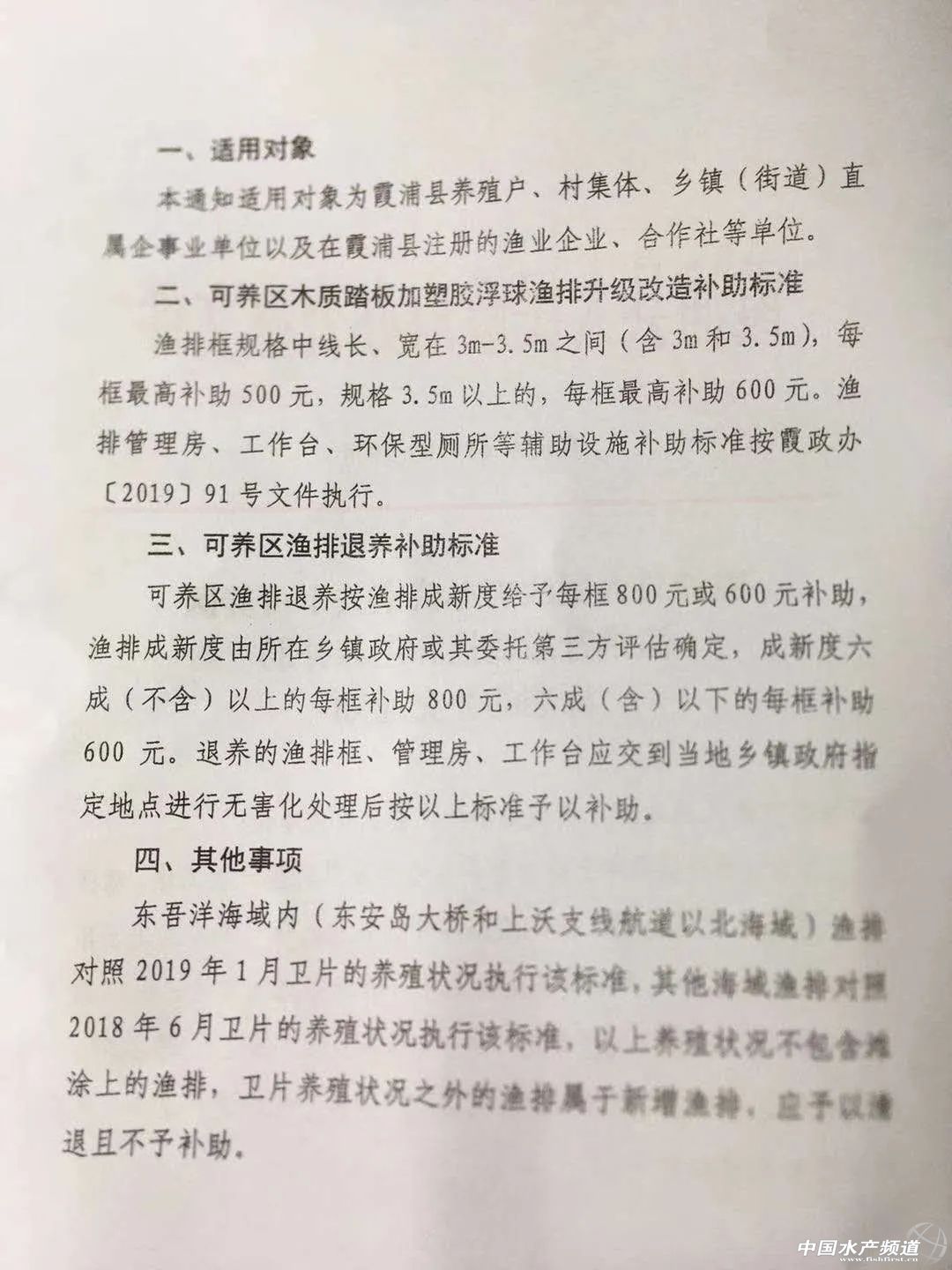| 中國水產頻道原創報道, 經濟形勢放緩至下,有些養殖戶連賴以為生的魚都不讓養了…… 文/ 水產前沿 李帥、數據寧德大黃魚協會 近期要聞 近日,福建寧德市霞浦縣出臺了《關于可養區魚排升級改造和退養補助標準的補充通知》,在通知中明確了養殖區和限養區漁排升級改造和退養的補助標準。 當地的養殖戶和漁業企業、合作社若想申請補貼,需要滿足相關標準要求,申請將木質踏板加塑料浮球魚排升級改造每框最高補貼600元!而在可養區內則按照漁排的新舊程度給予不同補貼,6成新以上每框補貼800元,6成新以下每框補貼600元,評估由鄉鎮政府或第三方機構確定。 新漁排 舊漁排 “據當地一位飼料業務經理告訴筆者,新型塑膠魚排的建造標準是5m*5m,一框造價也要3000元,而塑膠浮球1個需要200元,這就意味著政府補貼600元之后,養殖戶還是要自己出大頭資金,而傳統魚排的造價較為低廉,一個泡沫浮球不到100元,鐵杉木做成的網框也能應付一般級別的臺風,因此養殖戶對于政策補償,大多是抱怨太低了,抵觸心理較為嚴重,覺得老舊魚排效果也不錯,新魚排除了美觀之外,防范臺風的能力還要進一步觀望。” 霞浦縣人民政府文件通知圖 而這些退養的漁民上岸之后,生計又成一大問題,很多人都在海面上養了十年、二十年魚了,上岸之后身無長技,下一步的規劃,還需要好好考慮,而能留下來的養殖戶也并不容易,據筆者了解,寧德大黃魚近期的價格一直波瀾不驚,維持在成本線附近,養殖戶辛苦一年,甚至還不如上岸打工掙錢多,產業接下來該如何前行,是每一位業者都在關注的事情。 |