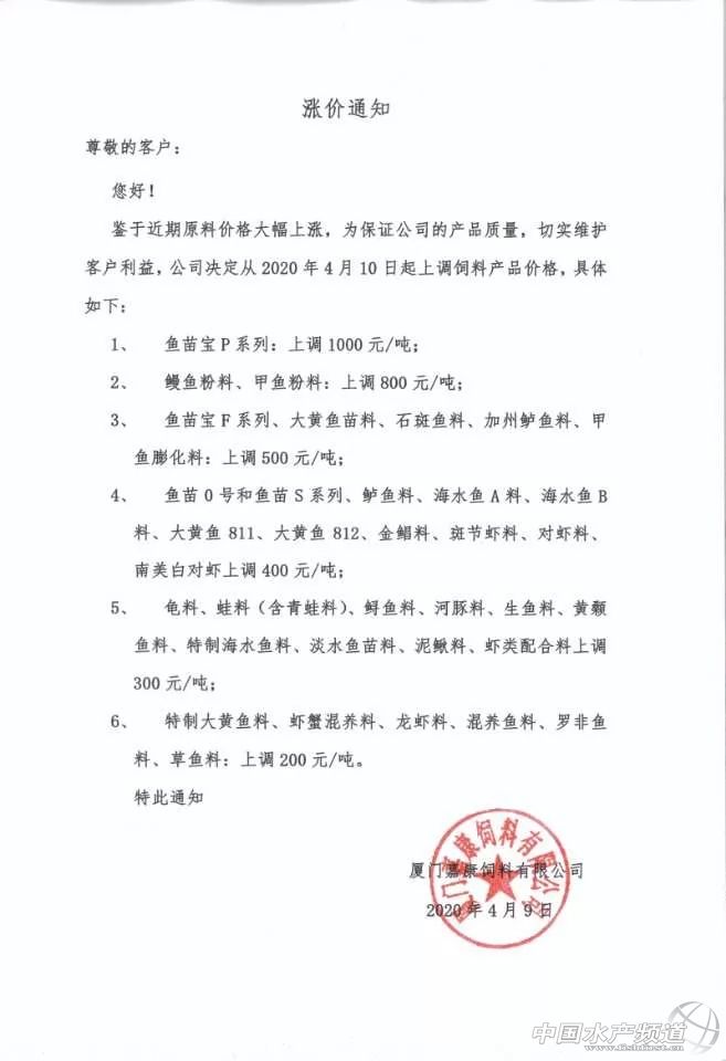 | 中國水產頻道獨家報道,江蘇部分水產料企業發布漲價通知:從4月10日零時開始,對蝦蟹料上漲100-1000元/噸,普水魚料上漲100-200元/噸,特種水產料上漲200-400元/噸。 文/ 水產前沿 唐東東 4月10日零時起,江蘇部分水產料品種價格可能出現上調,大體為蝦蟹料上漲100-1000元/噸,普水魚料上漲100-200元/噸,特種水產料上漲200-400元/噸。盡管3月31日起至今已陸續有企業發了漲價通知,但實質上新的價格體系也是延至4月10日零時正式開始執行。 近段時間一直在跟進水產料漲價的事情,發現華東與其它區域最大的不同:一是華東區域的飼料漲價非常不同步,比如有些企業宣布4月15日才漲淡水魚料,也有決定4月12日漲價,而有些企業已經發了漲價通知,還有些說沒打算漲。出現這一散裝現象的原因,主要是江蘇尤其蘇北前期溫度低,投料比較晚,飼料企業前期的銷量都不大,以搶客戶及鋪貨為主,所以企業對漲價都非常慎重,同行之間也相互提防。二是華東的飼料企業都不大希望漲價通知被到處傳,怕被競爭對手利用了說是“率先漲價”而要面對市場的指責,畢竟當前普水魚的行情不大好,病害又嚴重。 實際上,發布漲價通知離正式漲價多少還是有一段緩沖期,也有可能最終不了了之;目前有企業盡管發了漲價通知,但用促銷消化掉了,價格并沒有實質性漲起來。總之,市場暗流涌動,同時也擔心是競爭對手釋放的煙霧彈,因此不少飼料企業還處于觀望狀態,等確定主要競爭對手的價格確實漲上去后,才會同步跟進。 下面就不放企業的漲價通知全文及圖片了,只羅列主要的信息: 泰州海大生物飼料有限公司漲價通知 從2020年4月10日零時起,對以下產品進行調價: 1.白蝦料36蛋白及以上產品系列漲價200元/噸,魚蝦蟹混養產品系列漲價150元/噸。 2.螃蟹功能料漲價200元/噸;螃蟹常規料:36蛋白及以上產品系列漲價150元/噸,36蛋白以下產品系列漲價100元/噸。 3.龍蝦料所有產品系列漲價100元/噸。 南通海大生物科技有限公司漲價通知 從2020年4月10日零時起,對以下產品進行調價: 1.白蝦小棚專用料、蝦壯、蝦富系列漲價200元/噸,蝦肝寶、蝦大大系列漲價300元/噸,工廠化專用料D6211、G6212、豐蝦寶、健蝦寶系列漲價500元/噸,其它魚蝦混養料、旺蝦、蝦康系列漲價150元/噸。 2.螃蟹功能料:蟹肝寶、蟹康寶、蟹先豐和育膏王系列漲價200元/噸;螃蟹常規料:36(35.5)蛋白及以上漲價150元/噸,32蛋白以下蟹料漲價100元/噸。 3.羅蝦、青蝦料漲價200元/噸。 4.龍蝦料、蝦蟹混養料漲價100元/噸。 淮安市澳華農牧有限公司漲價通知 自2020年4月1日8:00(畜禽料4月1日執行,水產料給予9天備貨時間,新的價格體系于2020年4月10日零時正式開始執行)起,對部分飼料產品進行價格調整: 1.普通魚料產品根據品種上調100-200元/噸; 2.普通蝦蟹料上調200元/噸;蝦蟹安康類產品上調300元/噸,金剛安康、鉑金安康、黃金安康上調500元/噸,蝦奶粉上調1000元/噸; 3.黃顙魚料、泥鰍料上調200元/噸,加州鱸魚料上調400元/噸; 4.8140濃縮料上調500元/噸,其它濃乳料上調200元/噸,全價豬料上調100元/噸,禽料上調50元/噸。 鹽城天邦飼料科技有限公司漲價通知 自2020年4月2日零時起,對下列系列產品銷售價格進行上調: 1.河蟹蟹三超系列(40及40蛋白以上)、羅氏沼蝦好養系列、南美白對蝦蝦好養系列產品上調400元/噸; 2.河蟹蟹三超系列(40蛋白以下)、標準河蟹料、羅氏沼蝦、南美白對蝦、小龍蝦料系列產品上調300元/噸; 3.淡水魚料顆粒料、膨化料系列產品上調200元/噸; 4.邦尼苗料系列產品上調1000元/噸。 新希望六和江蘇新區水產線路漲價通知 于2020年4月1日零時起,對所有普水飼料產品上調200元/噸。 廈門嘉康飼料有限公司漲價通知 |