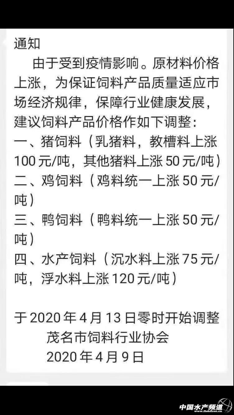 文/ 水產前沿 唐東東 中國水產頻道原創報道,4月9日下午,廣東茂名市飼料行業協會發布漲價通知,稱由于受到疫情影響,飼料原料價格上漲,為保證飼料產品質量適應市場經濟規律,保障行業健康發展,建議沉水料上漲75元/噸,浮水料上漲120元/噸。執行時間為4月13日零時開始。 此前,廣東的蝦料、特水料、海水料等品種的價格都已不同幅度上調,僅普水料還沒有調整。因此,本次茂名市飼料行業協會所建議提價的為普水料。據當地飼料企業反饋,這次漲價可能部分企業會跟隨,但也有企業將不計劃漲價,理由是:不漲價是不想給競爭對手輸血,漲價后營銷空間就大了,到時市場政策給得猛。 所以,粵西各企業普水料價格調整的具體情況,還需等兩天才能有定論。一般情況下,粵西普水料的價格波動,極少會影響到珠三角。珠三角地區的飼料企業也反饋還未聽說普水料將漲價。珠三角某飼料企業負責人認為,當下珠三角普水料漲價的可能性不大,但4月底時可能會漲。“現在海大、通威等企業都在發力高檔魚料市場,但今年的魚粉行情大幅上漲,高檔魚料市場不好打,因此兩大巨頭需要維護好普水魚料市場的量,這是他們工廠運作各項費用的基本保障。而且,當前飼料企業手頭上多少還有點低價的原料(期貨),但如果持續到4月底,大家的低價原料消耗得差不多了,遠期期貨要是不能按期交貨,那漲價的壓力就非常大了。” 茂名市飼料協會建議飼料漲價通知 |