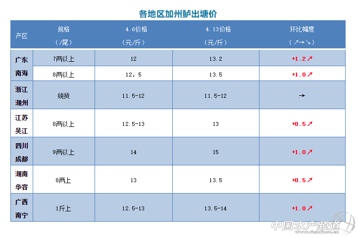 | 中國水產(chǎn)頻道原創(chuàng)報道, 加州鱸 1、本周加州鱸塘頭價再次出現(xiàn)上漲,開塘價7兩以上13.2元/斤,比上周上漲了1.2元/斤,8兩以上13.5元,比上周上漲了1.0元/斤。6兩上的開塘價格也要13元/斤。最終成交價會根據(jù)塘頭質(zhì)量、超大魚比例來決定。這次漲價的主要原因是前段時間魚價稍有下跌,很多養(yǎng)殖戶都不愿意賣魚,再加上產(chǎn)完卵后的加州鱸體重減輕,養(yǎng)殖成本增高,部分養(yǎng)戶出魚積極性降低,造成市場上比較缺魚,價格就漲起來了。預計接下來價格或?qū)⒊址(wěn)一斷時間,銷量跟上周也差不多。 2、浙江湖州本周統(tǒng)貨報價11.5-12元/斤,價格保持穩(wěn)定。具體價格要看魚頭大小和規(guī)格成數(shù)而定。本地天氣好,養(yǎng)戶出魚積極性較高。 3、江蘇吳江本周價格與上周相比上升了0.5元/斤,8兩上報價13元/斤,價格會根據(jù)魚頭大小及規(guī)格比例多少略有調(diào)整。當?shù)仞B(yǎng)戶出魚積極性較低,大部分養(yǎng)戶還在觀望等待高價格,出魚量較少。 4、四川成都今天報價9兩上15元/斤,比上周上漲了1元/斤。銷量跟上周差不多,價格或?qū)⒈3址(wěn)定。 5、湖南華容本周價格比上周上漲了0.5元/斤,報價是13.5元/斤,銷量跟上周也差不多。廣西南寧本周價格13.5-14元/斤,比上周也上漲了1元/斤,銷量也跟上周相差不大。 |
