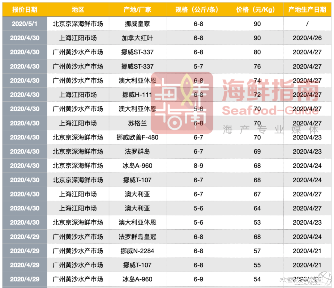 | 中國(guó)水產(chǎn)頻道原創(chuàng)報(bào)道, 北京冰鮮三文魚(yú)價(jià)格報(bào)價(jià)90元/公斤 文/ 海鮮指南(seafood-guide) 沈基文 今(5月1日)早,北京市場(chǎng)冰鮮三文魚(yú)報(bào)價(jià)突破90元/公斤! 海鮮指南從北上廣三地批發(fā)市場(chǎng)經(jīng)銷商處了解到,部分報(bào)價(jià)上漲因航班延誤、到貨不足導(dǎo)致,另一方面,“前段時(shí)間的貨都扎堆在中國(guó),現(xiàn)在國(guó)外有些國(guó)家也復(fù)工了,供應(yīng)量就分散了,前兩三周大家都賠得很多,這周就沒(méi)訂什么魚(yú),導(dǎo)致暴漲。” 從統(tǒng)計(jì)表可以看出確實(shí)是有上漲,從4月29日?qǐng)?bào)價(jià)到4月30日?qǐng)?bào)價(jià),僅隔一天,廣州市場(chǎng)挪威魚(yú)就從57元/公斤漲到80元/公斤。 而北京,截至海鮮指南發(fā)稿,“現(xiàn)在市場(chǎng)賣90多(元/公斤)。” 備注: 1、本文未明確規(guī)格時(shí),均為中國(guó)市場(chǎng)常規(guī)規(guī)格(6-7Kg); 2、本文報(bào)價(jià)均為批發(fā)市場(chǎng)走量報(bào)價(jià),不含配送費(fèi)用及服務(wù)費(fèi)用,各家報(bào)價(jià)不一,請(qǐng)各終端以自家供應(yīng)商報(bào)價(jià)為準(zhǔn)。 |