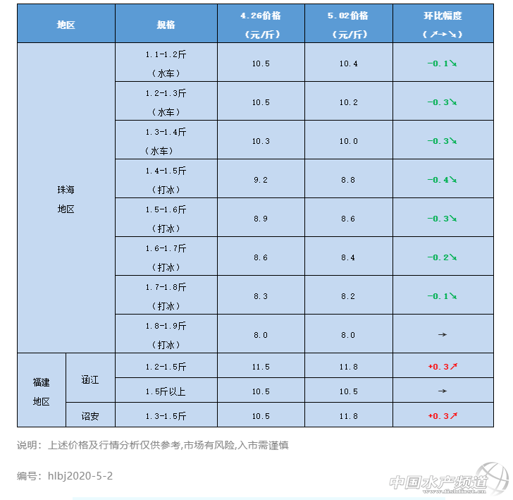 | 中國水產頻道原創報道, 我國全面進入海洋伏季休漁期,魚價有望上漲 文/ 水產前沿 陳曉慶 養好魚,更要賣好魚 全新海鱸魚行情解析 水產前沿與您相約每周六 感謝進才水產供圖 一周要聞 我國全面進入海洋伏季休漁期,魚價要漲? 5月1日,渤海、黃海、東海和北緯12度以北的南海海域全面進入海洋伏季休漁期。今年,我國將繼續堅持“最嚴格的伏休制度”和“最嚴格的伏休管理”。 封海之后不允許捕撈的魚蝦主要有毛蝦、中國對蝦、鲅魚、鯧魚、鼓眼、大頭腥、鱸魚、刀魚、舌頭魚、黑頭、黃魚、小黃花、面包魚、海鮒等。由于現在冷凍技術相對成熟,近海養殖的魚、遠洋漁船回運的海鮮、冷藏廠的魚解凍后均可進入市場;遠洋捕撈船供應的阿根廷魷魚、阿根廷紅蝦、南美白對蝦、小磷蝦、北極甜蝦也會大量投放市場;另外,養殖的鱸魚、大菱鲆、海鮒和對蝦等也會補充市場,養殖魚類價格有望上漲。 5月6日起全國恢復公路收費!水產農產品運輸繼續享受免通行費! 4月28日交通運輸部通過官網發布通知:從5月6日零時起,全國收費公路將恢復收費!通知中明確指出鮮活農產品運輸車輛繼續享受免收車輛通行費政策。 價格走勢 各地具體行情及價格 珠海:據悉,五一假期近兩天珠海海鱸小規格魚價格穩定,大規格魚價格略微下滑。本周珠海海鱸水車1.1斤以下報價10.5元 /斤,水車1.2-1.3斤報價10.3元斤,水車1.3-1.4斤報價10元/斤,相比上周下降了0.1-0.3元/斤,冰車1.4-1.5斤規格報價8.8元/斤,相比上周下降了0.4元/斤。 五一假期來臨加上休漁期的開始,海鱸魚的市場消費需求有所上漲,近兩天冰車走量明顯增多,但局部市場競爭激烈的形勢仍然存在,魚中為了搶客戶相互壓價,導致價格難以上漲, 5月1日開始,渤海、黃海、東海和南海部分海域全面進入海洋伏季休漁期,海鱸等人工養殖的水產品將補充市場空缺,加上海鱸舊魚整體存塘量在不斷減少,后市魚價看漲! 福建:福建鱸魚逐漸順暢,本周福建涵江、詔安區域鱸魚價格繼續保持上漲趨勢,價格相比上周上漲了0.3元/斤。 |