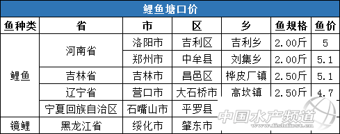 | 中國水產(chǎn)頻道報道, 文\通威農(nóng)牧資訊 張梅 鯉魚 數(shù)據(jù)分析:本周全國鯉魚塘口均價5.12元/斤,同比上漲1.39%,環(huán)比上漲2.23%。 華北地區(qū):近期因五一假期刺激,沈陽地區(qū)鯉魚流通量增加,價格上漲0.1元/斤。黑龍江地區(qū)前期病魚基本出售完畢,放釣需求增加,價格上漲0.1元/斤。河南地區(qū)受沈陽、天津鯉魚沖擊,價格較上周下跌0.1元/斤。 華西地區(qū):寧夏地區(qū)流通增加,價格較上周上漲0.2元/斤,四川地區(qū)價格與上周持平。(本文轉(zhuǎn)自【通威農(nóng)牧資訊】。如有版權(quán)問題,敬請聯(lián)系wx@fishfirst.cn。) |