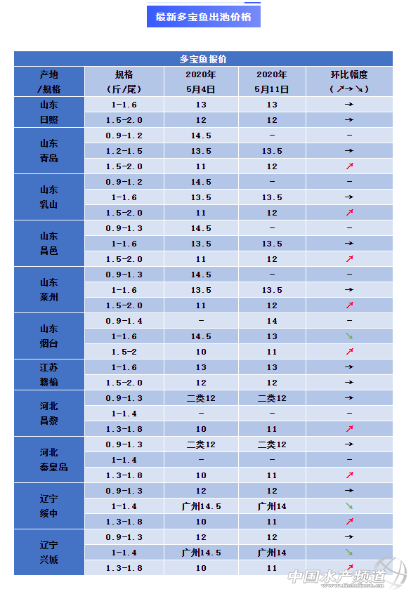 | 中國(guó)水產(chǎn)頻道原創(chuàng)報(bào)道, 一周多寶魚(yú)價(jià)格播報(bào)及行情解析 文|工業(yè)化水產(chǎn)圈植銀素 多寶魚(yú)一周行情簡(jiǎn)析 本周,多寶魚(yú)終于迎來(lái)新的漲價(jià)消息!據(jù)統(tǒng)計(jì),對(duì)比上周同期,山東青島、乳山、煙臺(tái)和遼寧等地大標(biāo)魚(yú)上漲1元/斤!5月9日零時(shí),廣東省新冠肺炎疫情防控應(yīng)急響應(yīng)級(jí)別由省重大突發(fā)公共衛(wèi)生時(shí)間二級(jí)響應(yīng)正式調(diào)整為三級(jí)響應(yīng)。目前24個(gè)省份已調(diào)整為三級(jí)響應(yīng),全國(guó)8成以上商超、酒店、餐館將陸續(xù)全面開(kāi)放,消費(fèi)將進(jìn)一步復(fù)蘇。流通商表示,酒店餐館重新開(kāi)張,近兩天多寶魚(yú)走量逐漸增長(zhǎng)起來(lái)了。目前大標(biāo)魚(yú)價(jià)格率先上漲,但是部分地區(qū)廣標(biāo)價(jià)格對(duì)比上周還有所下滑。 另外,因多寶魚(yú)價(jià)格持續(xù)低迷,近兩月價(jià)格都遠(yuǎn)在成本線以下,今日,興城地區(qū)有相關(guān)協(xié)會(huì)發(fā)起呼吁,希望養(yǎng)殖戶從今晚起15天不出魚(yú),助推魚(yú)價(jià)上漲;并報(bào)價(jià)標(biāo)魚(yú)18元/斤,廣標(biāo)20元/斤,不到該價(jià)格都不出魚(yú)!消息一出,不少養(yǎng)殖戶表示支持,隨機(jī)遼寧、山東等多地養(yǎng)殖戶交流群都轉(zhuǎn)發(fā)了此條呼吁。 聯(lián)合保價(jià)在多寶魚(yú)養(yǎng)殖圈已經(jīng)不是第一回了,但是這樣真的能幫助魚(yú)價(jià)上漲嗎?有業(yè)者認(rèn)為可以嘗試,但不要將結(jié)果過(guò)于理想化。如有急于交電費(fèi)、買飼料的情況,養(yǎng)殖戶就不得不賣魚(yú)了。另有業(yè)者表示,消費(fèi)端需求開(kāi)始上漲,養(yǎng)殖戶應(yīng)及時(shí)清空庫(kù)存,積壓成魚(yú)易增加養(yǎng)殖成本,后期集中出售也容易引發(fā)價(jià)格下滑,并且近期水溫開(kāi)始升高,囤積成魚(yú)的養(yǎng)殖戶需要注重魚(yú)病預(yù)防工作。 |