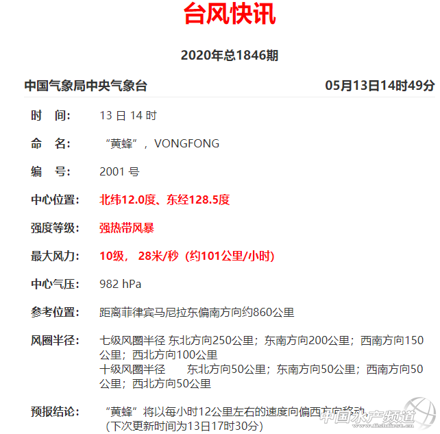 | 中國水產頻道綜合報道, 廣東、廣西、福建、浙江魚蝦塘臺風警報緊急拉響!華南龍舟水、華東雨季即將全面爆發! 緊急關注! 2020年臺風季大幕正式拉開, 首個臺風“黃蜂”生成! 最強將達13級 廣東、福建、臺灣或先“吃下沉” 華南龍舟水、華東梅雨季即將爆發! 廣東、廣西、福建、浙江、臺灣 可能遭今年最強暴雨襲擊! 2020年首個臺風“黃蜂”已正式生成,最強13級 2020年首個臺風“黃蜂”(熱帶風暴級)已于昨晚生成,預計,“黃蜂”強度將逐漸增強,最強可達臺風級。 中央氣象臺的預測認為,臺風黃蜂未來將持續向西北方向移動,逐漸向菲律賓群島靠近,由于目前臺風黃蜂發展相當順利,中央氣象臺認為未來臺風黃蜂的強度還將繼續加強。從目前來看,到5月14日上午可能就將達到臺風級,而5月14日晚還能達到13級風力。但從路徑預測上也能看到,臺風黃蜂在快速增強后將以巔峰強度登陸菲律賓,并且可能橫掃菲律賓群島中北部。 今年第1號臺風“黃蜂”今天(13日)上午8點鐘(北京時,下同)由熱帶風暴級加強為強熱帶風暴級,上午8點鐘其中心位于菲律賓馬尼拉東偏南方約910公里的洋面上,就是北緯11.9度、東經128.9度,中心附近最大風力10級(25米/秒),中心最低氣壓985百帕,七級風圈半徑100-250公里。 黃蜂出現“臺風眼”,正在不斷增強 從衛星云圖上看,它正位于菲律賓以東洋面,結構小巧緊湊,已經發展出一個比較密集的核心區,這是它明顯增強的表現。 中央氣象臺認為它目前已經是10級的強熱帶風暴。 從目前來看,由于其所在的位置海水能量充沛,大氣環流條件適合,它還將繼續增強。 今天上午,臺風黃蜂中心一度出現朦朧的臺風眼,這是它開始趨于成熟的標志,意味著臺風黃蜂可能開始朝著更高強度邁進。 接下來,它將一邊增強一邊靠近菲律賓群島,對于菲律賓群島而言1號臺風黃蜂是個不容忽略的威脅。 未來兩天“黃蜂”對我國海區無影響 預計,“黃蜂”將以每小時10-15公里的速度向西北方向移動并逐漸向菲律賓東部沿海靠近,強度繼續增強,將于15日前后登陸菲律賓呂宋島,爾后轉向東北方向移動,并將在臺灣島以東洋面減弱消失。未來兩天“黃蜂”對我國海域無影響。 從衛星云圖可見,生成前后的黃蜂,已有非常明確的核心云團,強烈對流圍繞中心旋轉、翻滾。 葵花-8號衛星監測到的“黃蜂”動態云圖(時間段:2020年5月13日01時00分至5月13日08時00分)來自:臺風監測 “黃蜂”可能直接影響我國臺灣島 “黃蜂”有直接影響我國臺灣島的可能性,同時它在巴士海峽附近轉向的過程中北側的臺風倒槽會影響到福建、浙江南部和廣東東部沿海。 各個預報方法預測的1號臺風“黃蜂”幾天內移動路徑 據官方預報,受副熱帶高壓和黃蜂臺風下沉氣流影響,5月17日之前廣州將出現桑拿天,來自NMC 廣東、廣西、福建、浙江、臺灣或迎來今年最強暴雨 而到5月17日以后,隨著黃蜂的轉向、副高的東退,西南季風將在南海全面爆發,華南龍舟水、福建、浙江雨季、臺灣梅雨隨即開始。5月18日前后,廣東、廣西、福建、臺灣都可能迎來今年最強暴雨。 5月16-19日,西南季風在南海的爆發過程預估。中氣愛根據ECMWF數據制作 總之,1號臺風雖然登陸我國的可能性不大,但它會促成副高東退和南海夏季風爆發,對我國的間接影響不容忽視,尤其是華南、福建和臺灣。其中,臺風轉向之前,廣東福建臺灣可能“吃下沉”,會熱幾天;臺風轉向之后,兩廣福建臺灣將陸續進入強盛的雨季。 “黃蜂”目前來看不會登陸我國,那何時才會有臺風登陸我國呢? 從常年來看,首個登陸我國的臺風出現在6月28日,超過4成的首登臺風登陸在了廣東沿海。從登陸強度來看,首個登陸我國的臺風普遍不強,絕大多數強度都在臺風級或以下,其中超過7成的臺風都是強熱帶風暴級或臺風級。 今年一號臺風“黃蜂”的生成,代表著今年臺風季的大幕已經拉開,今年臺風影響區域集中在華東和華南東部沿海地區,針對臺風帶來的暴雨洪澇、大風和風暴潮災害,要提前做好防御準備。 盡管1號臺風“黃蜂”不會直接登陸我國,但即有華南、華東等地將有暴雨襲擊,提醒廣東、廣西、福建、浙江等地的養殖朋友,密切關注臺風動態以及當地天氣預報,提前做好各種防范措施,尤其是注意防范有可能暴發的暴雨、洪澇災害。 |