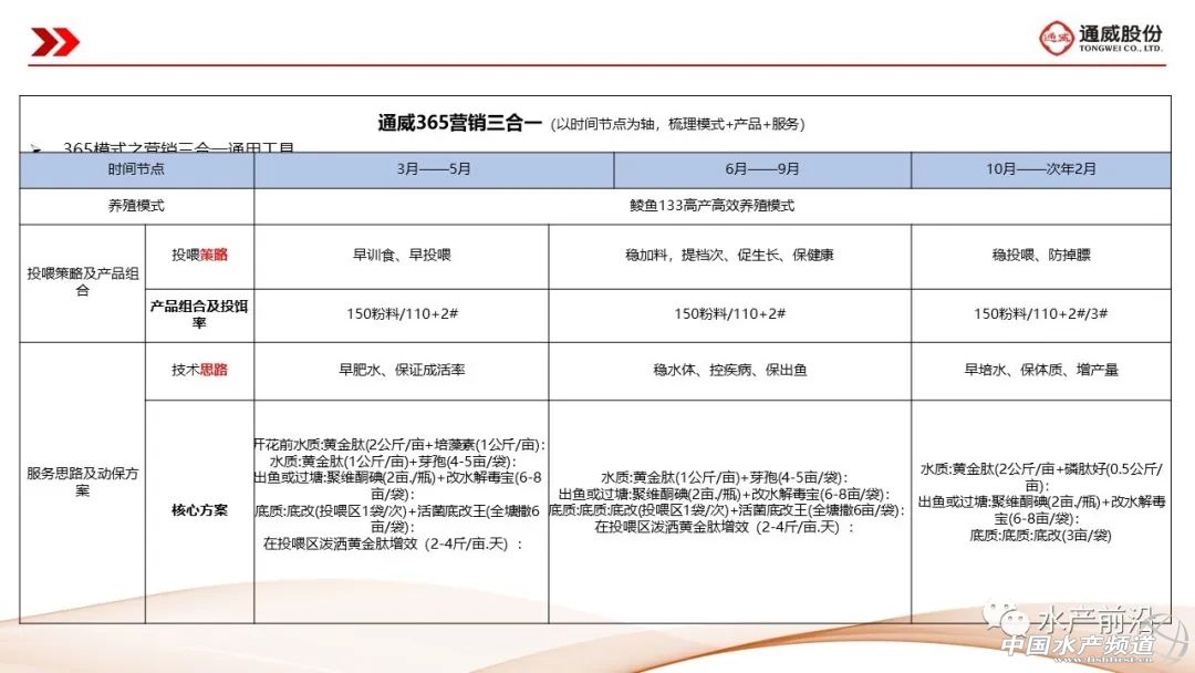 | 中國水產頻道原創報道, 圍繞一條魚的全養殖周期,通威股份全面提出了產品+模式+服務的“三合一”價值營銷模式,來幫助養殖戶獲得更高的效益 文/圖水產前沿唐東東 回歸價值競爭之后,水產飼料企業之間的競爭將逐漸進入深海區。飼料鏈條上的商業模式,已經不再是簡單的產品供銷模式,而是需要回答一個最根本的問題:如何幫助養殖環節獲取更高的收益,以支撐產業鏈的健康永續發展,而不是走入竭澤而漁的地步——意味著,飼料企業需要更了解魚、客戶及市場,也需要重鑄自身的價值軌道。 圍繞一條魚的全養殖周期,作為水產飼料領域的領頭企業之一,去年底通威股份在內部全面提出了產品+模式+服務的“三合一”價值營銷模式,以最優養殖模式為中心將產品使用標準化,然后結合養殖節奏,精準匹配飼料,并制定標準方案、動作通過服務團隊實施,保障方案落地,最終幫助養殖戶獲得更高的效益。 廣東通威服務部經理曾波 廣東通威飼料有限公司(簡稱“廣東通威”)作為通威股份水產料核心市場的主導企業之一,目前推進的情況如何?為此,筆者采訪了廣東通威服務部經理曾波。 “三合一”價值營銷模式 水產前沿:通威股份去年底全面提出了產品+模式+服務的“三合一”價值營銷模式,廣東通威作為通威水產料核心市場的主導企業之一,目前推進的情況怎么樣? 曾波:我們早幾年前就開始試推“模式引領+產品匹配+方案保障”的營銷模式,至今陸續推出了“鯪魚133”“超市鯇361/245”“大草魚1336”“鮰魚精養231”“鮰魚混養671”等高效養殖模式。經過持續的推廣引導,養殖市場的接受度逐漸提高,對我們飼料銷量的拉動也非常大,像去年廣東通威鯪魚料就增量了接近3萬噸,大草魚料也有很大的增幅。 草魚作為珠三角地區體量最大的品種,目前市場萎縮得非常厲害,最明顯的現象是中山黃圃的草魚苗種養殖戶有7成左右轉養泥鰍。4月中旬時統計,黃圃當地開花的養殖戶不超過10個,現在隨著草魚價格有點回暖,估計開花的養殖戶有所增加,但整體量減少是必然的趨勢。不過,大草魚的養殖規模還是相對穩定,不像超市鯇減得這么厲害。因此,今年還會加大力度推廣“大草魚1336”養殖模式。 與此同時,我們需要尋找增量的市場。在淡水魚領域,我們比較看好斑點叉尾鮰的養殖前景。相比網箱養殖,塘養鮰魚面臨的疾病高發、黃肉、藥殘、苗種退化、單畝產量偏低等問題。在此背景下,通威于2017年底專門成立了鮰魚項目,從飼料配方營養、養殖模式和日常管理技術上解決養殖管理難題,提升養殖魚肉質,樹立珠三角鮰魚的優質聲譽。通威兼顧當地分散、連片上規模養殖區域少的特點,依托30多年科研技術及實踐經驗,聯合大量養殖戶驗證,隆重推出能改變珠三角叉尾養殖現狀的成功模式:通威“231”叉尾高效精養模式、通威“671”叉尾高效混養模式。去年12月份時,我們在廣州白云區開了一場300多位鮰魚養殖戶及經銷商參與的推廣會,取得了很好的反響。明天(5月20日),我們還會在江門棠下舉行鮰魚的塘頭觀摩會議,將會有一百多名養殖戶參加。 黎老板被魚中稱為“江門最會養叉尾鮰的養殖戶”。20多年養殖經驗的他2018年底開始育苗養鮰魚,憑借單畝放苗1.2萬尾,畝產2萬多斤,畝效益3萬余元,在當地一炮而紅,周邊的養殖戶聞訊開著馬薩拉蒂來求學!廣東通威特別邀請100余位客戶前往棠下鎮他的魚塘參觀交流。水產前沿、通心粉社區、通威農牧資訊等也將繼續跟蹤報道盛況。 總的來講,今年將重點推廣鯪魚、大草魚和鮰魚的養殖模式。 水產前沿:您如何看待通威所提的“三合一”模式,執行起來難度大不大? 曾波:“三合一”就是希望通過推廣高效的養殖模式,同時配合好的產品落地,以及養殖過程管理服務和養殖技術的指導,最終讓養殖戶獲得更高的效益。 我覺得是一個非常系統的操作,雖然字面上看起來很簡單,也很容易理解,但真正執行起來或者希望以此為養殖戶創造更多效益時,不是想做就一定能做好。首先得真正去了解這條魚,然后了解市場的真實需求和規律,非常考驗企業的綜合實力。 舉個簡單的例子,要想讓養殖戶獲取更高的效益,除了養得好還要賣得好,所以設計養殖模式時需要兼顧對價格行情的思考,反過來也會影響整個養殖的規劃。同時,想達到預期的養殖效果,還需要有相應的產品來配套,比如大草魚養殖要一年出3批魚,飼料的檔次肯定要高才能實現,而且快大還要體型也好,這個就考驗飼料企業對草魚營養需求的理解。另外,要保證養殖過程盡可能的順利,減少病害導致的養殖損耗,就需要有一批對養殖非常理解的一線服務人員,并提供相應的解決方案。 今年,通威內部全面學習新修訂的“質量方針及目標”,來進一步提升產品力。同時,圍繞一條魚的全養殖周期,以最優養殖模式為中心將產品使用標準化,然后結合養殖節奏,精準匹配飼料,并制定標準方案、動作通過服務團隊實施,保障方案落地。我相信通威具備這樣的底蘊和實力。 主推的三大養殖模式 水產前沿:鮰魚的兩類養殖模式,主要想解決什么樣的問題? 曾波:珠三角地區的鮰魚養殖非常雜亂,養殖模式、畝產量、用料檔次等差異非常大,以飼料來說有用羅非魚料的,也有用草魚料的。同時,從苗到成魚上市,整個養殖周期很長,新加入的養殖戶比較難駕馭。為了降低鮰魚養殖風險,我們引導市場參照中山