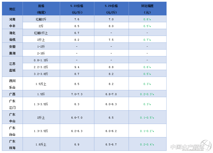 文/ 水產前沿 葉豐齊 2020年鮰魚行情走勢 整體行情綜述 中國水產頻道原創報道,本周各產區鮰魚行情全線下調;河南2斤規格紅鮰下調0.6元/斤,同規格黑鮰下調0.5元/斤;湖北仙桃2斤上紅鮰沒人開價,同規格黑鮰下調0.7元/斤;安徽地區加工廠仍未恢復收魚;江蘇鹽城2.2-3.2斤(平均2.5-2.6斤)規格下調0.6元/斤,3.2-3.8斤(平均3.5-3.6斤)規格下調0.5元/斤;四川樂山1.5斤上規格鮰魚價格下調0.3元/斤;廣西1.5斤上規格池塘魚下調0.2-0.3元/斤,3斤上網箱魚價格保持;廣東加工廠0.8-3斤規格塘頭收購價上調0.1元/斤,中山1.3斤上統貨下調0.2-0.3元/斤,2斤上規格下調0.1-0.5元/斤,江門1.3-3.5斤規格下調0.3元/斤,臺山1.3-3.5斤規格下調0.1-0.2元/斤,珠海1.8斤上規格較上周下調0.2-0.4元/斤。 各產地行情分析 河南地區:新魚大量集中上市,但市場消費力不足,流通不是很順暢,魚價下調;2斤左右規格紅鮰7元/斤,環比上周下調0.6元/斤,同規格黑鮰8元/斤,環比上周下調0.5元/斤。 湖北地區:受河南魚大量上市影響,水車基本都去那邊拉價格較低的魚,本地行情下調;仙桃市2斤以上規格紅鮰基本沒人要,2-4斤規格黑鮰標魚7.5元/斤,環比上周下調0.7元/斤,而3-6斤超標規格7.4元/斤,環比上周下調0.4-0.5元/斤。 安徽地區:巢湖地區加工企業生產線仍在檢修升級,暫未收購斑點叉尾鮰商品魚,但將在6月初恢復收購;因為當地魚要到8、9月份才到上市規格,接下來可能會到廣東收購2斤以上規格魚。 江蘇地區:許多鮰魚終端消費區域餐飲未能完全恢復,市場整體需求量小,價格下調;目前北方貨依然較難走量,業者表示已停止往東北地區發貨,而北京訂單暫時不多,走北京、山東市場的2.2-3.2斤(平均2.5-2.6斤)規格鮰魚約8.8元/斤,環比上周下調0.6元/斤;走西南西北地區的貨也減少了,3.2-3.8斤(平均3.5-3.6斤)規格8.2元/斤,環比上周下調0.5元/斤;據業者反映,現在老口魚大概仍有500萬-600萬斤,而新魚在6月底7月初就上市了,所以養戶要趕在下個月出完魚;另外,養戶也擔心后市行情繼續下行,因此不再觀望,積極出魚,但目前流通比較緩慢,難以走量。 四川地區:樂山1.5斤以上規格黑鮰塘頭價8.2元/斤,環比上周下調0.3元/斤;有業者表示,本地鮰魚終端消費暫時不是很旺,加上有一定量的河南魚入川,市場魚多流通也比較緩慢;目前養戶出魚雖積極,但業者認為上半年不用著急出,可以繼續養一陣子。 廣西地區:3斤上規格網箱魚9.5元/斤,同上周價格,目前網箱魚規格大多在1.7-2斤之間,業者表示不到2斤以上養戶都不大會出魚;以本地市場消費為主的1.5斤規格池塘魚6.8-7元/斤,環比上周下調0.2-0.3元/斤,但賣相好的可以去到7.2元/斤;有業者反映現在很少外地魚入桂,所以市場可以選擇性地調控價格;另外亦有業者建議養戶盡量在6-8月出完老口魚,不然屆時本地新魚集中上市,加上越南巴沙魚入華可能會對鮰魚消費造成一定沖擊,影響下半年的整體行情。 廣東地區:以往走省外市場的2斤上規格魚因高溫運輸問題流通量大降,價格下調;不過近期本地加工廠方面收購量比較大,肇慶振業每天收10萬斤切片,而明基日收5萬-6萬斤開背,0.8-3斤規格塘頭收購價大約6.2元/斤,環比上周上調0.1元/斤;若無藥殘問題,走不了外省市場的大規格魚入廠也不失為一條出路;中山2斤上規格6.5元/斤,環比上周下調0.1-0.5元/斤,1.3斤起統貨6元/斤,環比上周下調0.2-0.3元/斤;江門1.3-3.5斤市場規格6-6.3元/斤,環比上周下調0.3元/斤;臺山1.3-3.5斤規格塘頭價6-6.2元/斤,環比上周下調0.1-0.2元/斤;珠海1.8斤上規格6.5-6.7元/斤,環比上周下調0.2-0.4元/斤。 鮰魚報價 說明:1.上述價格及行情分析僅供參考,市場有風險,入市需謹慎 2.塘頭價指從池塘抓魚價格,紅鮰指紅色斑點叉尾鮰,黑鮰指黑色斑點叉尾鮰 編號:hybj2020-5-29 特別感謝龔旺先生對本文的支持! |