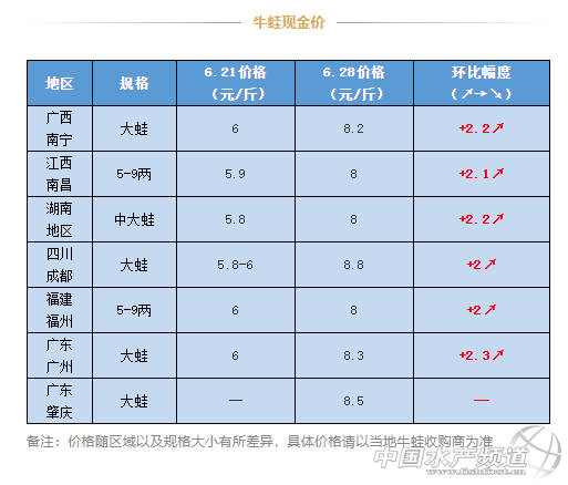 | 中國水產頻道原創報道, 如何在蛙價漲跌的時候都能夠實現盈利?如何養殖健康蛙?敬請關注2020首屆中國蛙類產業云論壇,7月2日開始我們不見不散! 文/水產前沿陳曉慶 蛙界新聞 低迷了一段時間的蛙價近期終于迎來了大漲。除了疫情影響之外,之前蛙價低迷的另外一個重要原因便是病死蛙太多,導致價格無法繼續上漲。即使目前迎來了好的行情,但對于手頭上病死蛙過多的養殖戶來說仍然無法實現盈利。懂得養殖健康蛙的人才能在價格上漲時獲得高效益高回報。2020年初在“新冠疫情”的影響之下,國家、行業對于食品安全問題越加重視,牛蛙綠色健康養殖呼聲也越來越高。 如何在蛙價漲跌的時候都能夠實現盈利?如何養殖健康蛙?敬請關注2020首屆中國蛙類產業云論壇,7月2日開始我們不見不散! 直播入口 ↓↓↓ 牛蛙行情 上周,受北京疫情影響牛蛙價格暴跌1.2元/斤,部分流通商暫停抓蛙。經過上周末兩天的消耗,檔口庫存所剩不多,蛙價也開始回暖。目前過冬蛙存量不斷減少,再加上漲價期養殖戶惜售以及端午節假日期間需求增大,本周蛙價一路猛漲,廣州地區前兩天牛蛙塘口價最高達到9元/斤,肇慶四會賣到9.2元/斤。 但端午節假日一過,牛蛙需求有所減少,蛙價開始出現下跌的跡象。今日福建福州牛蛙現金價8元/斤,欠款8.5元/斤,江西南昌、湖南地區報價8元/斤。“現金價格比較混亂這幾天”收蛙商梁老板表示。廣州今日有收蛙老板報價8.3元/斤,也有人報價8.6元/斤。而廣東肇慶地區、四川成都今日仍然保持著8.5-8.8元/斤的高價。 “前幾天漲價太厲害,有些養殖戶瘋狂喂料,導致牛蛙很多生病,最近收到病蛙非常的多。”收蛙商謝老板表示,最近病蛙開始增多,預計月底蛙價不會繼續增長,但也不會再跌回節前的水平,因為目前的過冬蛙存量的確所剩不多了,新蛙上市仍需等待一段時間。有業內人士預測,下一波漲價高峰還需等到7月中旬左右,屆時蛙價會破十嗎? 黑斑蛙行情 往年青蛙價格在端午節前后會有一個高峰期,但今年受疫情以及“禁野”影響,消費市場還沒完全打開,青蛙庫存未能及時消耗,價格較低,但近期蛙價已經開始出現緩慢的回漲。 |