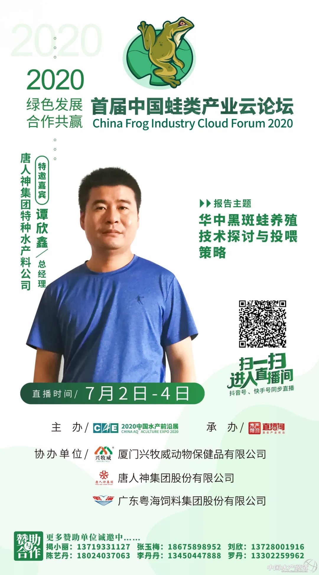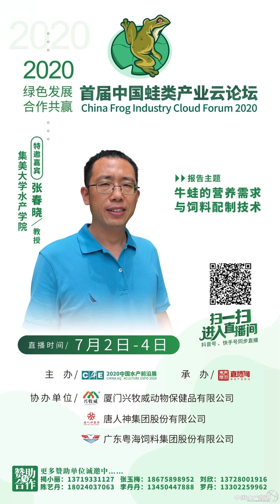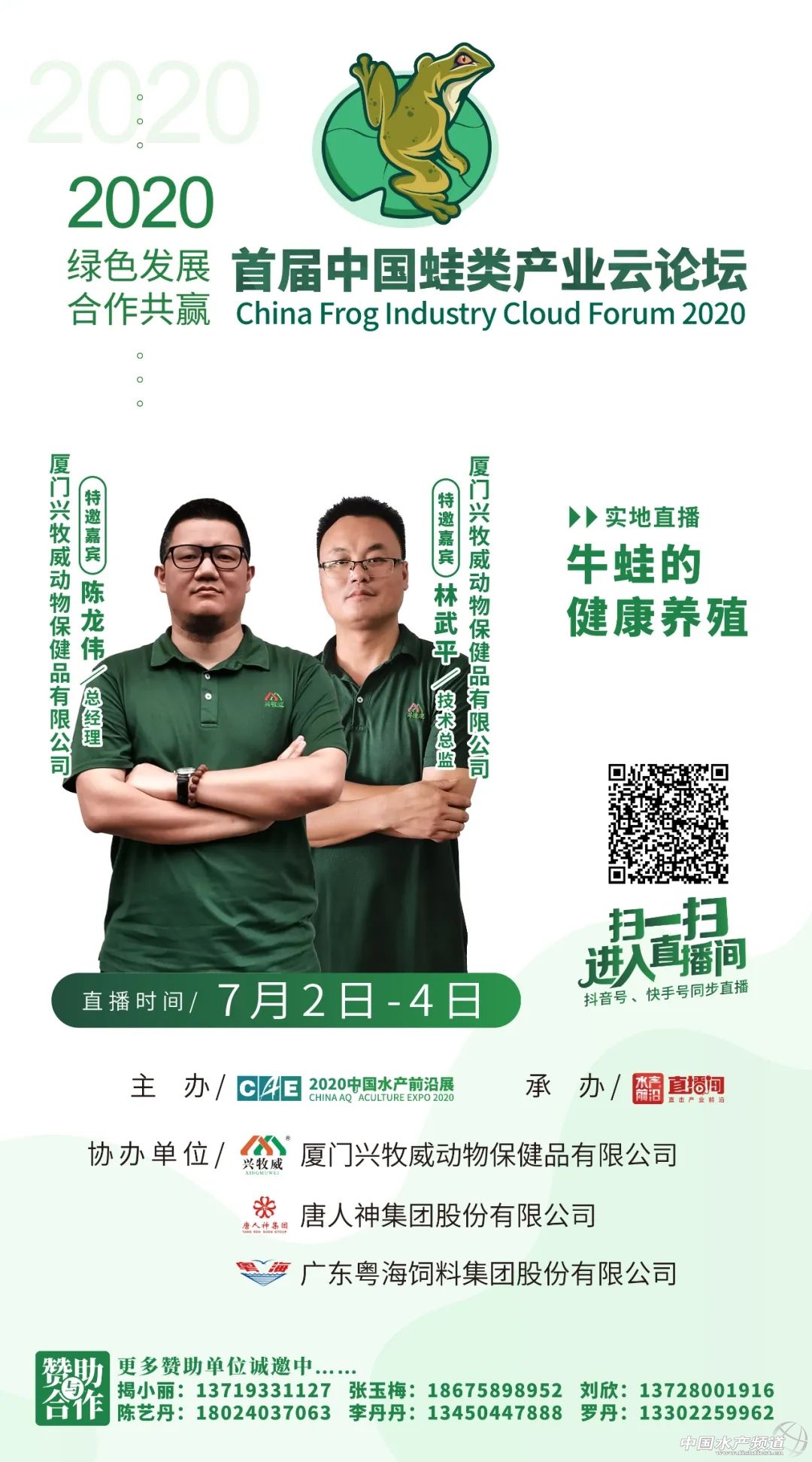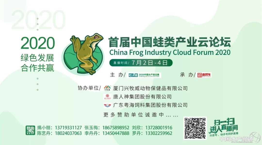 | 中國水產(chǎn)頻道原創(chuàng)報道, 2020年7月2日-4日,鎖定水產(chǎn)前沿直播間,我們不見不散 文/水產(chǎn)前沿陳曉慶 據(jù)統(tǒng)計,2019年全國牛蛙養(yǎng)殖產(chǎn)量50萬噸、黑斑蛙產(chǎn)量8萬噸,整個蛙類產(chǎn)業(yè)鏈價值超2000億人民幣。以蛙類為主題的餐廳也從2017年下半年開始火遍全網(wǎng)。 但在生產(chǎn)端,蛙類養(yǎng)殖目前還存在著很多問題,特別是養(yǎng)殖環(huán)境、食品安全方面,仍然存在著隱患。在經(jīng)歷了新冠期間的“禁養(yǎng)禁食”風(fēng)波劫難之后,黑斑蛙、牛蛙等徹底解決了身份問題,但接下來還要面對的是如何實現(xiàn)行業(yè)可持續(xù)發(fā)展等問題。蛙類消費端的需求日益增長,值得業(yè)者與行業(yè)企業(yè)大力開拓創(chuàng)新,合力解決發(fā)展中的問題。 針對于此,水產(chǎn)前沿將聯(lián)合蛙類產(chǎn)業(yè)領(lǐng)域最前沿專家、企業(yè),一起探究2020年蛙類養(yǎng)殖策略,為綠色健康養(yǎng)殖建言獻(xiàn)策。 【云論壇主題】 綠色發(fā)展•合作共贏 【組織單位】 主辦: 中國水產(chǎn)前沿展 承辦: 水產(chǎn)前沿+直播 水產(chǎn)前沿短視頻 協(xié)辦: 廈門興牧威動物保健品有限公司 唐人神集團(tuán)股份有限公司 廣東粵海飼料集團(tuán)股份有限公司 更多贊助單位誠邀中…… 【直播時間及入口】 直播時間 2020年7月2日-4日 直播入口 ↓↓↓ 【特邀嘉賓】 報告題目:牛蛙的營養(yǎng)需求與飼料配制技術(shù) 特邀嘉賓:集美大學(xué)水產(chǎn)學(xué)院張春曉教授 張春曉:博士,集美大學(xué)水產(chǎn)學(xué)院院長、教授、博士生導(dǎo)師,國家海水魚產(chǎn)業(yè)技術(shù)體系海鱸營養(yǎng)需求與飼料崗位科學(xué)家,福建省高校新世紀(jì)優(yōu)秀人才,兼任中國水產(chǎn)學(xué)會水產(chǎn)動物營養(yǎng)與飼料專業(yè)委員會委員、中國水產(chǎn)學(xué)會青年工作委員會秘書長、福建省水產(chǎn)學(xué)會常務(wù)理事。長期從事水產(chǎn)動物營養(yǎng)與飼料學(xué)領(lǐng)域的理論和應(yīng)用研究,曾主持國家自然科學(xué)基金、公益性農(nóng)業(yè)行業(yè)專項子項目以及省市和橫向等各類科研項目20余項。獲教育部科技進(jìn)步一等獎1項,在國內(nèi)外刊物發(fā)表論文60余篇,其中SCI收錄30余篇;參編教材1部,譯著1部;授權(quán)國家發(fā)明專利10項,其中3項專利已向企業(yè)有償轉(zhuǎn)讓。 報告題目:蛙類健康養(yǎng)殖問題與對策 特邀嘉賓:湖南農(nóng)業(yè)大學(xué)動物科學(xué)技術(shù)學(xué)院陳開健博士、副教授 陳開健:1989年畢業(yè)于湖南農(nóng)學(xué)院牧水系。陳開健副教授研究方向為水產(chǎn)養(yǎng)殖,主要開展水產(chǎn)動物營養(yǎng)與品質(zhì)、水產(chǎn)生態(tài)模式、淡水龍蝦、蛙類產(chǎn)業(yè)化等研究。2012年以來多年擔(dān)任湖南省、長沙市、長沙縣、望城區(qū)科技特派員、企業(yè)的相關(guān)研發(fā)項目等工作,促進(jìn)了水產(chǎn)養(yǎng)殖產(chǎn)業(yè)的發(fā)展。陳開健副教授從教近三十年,出版國家級教材《水產(chǎn)養(yǎng)殖工程學(xué)》(副主編,中國農(nóng)業(yè)出版社)、《淡水小龍蝦健康養(yǎng)殖技術(shù)》(副主編),參編《餌料生物學(xué)》、《水產(chǎn)動物行為與行為生態(tài)學(xué)》、《水產(chǎn)養(yǎng)殖專業(yè)技能學(xué)》教材;參加完成國家863中試計劃、主持省級重點項目1項,科技攻關(guān)項目2個,其他項目多項,主要參與國家自科基金項目一項,其他項目多項;主持洮水水庫生態(tài)漁業(yè)利用規(guī)劃、柘溪水庫生態(tài)漁業(yè)規(guī)劃、天心區(qū)水域灘涂規(guī)劃以及作為長沙市水產(chǎn)百里走廊規(guī)劃和古丈棲鳳湖生態(tài)漁業(yè)規(guī)劃主要參與者等;水產(chǎn)核心期刊發(fā)表論文40余篇,其中SCI5篇,發(fā)明專利3個,實用新型專業(yè)7個,主持制定標(biāo)準(zhǔn)1項,參與標(biāo)準(zhǔn)制定3個;已培養(yǎng)碩士研究生5名,發(fā)明專利8項,其他專利多項,省教學(xué)成果二等獎1項,教學(xué)成果獎一等獎2項,湖南省科技進(jìn)步二等獎2項,廳級科技獎2項。主要社會兼職:中國水產(chǎn)學(xué)會會員,湖南省水產(chǎn)學(xué)會會員,中國淡水龍蝦會員,長沙市遠(yuǎn)程教育專家,長沙市科技助農(nóng)直通車水產(chǎn)咨詢專家。 報告題目:蛙類養(yǎng)殖病害的發(fā)生和控制 特邀嘉賓:湖南省水產(chǎn)科學(xué)研究所魚病研究室宋銳主任 宋銳:理學(xué)博士,水產(chǎn)高級工程師,湖南省水產(chǎn)學(xué)會常務(wù)理事。2011年7月博士畢業(yè)于中國科學(xué)院水生生物研究所,2012年3月至今在湖南省水產(chǎn)科學(xué)研究所科研部工作,主要從事水產(chǎn)經(jīng)濟(jì)動物病害防控工作。2014年起,任魚病研究室主任,主持魚病研究室工作。獲得農(nóng)業(yè)部農(nóng)林牧漁豐收獎二等級1項,湖南省農(nóng)業(yè)豐收獎一等獎1項,發(fā)表論文10余篇,其中SCI收錄8篇,參編專著5部,獲得實用新型專利3項,制定地方標(biāo)準(zhǔn)1項。 實地直播:牛蛙的健康養(yǎng)殖 互動嘉賓:廈門興牧威動物保健品有限公司陳龍偉總經(jīng)理 采訪嘉賓:廈門興牧威動物保健品有限公司林武平技術(shù)總監(jiān) 陳龍偉:廈門興牧威動物保健品有限公司總經(jīng)理,2002年從事牛蛙產(chǎn)業(yè)至今,綠色