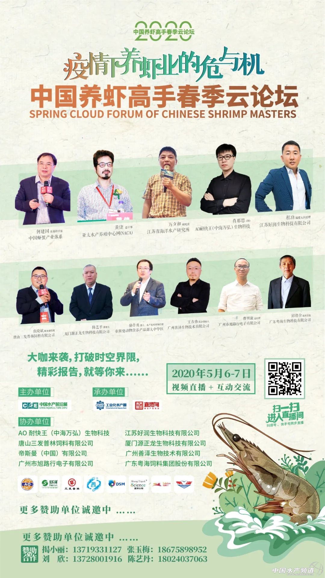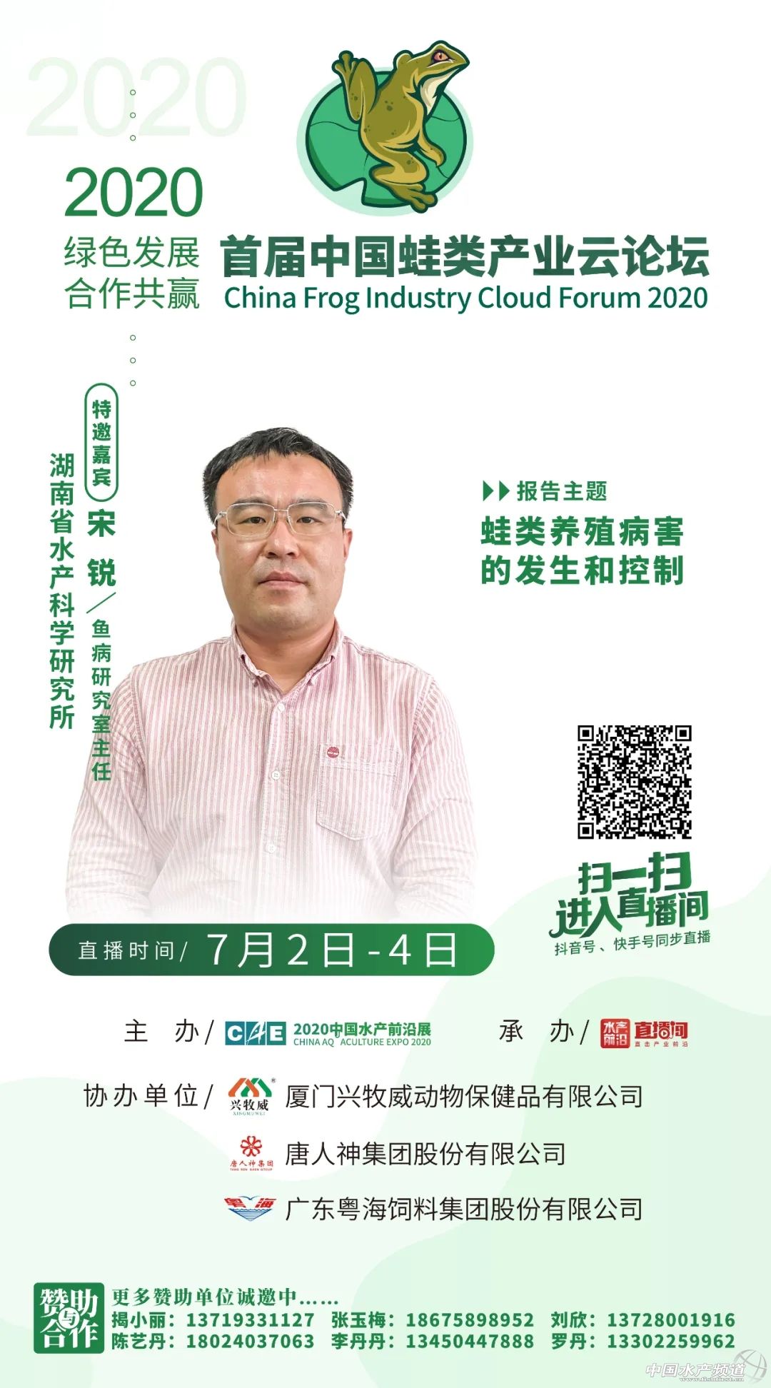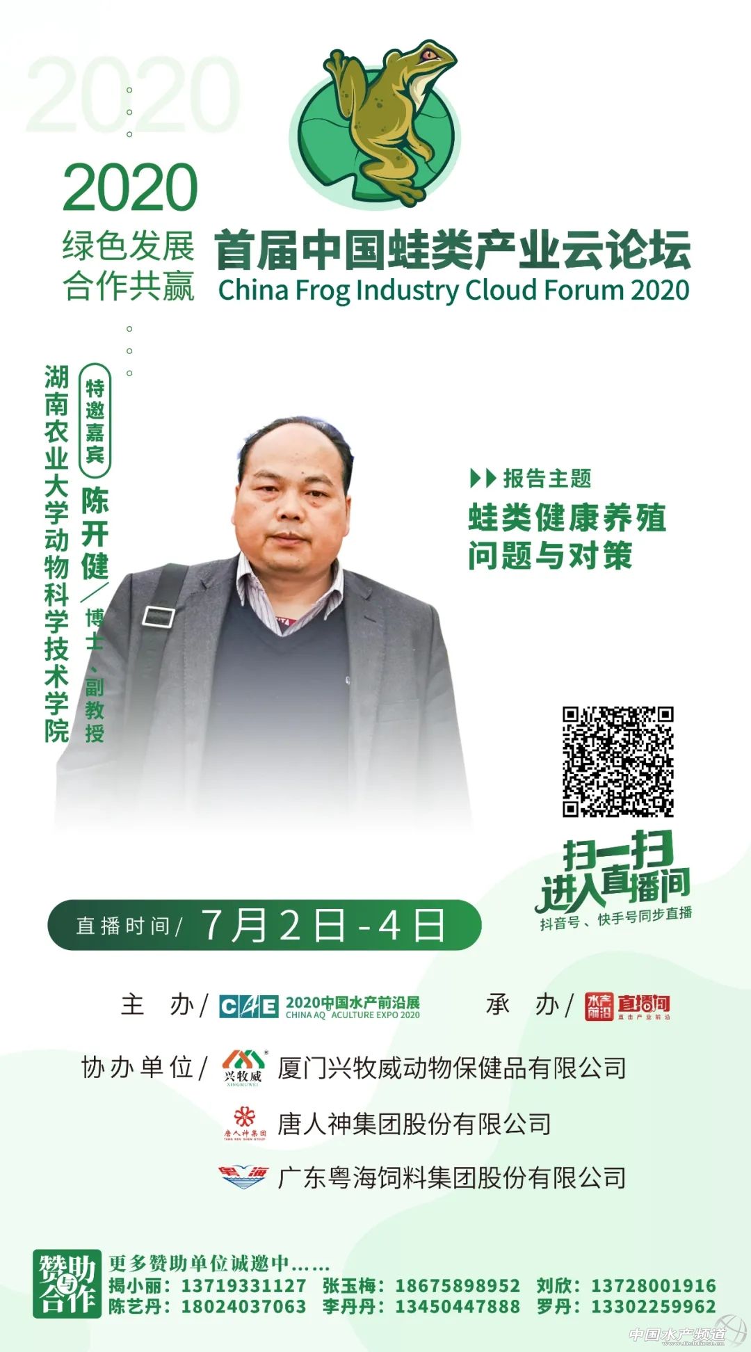 | 中國水產(chǎn)頻道原創(chuàng)報道, 2020年7月2日-4日,鎖定水產(chǎn)前沿直播間,我們不見不散 文/水產(chǎn)前沿陳曉慶 據(jù)統(tǒng)計,2019年全國牛蛙養(yǎng)殖產(chǎn)量50萬噸、黑斑蛙產(chǎn)量8萬噸,整個蛙類產(chǎn)業(yè)鏈價值超2000億人民幣。以蛙類為主題的餐廳也從2017年下半年開始火遍全網(wǎng)。 但在生產(chǎn)端,蛙類養(yǎng)殖目前還存在著很多問題,特別是養(yǎng)殖環(huán)境、食品安全方面,仍然存在著隱患。在經(jīng)歷了新冠期間的“禁養(yǎng)禁食”風(fēng)波劫難之后,黑斑蛙、牛蛙等徹底解決了身份問題,但接下來還要面對的是如何實現(xiàn)行業(yè)可持續(xù)發(fā)展等問題。蛙類消費端的需求日益增長,值得業(yè)者與行業(yè)企業(yè)大力開拓創(chuàng)新,合力解決發(fā)展中的問題。 針對于此,水產(chǎn)前沿將聯(lián)合蛙類產(chǎn)業(yè)領(lǐng)域最前沿專家、企業(yè),一起探究2020年蛙類養(yǎng)殖策略,為綠色健康養(yǎng)殖建言獻(xiàn)策。 【云論壇主題】 綠色發(fā)展•合作共贏 【組織單位】 主辦: 中國水產(chǎn)前沿展 承辦: 水產(chǎn)前沿+直播 水產(chǎn)前沿短視頻 協(xié)辦: 廈門興牧威動物保健品有限公司 唐人神集團(tuán)股份有限公司 廣東粵海飼料集團(tuán)股份有限公司 更多贊助單位誠邀中…… 【直播時間及入口】 直播時間 2020年7月2日-4日 直播入口 ↓↓↓ 【特邀嘉賓】 報告題目:牛蛙的營養(yǎng)需求與飼料配制技術(shù) 特邀嘉賓:集美大學(xué)水產(chǎn)學(xué)院張春曉教授 張春曉:博士,集美大學(xué)水產(chǎn)學(xué)院院長、教授、博士生導(dǎo)師,國家海水魚產(chǎn)業(yè)技術(shù)體系海鱸營養(yǎng)需求與飼料崗位科學(xué)家,福建省高校新世紀(jì)優(yōu)秀人才,兼任中國水產(chǎn)學(xué)會水產(chǎn)動物營養(yǎng)與飼料專業(yè)委員會委員、中國水產(chǎn)學(xué)會青年工作委員會秘書長、福建省水產(chǎn)學(xué)會常務(wù)理事。長期從事水產(chǎn)動物營養(yǎng)與飼料學(xué)領(lǐng)域的理論和應(yīng)用研究,曾主持國家自然科學(xué)基金、公益性農(nóng)業(yè)行業(yè)專項子項目以及省市和橫向等各類科研項目20余項。獲教育部科技進(jìn)步一等獎1項,在國內(nèi)外刊物發(fā)表論文60余篇,其中SCI收錄30余篇;參編教材1部,譯著1部;授權(quán)國家發(fā)明專利10項,其中3項專利已向企業(yè)有償轉(zhuǎn)讓。 報告題目:蛙類健康養(yǎng)殖問題與對策 特邀嘉賓:湖南農(nóng)業(yè)大學(xué)動物科學(xué)技術(shù)學(xué)院陳開健博士、副教授 陳開健:1989年畢業(yè)于湖南農(nóng)學(xué)院牧水系。陳開健副教授研究方向為水產(chǎn)養(yǎng)殖,主要開展水產(chǎn)動物營養(yǎng)與品質(zhì)、水產(chǎn)生態(tài)模式、淡水龍蝦、蛙類產(chǎn)業(yè)化等研究。2012年以來多年擔(dān)任湖南省、長沙市、長沙縣、望城區(qū)科技特派員、企業(yè)的相關(guān)研發(fā)項目等工作,促進(jìn)了水產(chǎn)養(yǎng)殖產(chǎn)業(yè)的發(fā)展。陳開健副教授從教近三十年,出版國家級教材《水產(chǎn)養(yǎng)殖工程學(xué)》(副主編,中國農(nóng)業(yè)出版社)、《淡水小龍蝦健康養(yǎng)殖技術(shù)》(副主編),參編《餌料生物學(xué)》、《水產(chǎn)動物行為與行為生態(tài)學(xué)》、《水產(chǎn)養(yǎng)殖專業(yè)技能學(xué)》教材;參加完成國家863中試計劃、主持省級重點項目1項,科技攻關(guān)項目2個,其他項目多項,主要參與國家自科基金項目一項,其他項目多項;主持洮水水庫生態(tài)漁業(yè)利用規(guī)劃、柘溪水庫生態(tài)漁業(yè)規(guī)劃、天心區(qū)水域灘涂規(guī)劃以及作為長沙市水產(chǎn)百里走廊規(guī)劃和古丈棲鳳湖生態(tài)漁業(yè)規(guī)劃主要參與者等;水產(chǎn)核心期刊發(fā)表論文40余篇,其中SCI5篇,發(fā)明專利3個,實用新型專業(yè)7個,主持制定標(biāo)準(zhǔn)1項,參與標(biāo)準(zhǔn)制定3個;已培養(yǎng)碩士研究生5名,發(fā)明專利8項,其他專利多項,省教學(xué)成果二等獎1項,教學(xué)成果獎一等獎2項,湖南省科技進(jìn)步二等獎2項,廳級科技獎2項。主要社會兼職:中國水產(chǎn)學(xué)會會員,湖南省水產(chǎn)學(xué)會會員,中國淡水龍蝦會員,長沙市遠(yuǎn)程教育專家,長沙市科技助農(nóng)直通車水產(chǎn)咨詢專家。 報告題目:蛙類養(yǎng)殖病害的發(fā)生和控制 特邀嘉賓:湖南省水產(chǎn)科學(xué)研究所魚病研究室宋銳主任 宋銳:理學(xué)博士,水產(chǎn)高級工程師,湖南省水產(chǎn)學(xué)會常務(wù)理事。2011年7月博士畢業(yè)于中國科學(xué)院水生生物研究所,2012年3月至今在湖南省水產(chǎn)科學(xué)研究所科研部工作,主要從事水產(chǎn)經(jīng)濟(jì)動物病害防控工作。2014年起,任魚病研究室主任,主持魚病研究室工作。獲得農(nóng)業(yè)部農(nóng)林牧漁豐收獎二等級1項,湖南省農(nóng)業(yè)豐收獎一等獎1項,發(fā)表論文10余篇,其中SCI收錄8篇,參編專著5部,獲得實用新型專利3項,制定地方標(biāo)準(zhǔn)1項。 實地直播:牛蛙的健康養(yǎng)殖 互動嘉賓:廈門興牧威動物保健品有限公司陳龍偉總經(jīng)理 采訪嘉賓:廈門興牧威動物保健品有限公司林武平技術(shù)總監(jiān) 陳龍偉:廈門興牧威動物保健品有限公司總經(jīng)理,2002年從事牛蛙產(chǎn)業(yè)至今,綠色