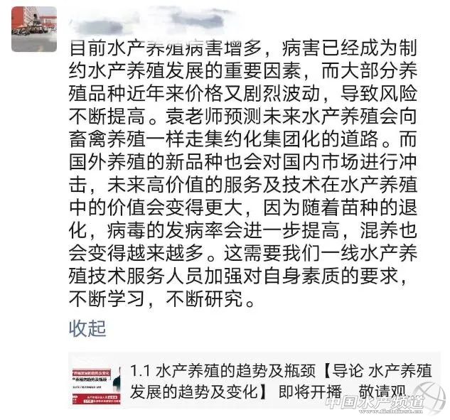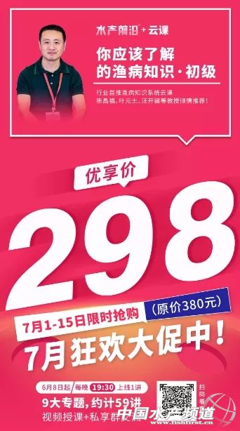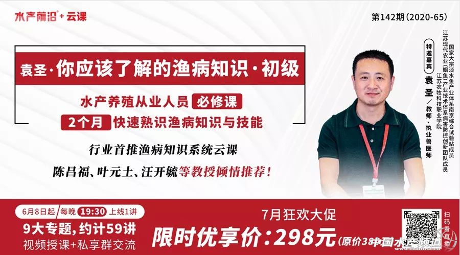 | 中國水產(chǎn)頻道獨家報道, 2個月快速掌握漁病知識與技能!《袁圣·你應該了解的漁病知識·初級》,7月限時狂歡大促中~ 文/水產(chǎn)前沿李曉欣 《袁圣·你應該了解的漁病知識·初級》 2個月快速掌握漁病知識與技能 7月限時大促中! ↓↓↓ 自6月8日起每晚19:30,水產(chǎn)前沿特邀江蘇農(nóng)牧科技職業(yè)學院教師、職業(yè)執(zhí)業(yè)獸醫(yī)師袁圣老師,開設《你應該了解的漁病知識·初級》系列云課,9大專題,共計59講,每晚上線1講,截至目前(7月2日)已經(jīng)上線了24講。 系列云課上線后人氣爆棚、好評如潮,許多養(yǎng)殖戶、技術員、一線漁醫(yī)等水產(chǎn)從業(yè)人員報名收看了課程,更有多家企業(yè)、單位自發(fā)團購,積極發(fā)動公司員工“進修”,大家紛紛表示收獲良多~以下截圖自袁老師系列課的交流群: 此次系列云課更是得到了業(yè)界多位資深實戰(zhàn)專家、企業(yè)大咖的傾情推薦,萬分感謝!以下為部分摘選: 華中農(nóng)業(yè)大學陳昌福教授 袁圣老師是我非常熟悉的一位年輕有為的老師,既具有理論知識,又有實踐經(jīng)驗,說實在的,在我們國家這么年輕又有實干精神的老師還真不多了,大家有機會能夠聆聽他的課程應該是非常幸運的。 蘇州大學葉元土教授 漁病防治是一項復雜的系統(tǒng)工程,既需要科學的診斷技術,也需要精準的用藥方法,還需要實戰(zhàn)經(jīng)驗的指導。我與袁圣老師有過長時間的合作交流,他是一位帶草帽跑魚塘的專家,幫助過很多的養(yǎng)殖戶挽回了重大的經(jīng)濟的損失,是值得我們尊敬和喜愛的一名科學家。我既是袁圣老師的粉絲,也是水產(chǎn)前沿的忠實粉絲,水產(chǎn)前沿更是我們?nèi)w水產(chǎn)人的共享平臺。本人極力推薦大家,6月8號以后每天晚上7點半,大家看完新聞聯(lián)播后就鎖定水產(chǎn)前沿直播間,收看袁圣老師的系列課程。大家多學點漁病知識,減少養(yǎng)殖損失,多賺點錢,謝謝! 四川農(nóng)業(yè)大學汪開毓教授 目前我國水產(chǎn)行業(yè)就正缺這么一部比較系統(tǒng)完整,由基礎入門到逐步提高精通的系列魚病視頻教程。當前我國水產(chǎn)養(yǎng)殖因病害發(fā)生造成的損失很嚴重,在生產(chǎn)一線的許多從事魚病診療技術人員,正需要有個系統(tǒng)地培訓和提高,尤其是理論和實踐的結(jié)合,實際案例的規(guī)范操作示范示教,這樣才能真正實現(xiàn)培訓提高魚病診療技術水平的目的,袁圣老師的這套系列課程為魚病診療入門打基礎,是通向漁醫(yī)行家很好的學習階梯。 中國漁業(yè)協(xié)會水產(chǎn)養(yǎng)殖投入品分會會長、江蘇天石生物科技有限公司總經(jīng)理邢華 當前已經(jīng)進入到水產(chǎn)病害高發(fā)時期,面對著廠家五花八門的所謂技術服務,事實上藥害事故也頻頻發(fā)生,養(yǎng)殖業(yè)者無可適從,亟需有經(jīng)驗、有理論的實戰(zhàn)獸醫(yī)幫助,袁圣老師就是這樣一位有豐富實戰(zhàn)經(jīng)驗及扎實理論基礎的好獸醫(yī),他的講課既有趣味性又有實戰(zhàn)防病技術指導性。 海大集團華東區(qū)副總裁、南通海大生物科技有限公司總經(jīng)理繆建海 當前正是魚病肆虐、氣候多變的時候,我們看到市場上有很多令人心痛的發(fā)病案例,也看到養(yǎng)殖戶面對魚病時的束手無策,病急亂投醫(yī)、亂用藥,最后反而導致治療效果不好,極大地影響了養(yǎng)殖節(jié)奏和養(yǎng)殖效益,出現(xiàn)這樣的問題,深層次的原因是養(yǎng)殖戶朋友缺乏對魚病理論體系及魚藥理論知識的認知。袁圣老師長期奔走在養(yǎng)殖一線,具有非常豐富的理論體系和實踐經(jīng)驗,相信在收看袁圣老師的系列課程后,對您在養(yǎng)殖生產(chǎn)、日程管理等方面會有比較大的好處,請不要錯過, 江蘇世昌農(nóng)牧股份有限公司董事長袁珍虎 早預防、早診斷、早治療是防治漁病的關鍵,袁圣老師具有豐富的理論知識和實踐經(jīng)驗,是一位接地氣的專家,在大江南北解決了很多養(yǎng)殖戶的技術難題,深受農(nóng)戶喜愛。 無錫三智生物科技有限公司總經(jīng)理蔣蓉 近年來養(yǎng)殖動物疾病頻發(fā)造成了很大的損失,但是對漁病的理解還有很多的誤區(qū),如何正確地認識漁病?如何正確地預防與治療?如何進行綠色健康養(yǎng)殖?這里面還有太多的困惑。袁圣老師在漁病防治方面有著豐富的一線經(jīng)驗,請大家鎖定水產(chǎn)前沿直播間由袁圣老師帶來的《你應該了解的漁病知識》系列課程,真正地認識漁病,相信大家都會收獲滿滿。 江蘇祥豪生物科技有限公司總經(jīng)理王大榮 今年全國各地很多養(yǎng)殖魚類品種暴發(fā)性疾病比較嚴重,養(yǎng)戶經(jīng)濟損失很大,6月8日開始每晚7點半,請大家鎖定水產(chǎn)前沿直播間,傾聽一線水產(chǎn)漁醫(yī)袁圣老師講魚病。 …… 比你優(yōu)秀的人都在努力學習 還不快快上車~ ↓↓↓ 講師簡介 袁圣 江蘇農(nóng)牧科技職業(yè)學院教師,執(zhí)業(yè)獸醫(yī)師,國家大宗淡水魚產(chǎn)業(yè)技術體系南京綜合試驗站及江蘇現(xiàn)代農(nóng)業(yè)(鮰魚)產(chǎn)業(yè)技術體系病害防控創(chuàng)新團隊成員,中國漁業(yè)協(xié)會水產(chǎn)投入品分會專家委員會委員,長期在養(yǎng)殖一線從事魚病防治工作,對常見魚類病害有較深的理解。 課程亮點 ■打破時空界限:足不出戶,2個月快速
