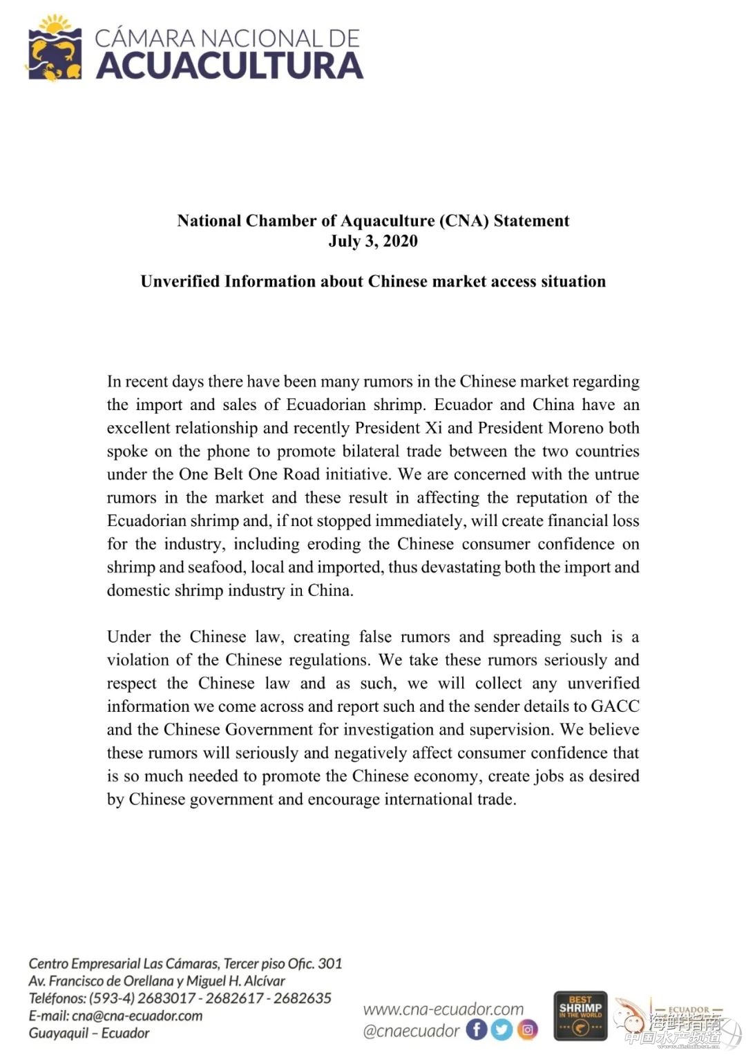 | 中國水產頻道原創報道, 沸沸揚揚的“厄瓜多爾白蝦工廠遭遇封禁”終于落下帷幕!謠言瘋傳背后,是誰在推波助瀾? 文/海鮮指南(seafood-guide)李帥 真假封禁撲朔迷離! 塵埃落定,關于業內沸沸揚揚的“部分厄瓜多爾對蝦工廠遭遇封禁”傳言,終于有官方機構出來發聲澄清。 回顧這起事件,從時間線上看,最早是6月29日,國內進口商通過微信群、朋友圈等渠道散播“某多爾蝦工廠在碼頭無法提貨,實際上為海關封禁”。不明就里的其他業者在這種氛圍的帶動下,紛紛做出了自己的應對。 而一直到7月3日(上周五),尚未有任何官方文件發布,事件的真假一時撲朔迷離。 封禁是謠言!厄瓜多爾水產養殖協會官方發文澄清! 直至7月5日下午,有白蝦業者在朋友圈發布了一份“厄瓜多爾國家水產養殖協會(CNA)關于不實傳言的通知”: 通知原件 在通知中,厄瓜多爾水產養殖協會表示: 近日,中國市場上關于厄瓜多爾蝦的進口和銷售的傳聞層出不窮。厄瓜多爾和中國有著良好的關系,最近習近平主席和莫雷諾總統都通了電話,推動兩國在“一帶一路”倡議下的雙邊貿易。我們關注市場上的不實傳言,這些謠言會影響厄瓜多爾蝦的聲譽,如果不立即制止,將給該行業造成經濟損失,包括削弱中國消費者對本地和進口蝦等海鮮的信心,從而破壞了中國的進口蝦業和國內蝦業。 根據中國法律,制造虛假謠言并散布謠言是違反中國法規的。我們認真對待這些謠言,尊重中國法律,因此,我們會收集任何未經證實的信息,并將這些信息和發送者的詳細信息報告給GACC和中國政府,以進行調查和監督。我們相信,這些謠言將嚴重和消極地影響消費者的信心,而消費者信心是促進中國經濟、創造中國政府所希望的就業機會和鼓勵國際貿易所急需的。 謠言為何被瘋傳?揭秘背后的深層原因! 厄瓜多爾官方辟謠文件發出后,海鮮指南找到了最早發布的進口商,該進口商表示,“這是厄瓜多爾的官方辟謠文件,是國外工廠發給她的。”而另外一位進口商也告訴海鮮指南,他也收到了這份辟謠文件,是溫萊工廠發給他的。 據海鮮指南了解,本次傳言中被封禁的品牌并沒有溫萊。海鮮指南又向桑塔工廠確認該辟謠文件的真偽,桑塔代表回復,“這份文件是真實的,現在還是要看看下個星期是什么情況,希望一切都沒問題! 此次事件到此,總算是有一個官方的回應,也讓許多人長舒一口氣。但同時,又讓許多業者覺得十分荒誕,據海鮮指南了解,這已經不是第一次出現“白蝦工廠遭封禁”的類似謠言了,早在去年年底(12月),業內就傳了一段時間“白蝦再次檢出疫病”消息,后來被證實是假消息。 為何小小的一只白蝦,卻會產生層出不窮的流言蜚語呢?有業者分析到,“終究還是國內的庫存太多了,疫情又讓流通和消費疲軟,國內囤貨的人都崩了一根弦,虧損得都有點神經兮兮,每一次造謠的目的都很簡單啊,就是讓白蝦漲價,我也能理解這種心態,事實上,凡是做這只蝦的,現在誰不盼望著漲價呢?” “所以這種消息一經傳出,不管真假,大家都會添一把柴,一起推波助瀾,我們其實不太關心消息的真假,因為國內的現貨已經夠賣了。即使消息是真的,對海上飄的貨和接下來的訂單才有影響。但是經歷過去年真的封禁之后,誰都怕自己成了新的接盤俠! “但是事實總是打造謠人的臉,哪怕你再怎么炒作,市場行情還是不為所動,這說明了什么?大家都心知肚明,現在這種情況,消費跟不上去,庫存高企,不解決根本問題,白蝦是很難漲起來的,白蝦又不像股市。 |