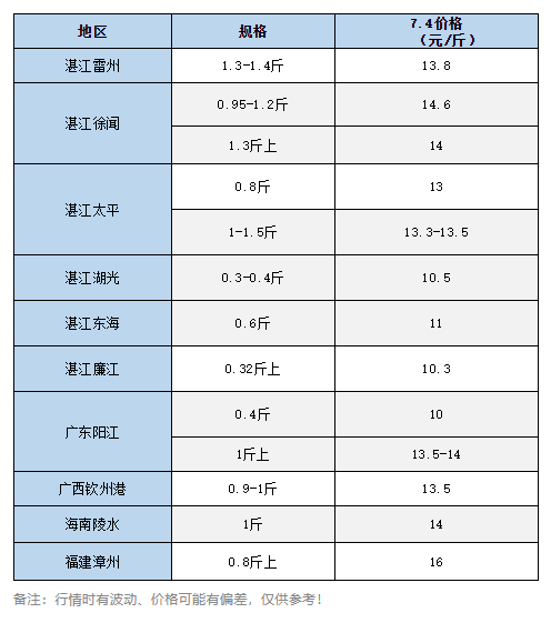 | 中國水產頻道報道, 最近,隨著華南地區越冬金鯧魚存量逐漸減少,加上土塘養殖接近尾聲,本周金鯧魚整體行情呈現穩中有漲的態勢。據業內人士表示,目前大規格越冬魚以及凍廠庫存量均不多,而市場需求量大,預計接下來的魚價還會繼續保持上升的勢頭。 湛江地區越冬金鯧魚存量不多,現在出魚相對較少,有部分養殖戶持魚等價,也有部分養殖戶繼續養殖,等魚大了再賣,有重量才有更高的價格。據徐聞一養殖戶反映,目前有個別魚販子聯系他們抓魚,價格稍微會高一些,與上周相比,魚價上漲1.2元/斤左右。本周價格方面,雷州1.3-1.4斤規格13.8元/斤;徐聞0.95-1.2斤規格14.6元/斤,1.3斤以上14元/斤;太平0.8斤規格13元/斤,1-1.5斤13.3-13.5元/斤。陽江地區存魚量相比湛江地區較多,現在基本每天都在出魚,較上周的價格也呈上漲趨勢。 粵西地區土塘養殖方面,湛江廉江金鯧魚基本抓完了,大多數養殖戶計劃7月中旬開始放苗。陽江地區魚塘發病率比前段時間稍微好轉,現在存塘量有3-4成左右,許多養殖戶計劃月底賣完。本周陽江魚塘報價0.4斤規格10元/斤;湛江湖光0.3-0.4斤10.5元/斤,東海0.6斤11元/斤,廉江0.32斤以上10.3元/斤;與上周相比,塘魚的價格也有所上漲。 |