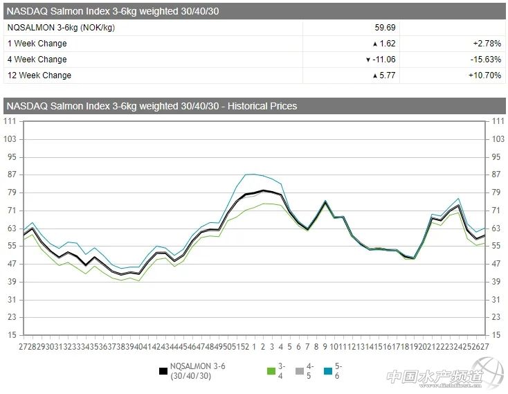 | 中國水產頻道報道, 6kg以上規格三文魚價格上漲較大,上漲約NOK 3/kg。 作者/UCN 編譯/胡路怡 2020年第27周,挪威養殖大西洋鮭市場價格開始回彈。納斯達克三文魚指數顯示,挪威三文魚均價為NOK 58.82/kg,較上一周上漲NOK 1.68/kg,漲幅2.94%,但相比一個月前的價格,仍有14.71%的跌幅。 其中,6kg以上規格三文魚價格上漲明顯,6-7公斤漲幅為NOK 3.07/kg,4-5公斤漲幅為NOK 1.85/kg。 另據Fish Pool的統計,第27周挪威三文魚價格為NOK 59.69/kg,較一周前上漲NOK 1.62/kg,漲幅2.78%,但較一個月前下跌15.63%。第27周,挪威出口16,147噸三文魚,出口量較去年同期增長2.2%。(本文轉自【UCN國際海產資訊】。如有版權問題,敬請聯系wx@fishfirst.cn。) |