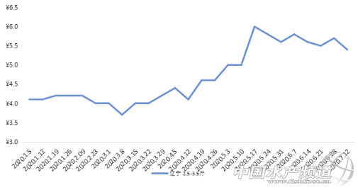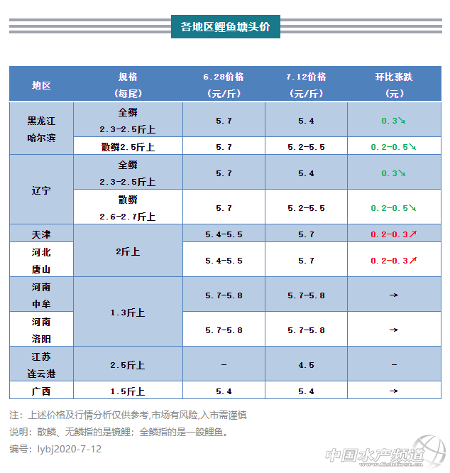 | 中國水產頻道原創報道, 文/水產前沿葉豐齊 代表產區鯉魚行情走勢 整體行情綜述 本周鯉魚價格大致平穩,部分地區略有波動,最大產區行情因新魚上市下行;黑龍江和遼寧2.5斤以上規格全鱗鯉魚價格較之前皆下調0.3元/斤,同規格散鱗價格下調0.2-0.5元/斤;天津和唐山地區2斤上新魚較上周皆上調0.2-0.3元/斤;河南中牟和洛陽1.3斤上規格鯉魚價格保持不變;廣西1.5斤上規格鯉魚價格穩定,與之前一致。 本周各地區鯉魚行情一覽 東北地區:新魚開始大量上市,但據業者反映老口魚還有不少,雖然市場較偏好后者,但整體行情依然受到沖擊,魚販訂魚找魚也不容易,養戶久等沒等到價,繼續觀望和積極出魚的都有;黑龍江與遼寧2.5斤以上規格全鱗鯉魚塘頭價5.4元/斤,環比之前下調0.3元/斤;2.5斤以上規格散鱗鏡鯉老魚塘頭價同是5.5元/斤,環比之前下調0.2元/斤,新魚5.2元/斤,下調0.5元/斤。 河北唐山和天津地區:唐山和天津2斤上規格新魚塘頭價5.7,環比之前上調0.2-0.3元/斤;業者表示目前出魚正常,老魚基本沒有了,新魚夠規格價好養戶便出,先打一網然后剩下的繼續養,觀望后市行情走勢。 河南地區:1.5斤以上規格鄭州中牟塘頭價5.7-5.8元/斤,保持之前價格,洛陽塘頭價同是5.7-5.8元/斤;本地大規格新苗要到8月份才上市,現在就洛陽和商丘還有一點點存魚,正處于青黃不接時期,預計行情將保持至新魚批量出魚。 廣西地區:1.5-2斤規格走本地市場塘頭價5.4元/斤,同之前價格;2斤上走當地釣場大規格塘頭價約5.9元/斤,保持不變;預計今后行情會保持穩定或略有浮動,變化理應不大。 |