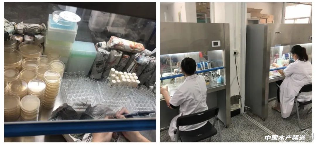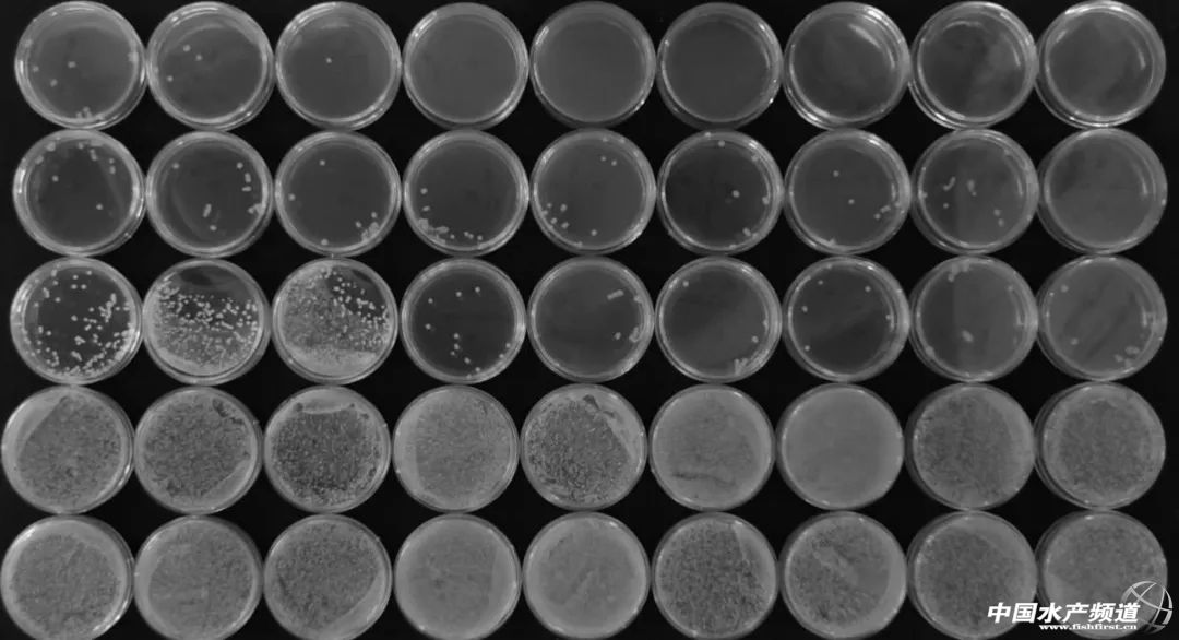 | 中國水產頻道原創報道, 二氧化氯片劑使用方法對其養殖水體中消毒效果之比較 文/ 華中農業大學 陳昌福、武漢科研時代生物技術有限公司 周鑫軍 在水產養殖過程中,采用各種消毒劑實施所謂的“四消”(苗種、餌料、工具和食場消毒),已經是我國水產養殖業者對水產養殖動物疾病防控中采用的常規措施。 二氧化氯(分子式為ClO2)雖然作為“國標漁藥”已經被農業農村部移出了清單,但是,不少漁藥制售企業將其作為“非藥品”,迄今為止依然在水產養殖中被大量地使用著。 在水產養殖過程中使用的ClO2制劑大致有3種劑型,即水劑、粉劑和片劑。利用ClO2水劑對養殖水體進行消毒時,只需要在測量水體后根據養殖水體體積,直接潑灑ClO2水劑至養殖水體中達到一定藥物濃度即可;利用ClO2粉劑對養殖水體進行消毒時,就需要先用少量池水將ClO2粉劑稀釋、活化15分鐘 左右后,再將其潑灑在養殖水體中達到一定藥物濃度;而采用ClO2片劑時,養殖業者大多是根據產品說明書中規定的用藥劑量,采用直接將其ClO2片劑拋灑在養殖水體中的用藥方法。 為了探討不同劑型的ClO2制劑的使用方法對養殖水體消毒效果的影響,本試驗利用檢測消毒后養殖池水中可培養細菌數量變化的方法,對ClO2制劑的使用方法與消毒效果的關系進行了初步評價,F將結果報告如下: 1.材料與方法 1.1池塘水體消毒試驗地點及條件 本試驗在武漢市新洲區汪集鎮魚苗孵化場的養殖池塘中進行。該養殖池塘7畝,水深2.5米左右。試驗過程中,于18:30測定1.0m水深處的水質指標為亞硝酸鹽低于0.05mg/L、氨態氮0.2mg/L、溶解氧6.5mg/L以上,pH 8.5。試驗期間水溫變化范圍26.0~27.0℃。 為了保證消毒劑的藥物濃度在養殖水體中的準確性,采用PVC板制作了12個規格一致的內口徑邊長60厘米的正方形、高度2.48米的圍隔(圖1)。 圖1.示邊長60厘米、高2.48米的正四方形的PVC板圍隔 圍隔在使用前,將其放置在養殖池塘中浸泡了4天。正式試驗時,將圍隔以站立的形式放置在養殖池塘中(圖2)。精確測定圍隔中的池水體積后,根據圍隔內水體的體積計算出用藥量,定量使用幾種消毒劑。 圖2.設置在養殖池塘中的PVC板圍隔 1.2供試藥物及其用藥劑量 用于本試驗的2種來自不同公司生產的ClO2片劑,以編號Ⅰ、Ⅱ號片劑表示,另外2種ClO2粉劑,以編號Ⅰ、Ⅱ粉劑表示,共4種供試消毒劑藥物。 對ClO2片劑和ClO2粉劑,臨用前打開包裝袋,根據圍隔內水體的體積計算用藥量。將編號為Ⅰ、Ⅱ號的2種ClO2片劑,分別將每種片劑直接拋灑在2個圍隔內,而將在Ⅱ號ClO2片劑粉碎后,溶解在水中并活化15分鐘后,潑灑在2個圍隔中。將編號為Ⅰ和Ⅱ號ClO2粉劑用池塘水將藥物稀釋、活化15分鐘后,潑灑在圍隔內水體中,使不同圍隔內水體中的ClO2片劑或者粉劑的濃度,均分別達到0.90mg/L的濃度。 1.3消毒效果的監測 在圍隔中用藥結束后,分別在經過1.5小時和3小時后,在圍隔內利用采水器分別在離水面0.3米、1.0米和2.0米處采集水樣(圖3),同時在圍隔外的池塘中同樣水層采集水樣,作為為用消毒劑的對照組。 圖3.用采水器在消毒后的圍隔水體中采集水樣 將采集的水樣盛裝在經過高壓滅菌處理的玻璃試管內,并置放與帶有冰塊的采樣箱內帶回實驗室,在30分鐘時間內完成從采水樣到在培養基上接種細菌的過程。 采集的水樣帶回實驗室后,在無菌條件下從每個水樣中吸取500.0μL,在滅菌后的試管中用滅菌生理鹽水進行10倍、100倍、1000倍和10000倍的系列稀釋。分別從稀釋后的水樣中吸取50.0μL池塘水,接種在盛有BHIA培養基的培養皿中,每個稀釋度的水樣接種3個培養皿。接菌后的培養皿放在28℃的恒溫培養箱中,培養24小時后,通過計數培養皿中出現的菌落數,評價各種消毒劑在池塘水體中的殺菌效果(圖4)。 圖4.通過細菌培養法判斷不同ClO2制劑在池塘水體中的消毒效果 2.結果 2.1用藥1.5小時后水體中細菌數量的變化 在圍隔中投放ClO2制劑消毒劑結束后的1.5小時,分別從用藥濃度為0.9mg/L的ClO2粉劑組、ClO2片劑組和對照組各圍隔水體中,用采水器采集池水,帶回實驗室對養殖水體中細菌進行細菌培養養的結果如圖1所示。由圖1可以看出,當ClO2制劑的用藥濃度為0.9mg/L的條件下,稀釋并活化15分鐘后潑灑在圍隔中的ClO2粉劑,在潑灑用藥1.5小時后,顯示出了對圍隔水體中細菌良好的殺菌效果;而直接拋灑在圍隔水體中的ClO2片劑,與未用藥物的對照組相比,未顯示出明顯的殺菌效果。 圖1.對不同ClO2制劑消毒1.5小時后養殖水體中細菌的培養結果 注:“A”代表未用消毒劑的對照組;“B”代表片劑用藥組;“C”代表ClO2粉劑用藥組;“Ⅰ”代表各組的第1個圍隔,“Ⅱ”代表各組的第2個圍隔;“Q”代表將水樣經過了1000倍的稀釋;“W”代表將水樣經過了10000倍的稀釋;“a”代表30厘米水深處采取的水樣,“b”代表100厘米水深處采取的水樣,“c”代表200厘米水深處采取的水樣。 2.2用藥3小時后水體中細菌數量的變化 在圍隔中投放幾種ClO2制劑結束3小時后,分別從各圍隔水體中,用采水器采集池水,帶回實驗室對水體中細菌進行細菌培養的結果如圖2所示。由圖2可以看出,當ClO2制劑的用藥濃度均為0.9mg/L的條件下,將ClO2粉劑稀釋并活化15分鐘后潑灑在圍隔中的2個試驗組,以及將ClO2片劑粉碎后稀釋并活化15分鐘后潑灑在圍隔中的1個試驗組,在潑灑用藥3小時后,均顯示出了對圍隔內水體中細菌的良好的殺菌效果;而將ClO2片劑直接
