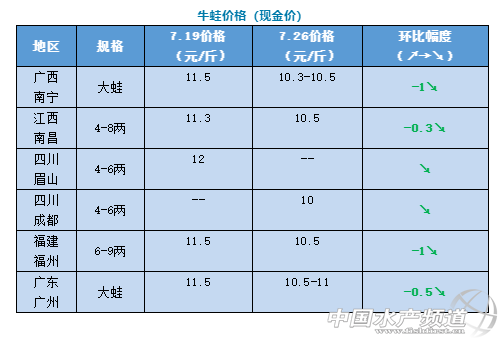 | 中國(guó)水產(chǎn)頻道原創(chuàng)報(bào)道, 牛蛙止跌回升,黑斑蛙價(jià)格穩(wěn)定 文/水產(chǎn)前沿陳曉慶 牛蛙行情 最近兩周牛蛙價(jià)格一路下滑,大蛙從最高的14元/斤跌至10元/斤,這讓不少養(yǎng)殖戶“蛙價(jià)破15”的愿望落空。而好消息是,近兩天牛蛙價(jià)格開(kāi)始出現(xiàn)回漲。 “現(xiàn)在現(xiàn)金價(jià)格有點(diǎn)亂”廣東收蛙商梁老板告訴筆者,今天廣州牛蛙現(xiàn)金價(jià)格10.5-11元/斤,而廣西相對(duì)要低一些,報(bào)價(jià)只有10.3-10.5元/斤。四川成都今天塘口報(bào)價(jià)只有10元/斤。而江西地區(qū)現(xiàn)金在10.5元/斤左右。目前牛蛙廠價(jià)維持在11.5元/斤左右,相比昨天上調(diào)了0.5元/斤。 目前有一些小規(guī)格的早蛙已經(jīng)開(kāi)始上市,海南新蛙大部分都在3-6兩左右,已經(jīng)達(dá)到了上市規(guī)格,而海南之外也有不少新蛙可以上市。另一方面,江西、安徽等地近期受暴雨的影響也使得養(yǎng)殖戶著急出蛙,這些都對(duì)市場(chǎng)造成了一定的沖擊。 近期新蛙已經(jīng)抓了一部分,過(guò)冬蛙也所剩不多,加上蛙價(jià)的接連下跌也突破了養(yǎng)殖戶的心理預(yù)期,開(kāi)始惜售,牛蛙價(jià)格出現(xiàn)反彈。據(jù)悉,現(xiàn)在大蛙、中大蛙都有漲價(jià),而小蛙沒(méi)有,市場(chǎng)上主要還是缺少大蛙。作為早蛙量最大的產(chǎn)區(qū),廣西目前過(guò)冬蛙基本上已經(jīng)賣完,早蛙至少要等到八月中下旬才開(kāi)始上市,大蛙有望迎來(lái)新一波的漲價(jià)潮,屆時(shí)蛙價(jià)會(huì)突破15元/斤么? |