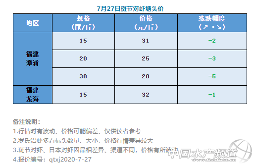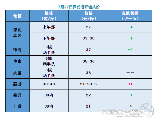 | 中國水產頻道原創報道, 本周斑節對蝦、羅氏沼蝦出現較大震蕩 文/水產前沿何鴻浩 一周要聞 1、整體蝦市均不景氣 近日,南美白對蝦塘頭價整體仍在低位,批發市場偶有“爆市”好消息傳出,但對價格的推動力也十分有限。顯然,作為對蝦風向標的白蝦不景氣,其余對蝦品種也沒辦法很好地獨善其身。 2、羅氏沼蝦下滑明顯 本周各地羅氏沼蝦價格下滑明顯,市場情況不佳,唯有高郵地區逆勢上漲。肇慶從業者表示,近期市場爛市,爛到一塌糊涂,有部分人都暫時歇業了。但并非只是消費市場的原因,同樣也跟流通從業者有關。近兩年,從事流通的人越來越多,小車也越來越多。往往這些幾百斤的小車因為資金壓力不大,經常低價拋售,更是加劇了市場亂象。 3、斑節對蝦大幅震蕩 |