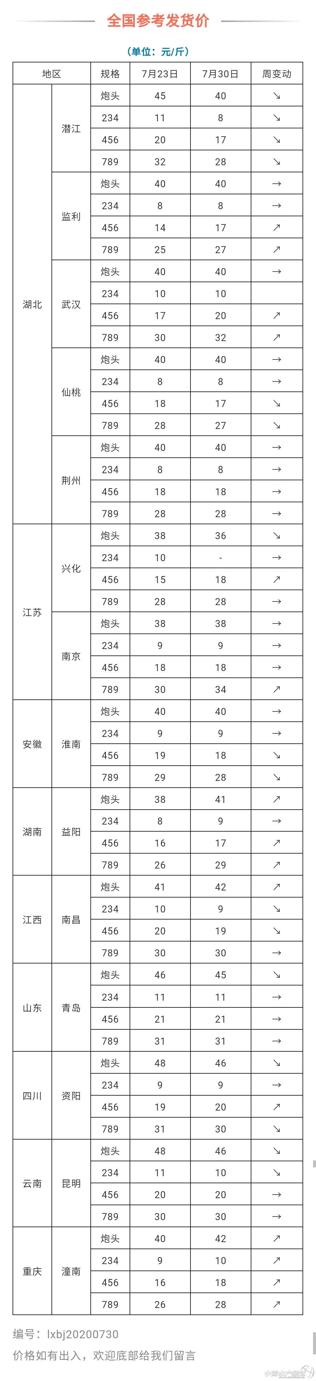 | 中國水產頻道原創報道, 水產前沿專業為你推送小龍蝦, 最新價格行情及行業新聞、各類資訊。 同時歡迎行業人士踴躍爆料。 最高40℃!水災還沒過,高溫又來搞事,這些問題不注意,塘頭可能要出大事情! 文/ 蝦蟹前沿實習編輯 曾鈴程 大太陽已經開始輪崗,未來一段時間長江流域中下游的養殖戶要警惕持續高溫的影響。據 中國天氣,預計未來幾天長江中下游集中降雨天氣將會減少,但是來自四川等地方的上游來水依然會給防汛帶來一定壓力。江淮、江南等地將轉為炎熱少雨模式,部分地區最高氣溫還將達到37~39℃,局部地區甚至可達40℃。 全國7月29日-31日氣溫變化 中央氣象臺 突然的氣候變化,非常容易引起水質的急劇變化。對蝦蟹養殖戶來說,有幾個問題需要警惕:首先是藍藻、裸藻的爆發,然后是水草的壞死、活力減弱。建議根據情況適當增加水位,加強解毒改底,然后培菌培藻,使用活菌進行維護。 從蝦蟹行情來講,螃蟹正是脫要脫第五殼的關鍵階段,這段時間的水質管理極其重要。而對于小龍蝦,從這段時間對部分地區的走訪得知,前段時間的水災直接影響了養殖戶在二茬蝦上的投入,沒有辦法進行養殖,所以未來階段市場供應可能還是精養塘和野捕蝦為主。雖然如此,可是疫情一波接一波,還是在一定程度上影響了小龍蝦的消費,所有對未來的龍蝦行情,還是應該持比較謹慎的態度。 編號:lxbj20200730 價格如有出入,歡迎底部給我們留言 部分塘頭收購價 湖北:中蝦(456錢)15塊/斤;大蝦(678錢)26塊/斤;兩蝦(炮頭)35塊/斤。 安徽:小蝦(123錢)5塊/斤;中蝦(456錢)10塊/斤;大蝦(789錢)19塊/斤。 四川:中蝦(456錢)18塊/斤;大蝦(789錢)28塊/斤。 注:編號lxbj20200730 價格如有出入,歡迎底部給我們留言 已上價格僅供參考,請以實際交易價格為準。交易有風險,下單需謹慎! |