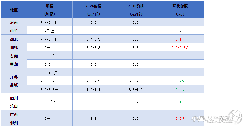 文/ 水產前沿 葉豐齊 2020年鮰魚行情走勢 一周要聞 中國水產頻道原創報道,日前有養殖戶反映,投放的260萬尾叉尾鮰水花,辛苦標成2000尾/斤規格,半小時能消耗掉7、8斤料,結果卻因為殺甲藻造成泛塘,一天之內基本全軍覆沒。“(叉尾苗)吃料很猛,并且沿塘都丟了搓成團的料,每餐有40多斤,現在估計沒有多少(存活)了,浮頭游邊還有點,不過滿塘都是死魚,估計差不多了,可能損失14、15萬元!”養殖戶悲痛地說。 高溫期間池塘溶氧不足是常態,若有甲藻更是會跟魚苗爭氧,不過一般都不建議輕易殺藻,因為死藻降解會在短時間內消耗大量水體溶氧,一旦控制不好便容易泛塘,造成悲劇。 據了解,出事的池塘有活水,而且配備了4臺增氧機,全天候開啟。養殖戶算是水產新人,一時不慎聽信他人錯誤的建議,導致如此結果,交的學費不可謂不重。“我當時再三(跟對方)確定有沒問題,他說沒問題,加上有點相信他,就干了這傻事。”養殖戶后悔莫及。 希望大家在高溫期慎用消殺類產品。 整體行情綜述 本周多產區鮰魚行情持平,部分地區價格略有波動,廣東已現漲價曙光;河南2斤上規格黑鮰和紅鮰價格皆與上周持平;湖北仙桃2斤上紅鮰上調0.1元/斤,黑鮰上調0.2-0.3元/斤;安徽地區2-3斤規格鮰魚到廠價保持;江蘇鹽城2.2-3.2斤(平均2.5-2.6斤)規格下調0.2元/斤,3.2-3.8斤(平均3.5-3.6斤)規格則下調0.4元/斤;四川樂山2.5斤上規格鮰魚價格下調0.1元/斤;廣西柳州3斤上網箱魚價格上調0.2元/斤,1.5斤上池塘魚上調0.2-0.3元/斤;廣東加工廠0.8-3斤規格價格保持,1.55-2.7斤規格上調0.4-0.5元/斤,市場1.2-3斤規格價格持平,肇慶0.8-3斤規格上調0.2-0.3元/斤元/斤,1.2-3斤規格價格不變,而中山、江門、臺山1.2-3斤規格皆與上周價格一致。 各產地行情分析 河南地區:作為疫情余波,新增病例讓北京、新疆等主要市場低迷,烤魚消費減少,對鮰魚需求下降,加上新魚存量較多,價格一直起不來,養戶普遍惜售觀望,行情暫時保持穩定。2斤上規格黑鮰主流塘頭價6.5元/斤,局部池塘2.8斤上規格塘頭價6.8-6.9元/斤,皆同上周價格;而1.8-2斤規格紅鮰5.6元/斤,同上周。 湖北地區:本地規格魚存塘量少,一塘可能只有1萬斤左右,價格低養戶惜售,而新魚普遍只有4兩,大的有1斤左右,加上高溫天氣出魚量不多,市場較為缺魚,價格稍有小漲。仙桃市2-4斤黑鮰塘頭價6.5元/斤,環比上周上調0.2-0.3元/斤,同規格紅鮰塘頭價5.5元/斤,環比上周上調0.1元/斤;3斤以上的水庫魚大約7.2-7.5元/斤。另外,部分業者投放的鮰魚水花(卵黃苗)因水災和暴雨遭受較大損失,可能需要補苗;有養戶表示拿回來4萬多尾水花已經死得差不多,準備在8月中旬補苗。據了解,目前3000尾/斤規格苗大約0.8元,500尾/斤規格苗0.08-0.09元,80尾/斤規格苗0.15元/斤,而7-8尾/斤大苗約6.5元。 安徽地區:巢湖加工企業仍大力收購,目前每天從安徽以及江蘇產區收購的叉尾鮰原料魚共25噸左右,2-3斤規格到廠價8元/斤,保持上周價格。 江蘇地區:新魚開始上市,而老魚還沒完全賣完,散戶都想盡快賣,出魚比較集中導致價格下調。走北京、山東市場的2.2-3.2斤(平均2.5-2.6斤)規格鮰魚約6.8-7元/斤,環比上周下調0.2元/斤;走西南西北地區的3.2-3.8斤(平均3.5-3.6斤)規格目前較為缺貨,價格相對比北京貨稍高一些,約6.8-7元/斤,環比上周下調0.4元/斤;不過,目前整體出魚量不算特別多,走北京和西南市場的貨源一天大概就15萬斤,比較能抗的養殖大戶拒絕出魚,因此后市行情應在0.5元區間上下浮動;若8月持續高溫或會引發一波上漲小高峰,但后期依然有爛市可能。另外,加工廠在江蘇地區以7.5元/斤的價格收購符合要求的規格魚。 四川地區:出魚量與流通量較同比去年減少。由于目前烤魚消費沒什么起色,加上四大家魚比較好賣,多少沖擊了鮰魚的市場需求,價格起不來、不劃算,養戶出魚積極性低,能壓塘的都不會賣。據悉,成都日流通量依然在15萬-18萬噸之間,本地消化之余,還供應川渝周邊次級市場,以及銷往貴州和云南。樂山2.5斤以上規格黑鮰成都貨塘頭價6.5(經銷商價格6.7元/斤),環比上周下調0.1元/斤,質量稍次、賣相較差(短粗、發紅、脫粘)的塘頭價6.2(經銷商價格6.5元/斤),同上周價格;走貴州和云南市場的超規格魚每天大概在1萬斤以內,價格比普通魚高0.5元/斤,塘頭價約6.9-7元/斤,因為存量不多,并無經銷商補價。 廣西地區:存塘規格魚少,市場缺魚行情上調,可能貴州、云南等地消費需求高,本地魚車頻頻造訪廣東拉魚補貨。柳州3斤上網箱魚9元/斤,環比上周上調0.2元/斤,貴港和欽州同規格皆同價;靠近貴州云南的百色、河池等地9.2元/斤,同上周;柳州1.5斤上池塘魚7元/斤,環比上周上調0.2-0.3元/斤,貴港同規格6.8元/斤,1.2-3.5斤規格南寧6.8元/斤,欽州6.6元/斤,北海6.5元/斤。切片廠收購1-3斤統價6.3元/斤,同上周,其中1.8-2.6斤規格必須超5成,1.8-2.6斤規格6.5元起,3成6.7元,4成6.9元,5成7.1元,6成7.3元,8成7.5元;要求極嚴,藥檢必須過關,病魚傷魚不要,無發紅,畸形、黃肉,黃邊扣款。 廣東地區:由于新魚暫時跟不上,市場開始缺魚,散戶魚不多,而且與大戶一樣惜售待價,據說許多魚車都抓不夠魚,估計后市行情將繼續上調,1.2斤上規格市場魚價格有望回到6.5以上。加工廠每天大約收購15萬斤,0.8-3斤統貨塘頭價6元/斤,保持上周價格,1.55-2.7斤規格開背魚7元/斤,環比上周上調0.4-0.5元/斤。市場方面,1.2-3斤規格6.2元/斤,同上周價格,每天可消化30萬斤左右,分別由廣