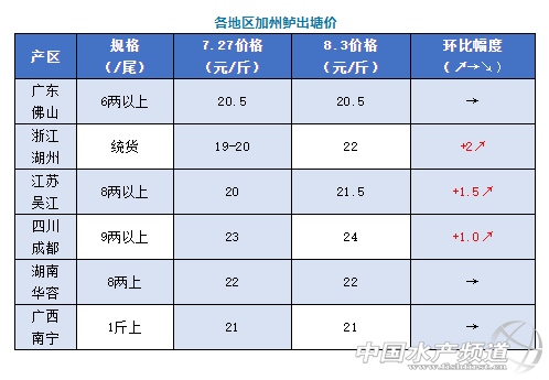 | 中國水產頻道原創報道, 文/圖 何氏水產、水產前沿 李靜 加州鱸 1、本周加州鱸老魚塘頭開塘價6兩以上與上周相比暫時保持穩定,還是20.5元/斤。當地存塘舊魚已經不多,而且存塘老魚規格都是偏大為主,僅沙頭產區還有部分老魚,目前老魚銷量不大,而且部分老魚都存在花身問題。目前反季節的新魚存塘產區主要在江門、四會為主,現在正在大量上市,魚頭大部分以1.2-1.3斤為主,1.5斤的魚頭比較少,6兩以上價格在19元/斤左右,最終成交價主要看魚頭大小還有0.8斤以下的成數決定。現在鱸魚銷量總體不多,反季節新魚大量上市,養戶在排隊出魚,按這樣態勢發展下去,預測本周鱸魚價格有所回落,銷量變化不大。 2、浙江湖州本周統貨報價22元/斤,比上周上漲了2元/斤。具體價格要看魚頭大小和規格成數而定,本地出魚量也不算很多,也就是附近城市客戶去拿貨和本地銷售為主。 3、江蘇吳江本周價格與上周相比上漲了1.5元/斤,8兩上報價21.5元/斤,9兩上報價22-22.5,價格會根據魚頭大小及規格比例多少略有調整。如果廣東鱸魚價格有所回落,吳江價格也會隨之下跌。 4、四川成都今天報價9兩上24元/斤,比上周上漲了1元/斤。本地存塘量已不多,出魚量少,本地銷售為主。 5、湖南華容本周價格保持穩定,8兩上報價是22元/斤,當地存塘量減少,養殖戶賣魚少。廣西南寧本周價格也保持穩定,報價21元/斤,近期氣溫較高,出魚量較少。 |