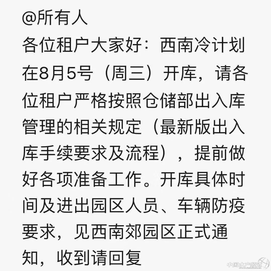 | 中國水產頻道原創報道, 文/ 海鮮指南(seafood-guide)李帥 8月3日晚間,海鮮指南收到業內人士消息稱,北京豐臺區西南郊肉類水產批發市場將于8月5日(本周三)正式解封冷庫,以下是通知原文: 各位租戶大家好:西南郊計劃在8月5號(周三)開庫,請各位租戶嚴格按照倉儲部出入庫管理的相關規定(最新版出入庫手續要求及流程),提前做好各項準備工作。開庫具體時間及進出園區人員、車輛防疫要求,見西南郊園區正式通知。 據悉,此次北京豐臺區西南郊肉類水產批發市場自7月30日起封庫,8月5日解封,歷時6天,是市場管理處在疫情防控常態化背景下,對市場進行常規的檢查、消殺工作。并非是有關政府文件強制要求西南郊市場封庫。 當日有商戶向海鮮指南表示,“事件應該問題不大,下達通知的時候是大家下班的時候,如果是突如其來的大事,應該會在白天上班所有人都在的時候把大家集中起來通知。所以能這么快就解封,我們也是很高興的! 據了解,西南郊市場在此次疫情防控中也高度重視,積極做好每日的防范消殺工作,嚴格控制人員進出,登記市場經營人員體溫。 而同處于豐臺區的新發地批發市場,自6月11日北京出現首例新冠肺炎本土確診病例后,一夜之間成為公眾關注的焦點。而據商戶介紹,新發地批發市場于6月13日宣布休市,如今尚未開門營業。但市場新建了一個便民市場,現在已經逐步恢復了部分經營業務。 資料顯示,新發地市場是我國最大的蔬果類批零市場,而目前新建的便民菜市場市場按照干濕分離的原,只經營蔬菜水果、米面糧油零售,下一階段逐步恢復牛羊肉、水產等零售服務。 市場工作人員介紹,作為新發地封閉區域,便民菜市場此前經過嚴格消殺以及全面的建筑改造。整棟建筑經過專業驗收,所有經營商戶也都進行了核酸檢測。便民菜市場安排專人,每天早中晚三次對市場內進行全覆蓋消殺,商戶每日結束營業后還要自行消毒,經檢查合格后方可離場。 |