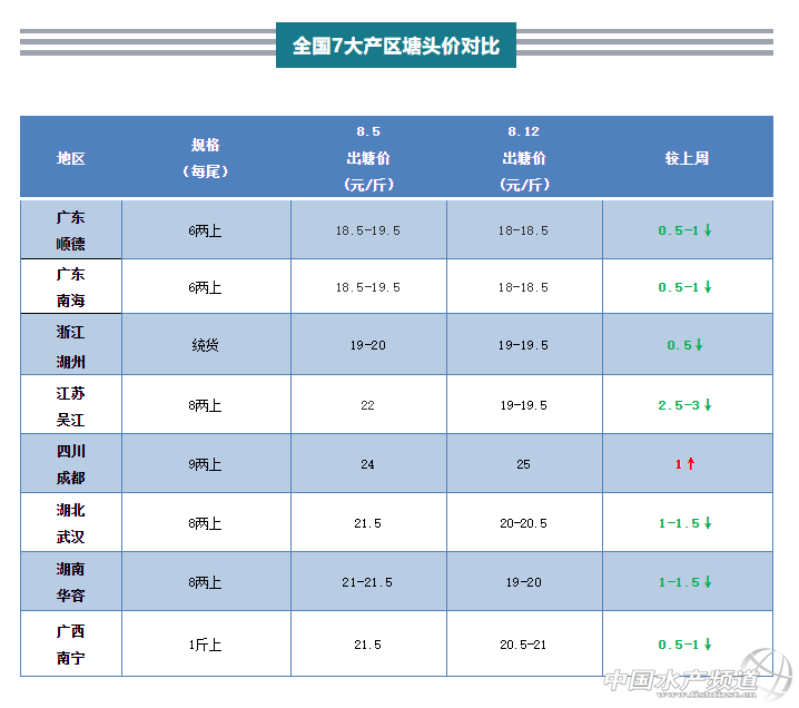 | 中國水產頻道原創報道, 魚價進一步下滑,廣東、江蘇養殖戶出魚積極,四川、湖北新魚即將上市 文/ 水產前沿實習編輯 殷騰蛟 圖/ 杰大飼料 一周行情綜述 過去一周,受廣東新魚影響,多地魚價繼續下滑,吳江8兩上標魚最高跌3元/斤,統貨價也跌了2-3元/斤左右。佛山老魚價格近期穩住了腳跟,與上周同期相比跌幅在0.5-1元/斤,兩地養殖戶目前出魚都比較積極,其余多個產區也都有不同跌幅。四川不降反升,上周四左右魚價達到25元/斤,至今維穩,當地也開始有小部分養殖戶出售新魚,預計本月下旬會有部分達9兩上規格的新魚上市,此外湖北或也將于本月底較大量地供應新魚。 主產區行情簡析、報價 廣東佛山:佛山6兩上舊魚報價18-18.5元/斤,較上周下降0.5元/斤,新魚價格在15.5-17元/斤,新魚實際塘頭價現場圍魚以魚頭大小和上車平均規格有所浮動。最近幾天舊魚的價格較為穩定,有養殖戶告訴筆者,沙頭地區舊魚接近100塘舊魚。目前部分養殖戶出新魚積極性比較高,出魚規格以6兩上為主,當地流通商也反映近期收魚量要較上周增加不少。 近幾日佛山地區高溫天較多,存塘老魚病害風險也加大,爛身、肝膽問題比較頻發。據反映,一塘魚多則幾百條,少則幾十條發病或是死亡。未來仍多有高溫,且伴隨著陰雨天氣,存塘管理要做足。 浙江湖州:湖州統貨19-19.5元/斤,較上周下跌0.5元/斤。當地存魚所剩不多,有部分流通商會選擇前往外省拉魚。 江蘇吳江:吳江八成統貨在17-18元/斤,8兩上19-19.5元/斤,標魚價格較上周下跌2.5-3元/斤。不過當地多以統貨形式出魚,價格也會視規格和魚頭大小有所調整。據當地魚中反映,目前市場需求減少,加之廣東新魚的沖擊,不少養殖戶擔心價格繼續下滑選擇出魚。 四川成都:成都9兩上報價25元/斤,比上周同期漲1元/斤。魚價高,所以銷量也有所下滑。不過當地飼料經銷商昨日告訴筆者,有養殖戶開始以24元/斤的價格出新魚,昨天走了4500斤左右,預計周五還有五六千斤要賣。有當地養殖戶透露,預計占全塘20%-30%的鱸魚會在本月20日左右達到9兩的上市規格。預計后市魚價上漲乏力。 湖北武漢:武漢8兩上報價20-20.5元/斤,較上周下跌1-1.5元/斤。有魚中告訴筆者,最近氣溫變高,走量也相應減少,而且新魚目前上市量還不大,出了幾趟就“斷檔”了,預計月底會有不少上市。 湖南華容:華容8兩上報價19-20元/斤,較上周同期下跌1-1.5元/斤。當地合作社負責人告訴筆者,近期市場走量不大,存塘魚也已不多。部分魚車會選擇南下廣東拉魚。 廣西南寧:南寧1斤上報價20.5-21元/斤,較上周下跌0.5-1元/斤。據悉,當地1斤上大規格鱸魚存塘不多,且近期受高溫影響,市場走量不大。 |