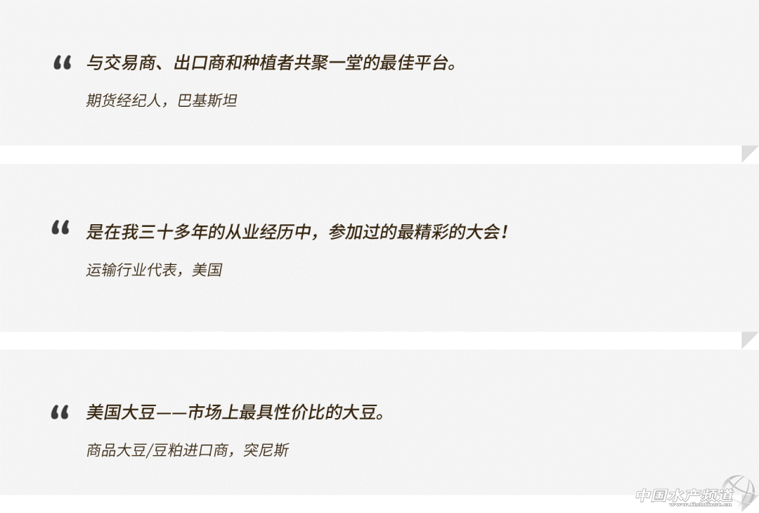 文章來源于美國大豆出口協會 ,作者USSEC 中國水產頻道報道,2020年8月24-27日,美國大豆出口協會(USSEC)與特種大豆及谷物聯盟(SSGA)將再度共同舉辦全球大豆貿易交流大會和特種谷物大會。去年的大會在芝加哥舉行,有來自全球50多個國家和地區的近800位大豆及谷物行業領袖、買家和供應商參會,中國更是派出了大宗商品大豆團和特種大豆團兩隊人馬。 今年,這一盛會將采取全新的線上形式,旨在為全球大豆產業從業者及采購商提供更為廣泛的參與機會。USSEC和SSGA將代表美國大豆種植者及美國大豆產業,邀請重磅嘉賓及行業專家,向全球大豆買家更新全球大豆的供需動態,并著重介紹美國大豆的卓越品質和可持續性;并了解大豆采購商的需求,確保美國大豆產業能通過持續創新,將為國際市場提供優質、可持續大豆產品的傳統代代相傳。 參會者都有誰? 美國谷物和油籽行業的出口商和負責農業經濟的相關官員 商品大豆和特種大豆及谷物的全球買家和貿易商 海運、鐵路及公路運輸、物流行業的企業代表和官員 糧食倉儲業的經理和主管 大豆加工商及相關設備制造商 種植者代表,各州及全國農業組織的領袖 各州及全國運輸與農業機構的政府官員 來自高校、運輸和農業研究機構的代表 大會關鍵詞:全球、創新、可持續 實時在線演講 主辦方邀請了在市場、經營和創新領域的優秀演講人和行業專家,為與會者帶來實時在線的主題演講和分組討論,這些互動議程還包括問答及問卷反饋環節。 按需點播回放 如果您因故無法參加某些場次的會議,可以后續進行回看。會議的錄像資料將保留30天。 云端會客室 GTE不僅是信息分享的大會,更是建立聯系、尋求商機的平臺。大會的云端休息廳能讓來自世界各地的與會者相互交流,您也可以邀請其他人進行一對一的會談。 數字貿易展位 GTE將設立線上的貿易展位,為參展公司提供展示產品和服務、與參會者建立聯系的機會。 大豆農場考察 GTE最受參與者歡迎的環節之一就是實地考察,包括參觀農場、糧倉和內河碼頭。今年,主辦方將這一環節移動到線上,您可以選擇考察線路,進行遠程參觀。 部分議題已經“劇透”,精彩值得期待! 如果您是有興趣采購美國大豆的海外買家,您可以申請免費參會的資格。步驟如下: 一,打開注冊鏈接(也可通過本文左下角“閱讀原文”直接跳轉) https://web.cvent.com/event/a1fc2f25-7701-4e4e-96a1-da34b13700f2/regProcessStep1:05cdf5a2-3f49-4c6a-918e-f58e7cbb40da 二,在“注冊類型(Registration Type)”中選擇“海外采購商” 三,在出現的提示中,點擊“Click here”,將彈出郵件發送窗口。請您在郵件中寫明您的姓名、公司名稱、公司地址及網址(如果有的話),以及您有興趣采購的美豆產品,發送給會議方。如果會議方認為您符合免費參會的要求,將郵件回復您免費注冊的參會碼。 如有任何問題,您也可以向我們留言詢問。 我們期待著與大家見面! 往屆參會者這樣評價GTE: 如果您是有興趣采購美國大豆的海外買家,您可以申請免費參會的資格。詳情可訪問大會網站gte2020.org,或直接點擊左下角“閱讀原文”進行注冊。您也可以向我們留言詢問會議相關事宜。 |