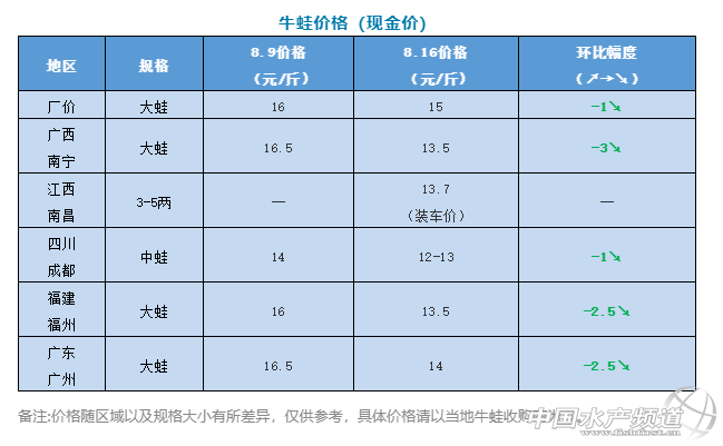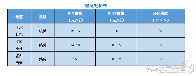 | 中國水產頻道原創報道, 從本周四開始,牛蛙價格開始出現下跌,而黑斑蛙價格也從上周日開始下滑,雙休日也不見漲 文/ 水產前沿 陳曉慶 牛蛙行情 “最近牛蛙跌價了,價格很亂!睆V東收蛙商告訴筆者,近幾天牛蛙開始跌價。 從8月初開始,牛蛙價格一路猛漲,不到半個月的時間塘頭價從10元/斤漲到了最高19元/斤。本周三牛蛙廠家收購價18-18.5元/斤,而周四就開始出現了轉折,價格下降了1元/斤。 截止至本周日,牛蛙主流廠家收購價15元/斤。福建福州大蛙報價13.5元/斤,廣東珠三角2-5兩蛙今天抓11元/斤,大蛙14元/斤。四川地區目前沒有大蛙,成都市場出塘價小蛙11元/斤,中蛙12-13元/斤。 據悉,目前廣東、海南已經有新蛙陸陸續續上市,最大規格達到了4-7兩,大部分在2-5兩、3-6兩規格。而廣西新蛙目前的量依然很少,預計要等到月底才能上市。澄海最早也要等到下個月才有早蛙上市。 即使新蛙大量上市了,短時間內也很少能夠有大規格的蛙補充市場,目前大蛙仍然處于缺貨狀態。“不跌價抓不到蛙,蛙價一直上漲養殖戶也不愿意賣”業內人士表示,除了新蛙上市,當前蛙價下跌另一方面也是為了刺激市場。而且大蛙的價格過高也很容易導致有價無市,不利于市場發展。 現在全國缺少大蛙,餐飲端也表示很無奈,只能用中小蛙代替,而不少消費者也反饋現在的蛙太小,跟年前相比的差距太大。 現在的牛蛙(左)和年前的牛蛙(右)對比 黑斑蛙行情 由于養殖戶扎堆出蛙,黑斑蛙價格本周也出現了下滑,這兩天黑斑蛙塘頭價5錢以上統貨10元/斤左右,7錢以上11元/斤,8錢以上12元/斤左右。 |