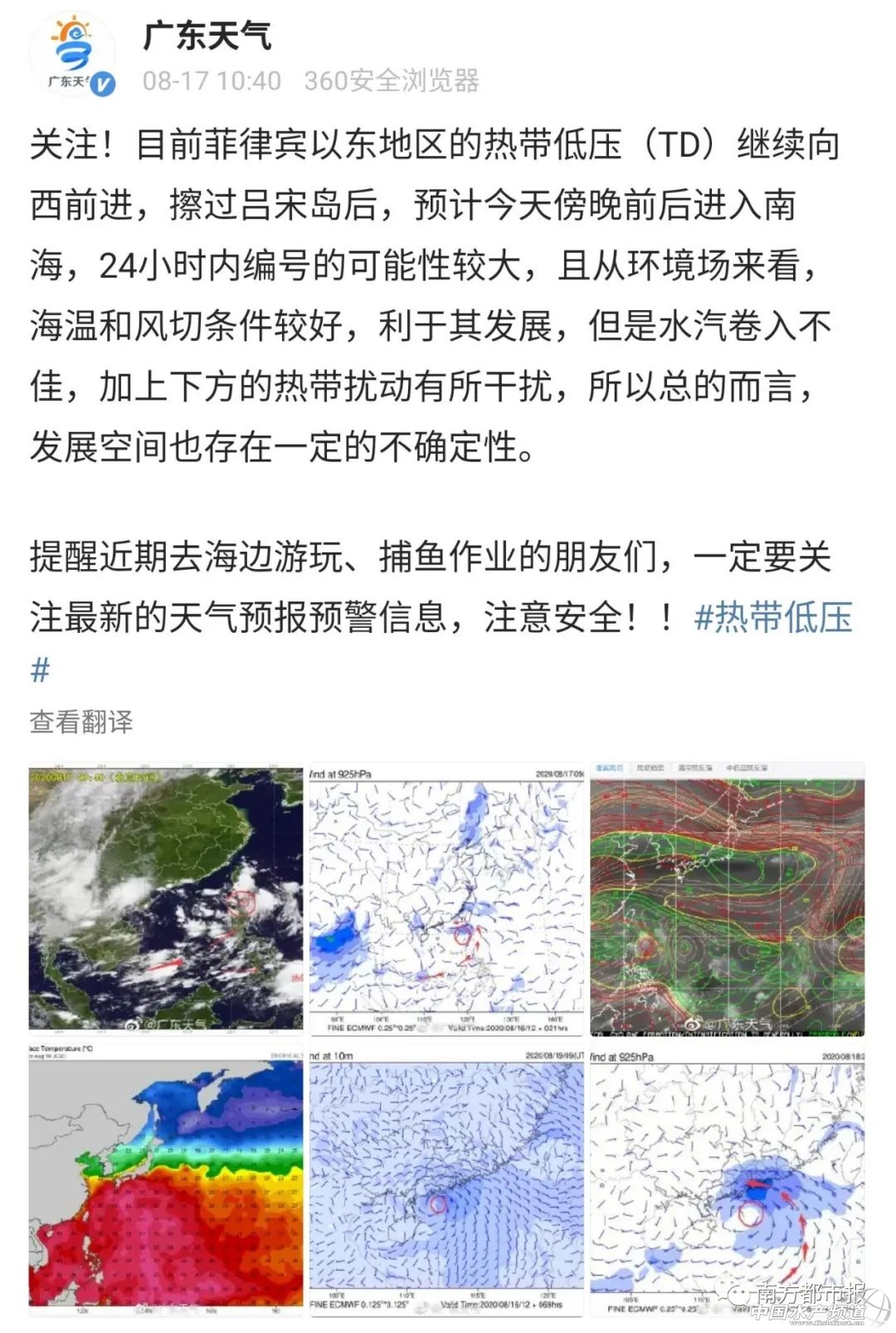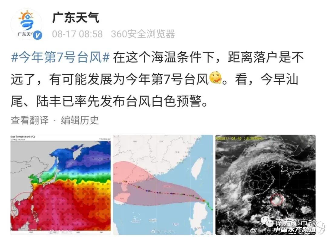 | 中國水產頻道綜合報道, 臺風即將襲擊廣東,華南三省注意狂風+暴雨+風暴潮 最強12級!今年第7號臺風"海高斯"今天生成 菲律賓呂宋島西北部近海有熱帶低壓活動,今天(17日)下午5點鐘其中心位于廣東省湛江市東偏南方大約1060公里的巴士海峽海面上,就是北緯19.4度、東經120.3度,中心附近最大風力有7級(15米/秒),中心最低氣壓為1002百帕。 預計,低壓中心將以每小時20-25公里的速度向西偏北方向移動,將于今天晚上移入南海東北部海面,之后強度逐漸加強,明天下午或夜間將發展為今年第7號臺風"海高斯",隨后逐漸向廣東西部到海南東北部一帶沿海靠近,并將于20日凌晨在上述沿海登陸(28-33米/秒,10-12級,強熱帶風暴級或臺風級)。 大風預報:預計,受熱帶系統影響,南海北部海域、瓊州海峽、北部灣將有6~8級、陣風9~10級的大風,其中熱帶系統中心經過附近海域風力可達9~11級、陣風12~14級。 暴雨預報:隨著7號臺風"海高斯"逐漸靠近華南沿海,廣東海南廣西等地的雨勢將迅速加強,8月19日前后可能出現較大范圍的暴雨-大暴雨。 這樣一來,南海上的臺風海高斯將截流輸送到我國四川盆地內的海洋水汽,因此雖然華南雨將加強,但四川盆地一線的猛烈暴雨區降雨其實是將隨之減弱的,從這個角度上說,對于目前暴雨傾盆防汛防洪壓力巨大的四川多地而言,未來臺風海高斯的出現其實還是好事。 廣東多地已掛臺風預警!注意暴雨+大風+巨浪 周一返工日 廣東各地依舊熱熱熱 粵東粵北的不少地區 高溫黃色預警生效中 最新消息! 今年第7號臺風 或將在24小時內 生成并“上戶”! 它正向廣東靠近 本周將帶來風雨 中央氣象臺今天(8月17日)上午10時繼續發布熱帶低壓預報: 菲律賓呂宋島北部近海熱帶低壓的中心今天(17日)上午8點鐘位于廣東省湛江市東偏南方大約1250公里的海面上,中心附近最大風力有7級(15米/秒),中心最低氣壓為1002百帕。 預計,低壓中心將以每小時20公里左右的速度向西偏北方向移動,將于今天(17日)晚上移入南海東北部海面,之后強度逐漸加強,將于明天(18日)發展為今年第7號臺風,爾后逐漸向廣東西部到海南東北部一帶沿海靠近,并將于本周四(20日)凌晨到上午在上述沿海登陸(28-33米/秒,10-12級,強熱帶風暴級或臺風級)。 降雨影響 周二(18日)夜間-周四(20日),粵西市縣和江門有暴雨到大暴雨,珠江三角洲南部市縣和汕尾有大雨到暴雨。 大風影響 受其影響—— 17日,巴士海峽、南海東部海面有7級~9級大風; 18日,廣東海面風力加大到6級~8級,南海中北部海面、巴士海峽風力8級~9級,陣風10級~11級; 19日-20日,南海中北部海面、廣東海面、瓊州海峽風力9級~11級,陣風12級;其中19日珠江口內河面有6級~8級大風。 南海預報中心: 國家海洋局南海預報中心10時發布海浪消息:受熱帶低壓的影響,預計8月18-20日,南海北部海域將出現一次巨浪到狂浪過程,廣東西部近岸海域將出現一次大浪以上過程。請海上作業船只和沿岸有關單位提前做好防浪避浪措施。 截至今天(17日)中午 廣東已有7個站點 惠東、汕尾、海豐、陸豐 臺山、陽江、陽西 發布 白色臺風預警 正值暑假 有出游打算的朋友 請注意臺風預報 及時調整行程! 切勿在臺風天下海玩水 廣東各地剛剛開漁 請漁民朋友們注意臺風預報 合理安排捕魚作業 及早歸港避風 臺風帶來的強降水容易引發 城鄉積澇、山洪、 泥石流、山體滑坡等災害 請各單位和所有市民 密切關注 廣東各地天氣收好 ↓↓ 廣州 廣州天氣:本周雷雨頻繁,周三周四有中雷雨局部大到暴雨[下雨],要注意防御局地短時強降水、雷雨大風等強對流天氣。 降水集中時段:周二(18日)午后至周四(20日)早晨 過程累積雨量:40-80mm,局部超過120mm,中南部更明顯 風力增大時間:周二(18日)夜間至周三(19日)上半夜,港區6-8級、陸地4-6級 深圳 深圳天氣:周一周二有(雷)陣雨,局部雨勢較大;周三周四局部有暴雨,伴有7-9級大風;周五到周日有雷陣雨。雨雨雨的一周要來了,你們做好準備了嗎? 湛江 湛江天氣:本周三(19日)到周四(20日),湛江有暴雨到大暴雨,雷州半島東西部海面、北部灣北部海面、瓊州海峽海面風力8到9級,陣風11級。 其他地市 希望即將生成的7號臺風 能給大家帶來清涼 不要帶來災害損失 再次提醒本周計劃前往粵瓊沿海 及海邊作業的朋友們 請及時了解天氣變化 |