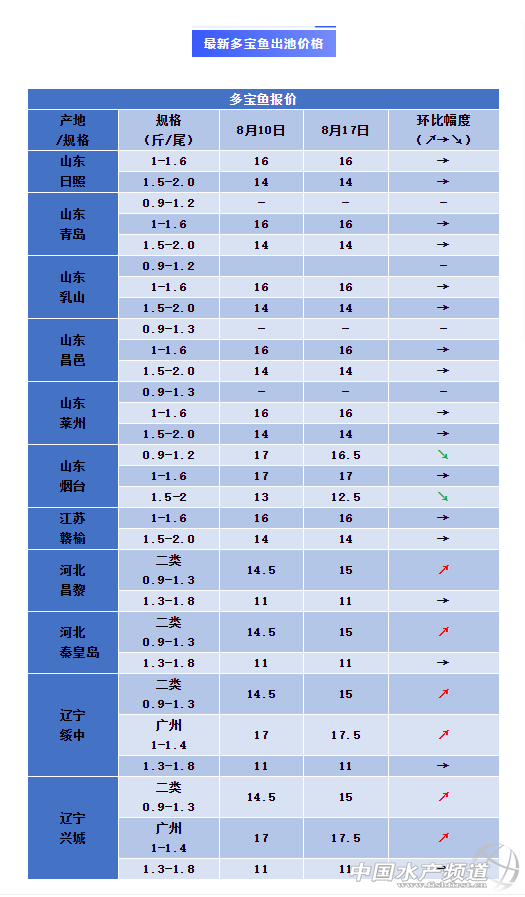 | 中國水產頻道原創報道, 一周多寶魚價格播報及行情解析 文|工業化水產圈實習編輯葉繼良 多寶魚一周行情簡析 8月15日,在出現一名員工為新冠肺炎確認病例之后,深圳盒馬宣布暫停當地21家門店營業,進行全面消殺,同時為所有深圳盒馬員工和生鮮商品進行核酸檢測。深圳盒馬關停之后,隨即引發連鎖反應,據流通商透露山東多寶魚走量同比上周減少約一成。近一個月來,多地市場來自厄瓜多爾生產的凍蝦外包裝上檢測出新冠病毒,一方面海鮮市場面臨停業整頓,勢必會造成整個養殖產業鏈的波動,另一方面老百姓對海鮮存疑導致消費力下降,價格持續低迷,多寶魚也滯銷,養殖戶被迫存魚。 上周多地魚價又走低,所幸本周山東區域價格已經止跌走穩,河北和遼寧區域二類標魚價格更有所回升。據了解,由于目前市場價格低迷,養殖戶大多不愿意出魚,存魚量太大,也不利于魚價上漲;另一部分養殖戶則處于觀望狀態,待價格回暖;小部分養殖戶由于資金緊張,遇到交電費或催欠款時,即使魚價低也會先出一部分。 據悉,現在有流通商收大規格魚(1.5-2.5斤/尾)后冷凍起來,靜待行情好了以后再賣,但是多寶魚消費一般以活鮮為主,凍魚按照活魚價格收,出售價格卻不如普通活魚。目前東北收凍魚的價格在11元左右/斤。業內人士表示,雖然市場對活魚的認可度更高,活魚價格高于冰鮮,但是現在魚價低迷,凍起來是沒有辦法的辦法。他認為在考慮冷凍保存時,也要考慮其中的投資成本,以及未來的價格走向。2020年已經到達8月中,多寶魚價格只短暫的有過高價,而下半年的價格仍不容樂觀,養殖戶還需放好心態,靜待風雨之后的彩虹。 |