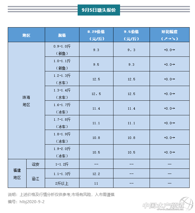 | 中國水產頻道原創報道, 一周海鱸價格播報與行情分析 文/ 水產前沿 實習編輯 魏鈺娟 養好魚,更要賣好魚 全新海鱸魚行情解析 水產前沿與您相約每周六 感謝進才水產供圖 一周行情分析 珠海:本周珠海海鱸水車、冰車價格穩定。僅剩少數塘口有舊魚存塘,預計一周左右將全部出完。新舊魚市場銜接順利,沒有出現較大的價格波動,市場相對較平穩。本周新魚0.9-1.1斤規格報價9.3元/斤,與上周持平;水車1.2-1.4斤規格報價12.5元/斤,與上周持平;本周冰車1.6-1.7斤規格報價11.4元/斤;1.7-1.8斤規格報價11.1元/斤;1.8-1.9斤規格報價10.8元/斤;1.9-2.0斤規格報價10.5元/斤。目前新魚規格均在1斤左右,新魚已全面上市。 海鱸新魚,感謝珠海容川飼料有限公司供圖 |