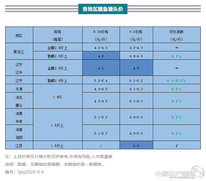 | 中國水產頻道原創報道, 本周各主要養殖區鱗鯉價格較為穩定,部分地區小幅下降 文/ 水產前沿 實習編輯 薛曉強 代表產區鯉魚行情走勢 整體行情綜述 本周鱗鯉價格穩定,主要養殖區塘頭價格均無大幅變動。其中遼寧、黑龍江地區鱗鯉價格均與上周相同,天津、河北唐山和河南均有0.2元/斤的小幅下降。鏡鯉價格平穩,遼寧地區小幅下降0.1-0.2元/斤,黑龍江地區下降0-0.1元/斤。 本周各地區鯉魚行情一覽 遼寧地區:雖然新魚還在持續大量出塘,但是由于市場充足,遼寧鱗鯉價格已連續兩周保持穩定。本周2.5斤上規格鱗鯉價格4.5元/斤,1.5斤規格的小鯉魚4.2-4.3元/斤,價格均與上周相同,遼寧鱗鯉目前已基本保持穩定,如無特殊情況,不會出現大幅變化。本周遼寧地區2.5斤上規格鏡鯉5.1-5.2元/斤,環比下降0.1-0.2元/斤。 黑龍江地區:本周黑龍江地區鱗鯉價格平穩,2.5斤上規格鱗鯉4.2-4.3元/斤,與上周相同。鏡鯉價格也相對平穩,2.5斤上規格鏡鯉4.8-4.9元/斤,環比下降0-0.1元/斤。 天津和河北唐山地區:由于現在新魚已達規格,部分養殖戶著急出魚節約成本、回籠資金,本周天津和河北唐山地區鱗鯉價格出現小幅下降。本周天津和河北唐山1.8斤上規格鱗鯉4.1-4.3元/斤,環比下降0.2元/斤。 河南地區:由于新魚持續上市,本周河南地區鱗鯉價格小幅下降。本周河南1.5斤上規格鱗鯉4.9-5.0元/斤,環比下降0.2元/斤。 |