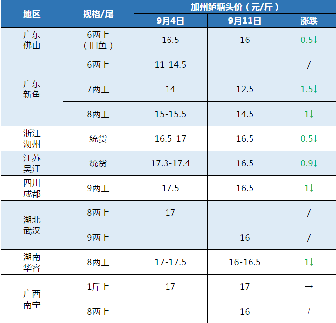 文/圖 鱖鱸前沿 許鈺淇 本周行情 中國水產(chǎn)頻道原創(chuàng)報道,佛山地區(qū)老口魚六兩價格16元/斤,較上周16.5元/斤下調(diào)0.5元,但與本周三價格相比維穩(wěn)。最近出現(xiàn)花身魚的情況較多,會遭壓價。外圍的新魚流通規(guī)格在7兩上至8兩上偏多,新魚成本多在6-7元/斤,外圍地區(qū)(江門 、四會三水)新魚7兩上價格12.5元/斤,8兩上價格14.5元/斤,目前外圍新魚上市規(guī)模較大,有外省水車過來抓魚。 目前吳江老口大統(tǒng)貨價格16.5元/斤,較上周價格下調(diào)0.9元/斤,比本周三大統(tǒng)貨16元/斤回漲了0.5元/斤。按照秋苗算,現(xiàn)在吳江外圍地區(qū)(外圍如蘇州、南京、無錫、揚州等地新魚即將上市)魚規(guī)格在6到8成之間。但是外圍規(guī)模不大,外圍裝完之后就會回到菱湖。 湖州統(tǒng)貨價格16.5元/斤,菱湖新口魚開始陸續(xù)上市,新魚7成價格15元/斤,預計本次菱湖出魚之后外圍價格便會下跌。 成都9兩上16.5元/斤,較上周價格下調(diào)1元/斤,較本周三價格維穩(wěn)。今年生產(chǎn)區(qū)增加了一些(綿陽、德陽、樂山),新增地區(qū)的養(yǎng)殖戶出魚會稍晚,現(xiàn)新魚出魚集中在新津、大邑、崇州。今年由于疫情原因,上半年消費市場受到影響,雖現(xiàn)在逐步恢復中,不過現(xiàn)階段市場上走量少,且川渝地區(qū)喜好大規(guī)格魚,不達8兩規(guī)格較難出魚。 武漢9兩上價格16元/斤,較本周三價格跌落0.5元/斤。現(xiàn)湖北地區(qū)新魚規(guī)格都比較適合,但是流通商還會到廣東抓魚。 華容魚價跟江蘇,廣東比起來價格是較高的,現(xiàn)在老口魚價格較上周下調(diào)1元/斤,掉到16元/斤,有的水車還要求9兩開撿,而且老口魚現(xiàn)存量少,最近天氣好,新魚開始逐步上市,估計新魚正式上市帶來的市場沖擊不小。 廣西市場上流通的魚規(guī)格普遍在8兩上、1斤上規(guī)格之間,現(xiàn)1斤上價格還是維穩(wěn)在17元/斤,8兩上價格16元/斤,養(yǎng)殖戶出魚熱情高。 7大產(chǎn)區(qū)加州鱸塘頭價對比 編號:jzlbj2020-35/09-11 注:上述價格及行情分析僅供參考,市場有風險,入市需謹慎。 |