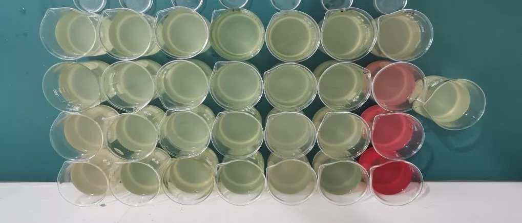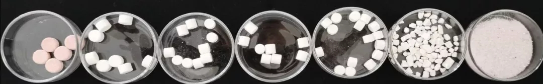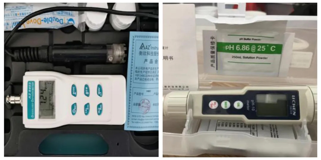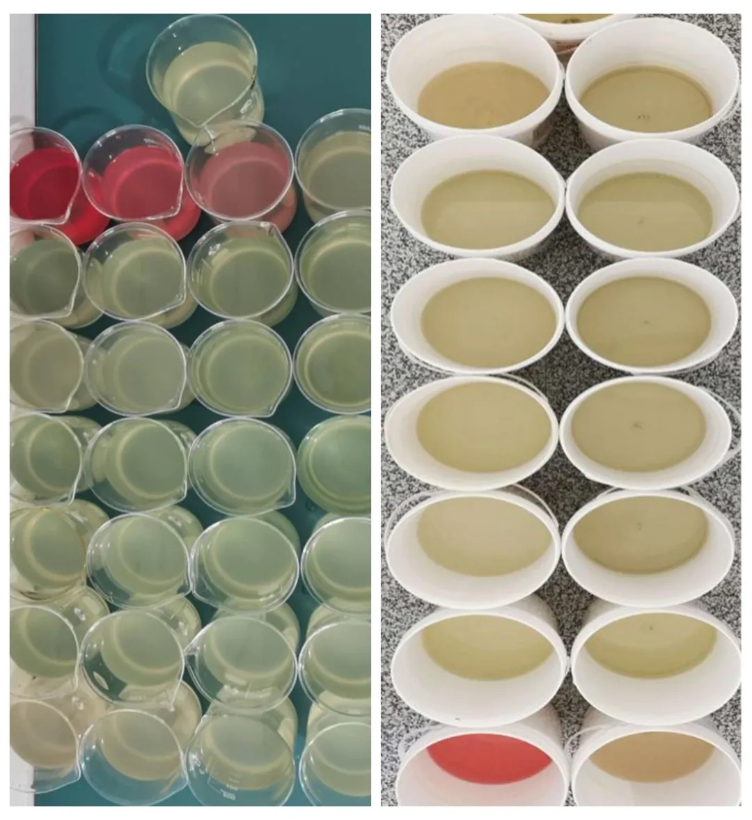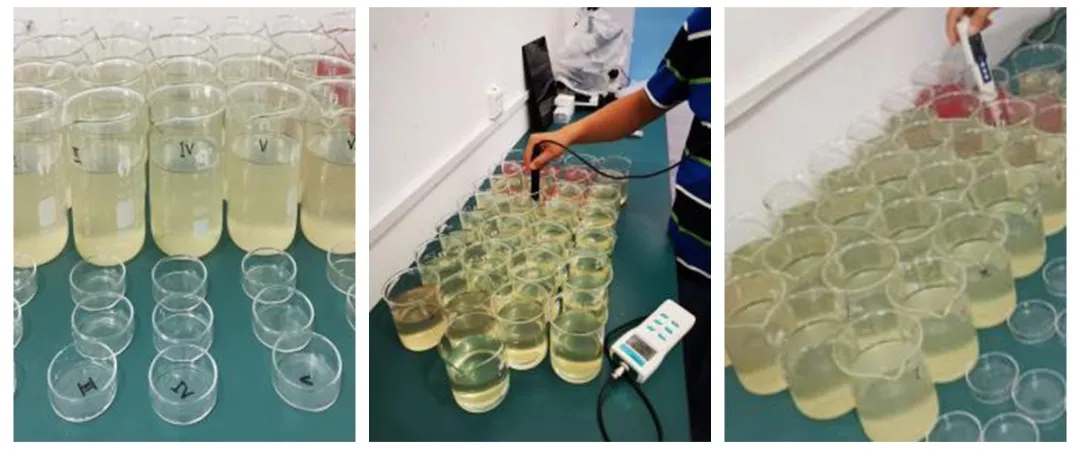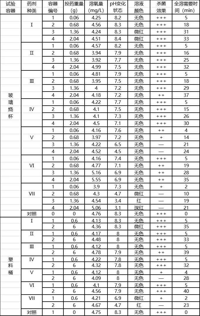 | 中國水產頻道原創報道, 單過硫酸氫鉀復合鹽制劑對養殖池水理化狀態影響與消毒效果觀察 文/圖 華中農業大學 陳昌福、武漢科研時代生物技術有限公司 周鑫軍 摘要:將不同企業生產銷售的7種單過硫酸氫鉀復合鹽制劑,按照不同劑量投放在養殖池水中后,觀察和檢測養殖池水中的溶解氧、pH、水體顏色、制劑在水體中溶解速度以及對養殖池水中可培養細菌殺菌效果的變化,初步評價了這類產品對養殖池水理化狀態影響及其對養殖水體中細菌的殺菌效果。試驗研究結果表明,在我國市場上銷售的單過硫酸氫鉀復合鹽制劑,可能是因為不同制售企業的產品配方、生產工藝等的不同,導致這類產品的質量參差不齊,按照產品說明中標明的最高劑量使用,也不能顯示出殺滅養殖池水中可培養細菌的殺菌效果。此外,由不同生產企業推出的單過硫酸氫鉀復合鹽制劑產品包裝袋上印制的產品使用說明書內容,是十分混亂、五花八門的,這種表述混亂的產品說明書,也可能是導致該產品使用者,難以清楚地了解和判斷單過硫酸氫鉀復合鹽制劑的實際作用與應用效果。 關鍵詞:單過硫酸氫鉀復合鹽;制劑;養殖池水;理化狀態;殺菌效果 在目前我國水產養殖用物質中,單過硫酸氫鉀復合鹽制劑作為一種被人們賦予“改底、調水”功能的化學制劑,是使用量比較大的一種水產養殖用物質。根據相關資料介紹,單過硫酸氫鉀復合鹽制劑是一種無機過氧化物,也稱為過一硫酸氫鉀,它與硫酸氫鉀、硫酸鉀結合成三合鹽的形式存在。因此,通常將其稱之為單過硫酸氫鉀復合鹽。復合鹽的分子式為2KHSO5·KHSO4·K2SO4,分子量為614.7。 據說,由于單過硫酸氫鉀復合鹽制劑溶于水后釋放活性氧[O],并通過高能活化劑經由鏈式反應而產生各種高能量、高活性的小分子的自由基、新生態原子氧、氧自由基、羥基自由基(·OH)、硫酸自由基(SO4−·)等多種活性成分,從而成為高效氧化消毒劑,具有廣泛殺滅微生物作用,包括細菌、芽胞、病毒、真菌等給水水體及給水管網中耐氯性細菌的滅活。 單過硫酸氫鉀復合鹽制劑溶于水后釋放硫酸自由基,硫酸根自由基標準氧化電位E0=2.5~3.1,可氧化某些羥基自由基E0=2.80,不能氧化的有機污染物,將其分解為水、二氧化碳以及簡單無機物,降解殘留農藥、重金屬,解決化學污染引起的急慢性中毒問題。因此,據說該化學制劑具有分解有機污染物的功能。 在水中藻毒素自然降解過程十分緩慢,當水中的含量為0.005mg/L,3天后僅有10.0%被水體中微粒吸收,7.0%隨泥沙沉淀。藻毒素具有很高的耐熱性,加熱煮沸都不能將其毒素破壞,也不能將其去除,自來水常規處理工藝(混凝沉淀、過濾、消毒)無法有效去除水中的藻毒素。而有大量的文獻及現場實驗,都表明單過硫酸氫鉀復合鹽制劑能夠有效去除藻類及分解藻毒素。因此,人們認為該化學制劑具有除藻類及分解藻毒素的功能。 正是在文獻中介紹這種產品具有上述如此眾多優異的功效,部分制售企業在其宣傳資料中甚至將這種產品鼓吹為“第五代消毒劑”。 本試驗觀察了將定量的單過硫酸氫鉀復合鹽制劑投放在不同容量的養殖池水中,通過檢測供試養殖池水中溶氧量、pH變化狀態,以及采用培養法檢測其對養殖池水中可培養細菌的殺菌效果,對這類產品進行了初步的評價。 1.材料與方法 1.1供試單過硫酸氫鉀復合鹽制劑 在本次試驗中,選用由不同生產企業制備的7種過硫酸氫鉀片劑、顆粒劑和粉劑(圖1)。 圖1,用于本試驗的不同公司制售的單過硫酸氫鉀復合鹽制劑 其狀態和顏色如圖2所示。全部供試單過硫酸氫鉀復合鹽制劑是從武漢市新洲區汪集鎮漁藥銷售點采購到的。由湖北省某公司生產的“Ⅰ號片劑”(單片均重:1.38g,未標注主成分含量)、由湖北省某公司生產的“Ⅱ號片劑”(單片均重:1.28g,標注含量:20.0%)、由重慶市某公司生產的“Ⅲ號片劑”(單片均重:0.95g,未標注主成分含量)、由江蘇省某公司生產“Ⅳ號片劑”(單片均重:0.86g,未標注主成分含量)、由廣東省某公司生產的“Ⅴ號片劑”(單片均重:0.68g,標注含量:20.0%)、湖北省某公司生產的“Ⅵ號顆粒劑”(未標注主成分含量)、上海市某公司生產的“VII號粉劑”(標注含量:50.0%)。 依次:Ⅰ號片劑、Ⅱ號片劑、Ⅲ號片劑、Ⅳ號片劑、Ⅴ號片劑、Ⅵ號顆粒劑、VII號粉劑 圖2,供試過硫酸氫鉀片劑、顆粒劑和粉劑的狀態和顏色 1.2供試養殖池水來源與容器 用于本試驗的養殖池水,均為取自武漢市新洲區汪集鎮魚苗孵化場的養殖池同一取樣點相同深度的池水。將供試容器在養殖池塘水體中清洗干凈后,供作本試驗中的盛裝養殖池水的容器。 在容量為500.0mL的玻璃燒杯中,每個燒杯中盛裝養殖池水400.0mL;在容量為20.0L的塑料桶中,每個塑料桶中盛裝養殖池水4.0L(圖3)。試驗期間水溫變化在27~28℃的范圍內。 A.容量為500.0mL的燒杯 B.容量為20.0L的塑料桶 圖3,本試驗中盛裝養殖池水的各種規格容器 1.3單過硫酸氫鉀復合鹽制劑在養殖池水中的投放量 將本試驗采用的7種單過硫酸氫鉀復合鹽制劑,在每個盛有400.0mL養殖池水的燒杯中,分別投放0.06g、0.68g、1.36g和2.04g單過硫酸氫鉀復合鹽制劑為1個試驗組,共設置7個試驗組和1個不投放單過硫酸氫鉀復合鹽制劑的對照組。在每個盛有4.0L養殖池水的塑料水桶中,分別投放0.60g和6.00g單過硫酸氫鉀復合鹽制劑為1個試驗組,共設置7個試驗組和1個不投放單過硫