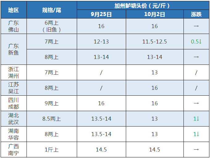 文 鱖鱸前沿 許鈺淇 本周行情 中國(guó)水產(chǎn)頻道原創(chuàng)報(bào)道,廣東佛山:本周佛山地區(qū)6兩老口魚(yú)的價(jià)格為16元/斤,新魚(yú)7兩11.5-12.5元/斤,新魚(yú)8兩13-14元/斤,具體定價(jià)需看魚(yú)頭大小。業(yè)內(nèi)人士透露,目前市場(chǎng)加州鱸的供應(yīng)較充足,國(guó)慶中秋長(zhǎng)假拉動(dòng)消費(fèi),也是目前魚(yú)價(jià)止跌的原因。近來(lái)魚(yú)價(jià)一直不變,但是走量明顯增多,大規(guī)格魚(yú)仍搶手。 浙江湖州:7兩挑條子13元/斤,8兩挑條子價(jià)格13.5-14元/斤,統(tǒng)貨11-12元/斤,菱湖新魚(yú)上市規(guī)模逐漸擴(kuò)大,新魚(yú)的普遍成數(shù)為5、6成,炮頭魚(yú)在1斤2左右。7兩規(guī)格的魚(yú)價(jià)較本周三下調(diào)0.5元/斤,主要是菱湖新口魚(yú)上市帶來(lái)的沖擊影響,預(yù)計(jì)后市價(jià)格持續(xù)下行,天氣轉(zhuǎn)涼,水車計(jì)劃下廣東抓大規(guī)格魚(yú)。 江蘇吳江:老魚(yú)8兩上報(bào)價(jià)16元/斤,菱湖新魚(yú)上市對(duì)江蘇魚(yú)價(jià)有一定影響,預(yù)計(jì)后市江蘇魚(yú)價(jià)會(huì)跟著菱湖的價(jià)格波動(dòng)。 四川成都:9兩上價(jià)格16元/斤,較上周價(jià)格保持不變,最近由于流通備貨,魚(yú)價(jià)較穩(wěn)定。 湖北武漢:8兩半起抓,價(jià)格13元/斤,價(jià)格較上周五下調(diào)0.5-1元/斤,較本周三價(jià)格保持不變,武漢價(jià)格下調(diào)也是因當(dāng)?shù)匦卖~(yú)上市集中。 湖南華容:8兩起抓,價(jià)格13元/斤,較上周五價(jià)格下調(diào)0.5-1元,較本周三價(jià)格保持不變,據(jù)當(dāng)?shù)亓魍ㄉ谭答仯帐袌?chǎng)走量有提升。 廣西南寧:1斤上價(jià)格14.5元/斤,當(dāng)?shù)仞B(yǎng)殖戶出魚(yú)積極。 7大產(chǎn)區(qū)加州鱸塘頭價(jià)對(duì)比 編號(hào):jzlbj2020-38/10-02 注:上述價(jià)格及行情分析僅供參考,市場(chǎng)有風(fēng)險(xiǎn),入市需謹(jǐn)慎。 |